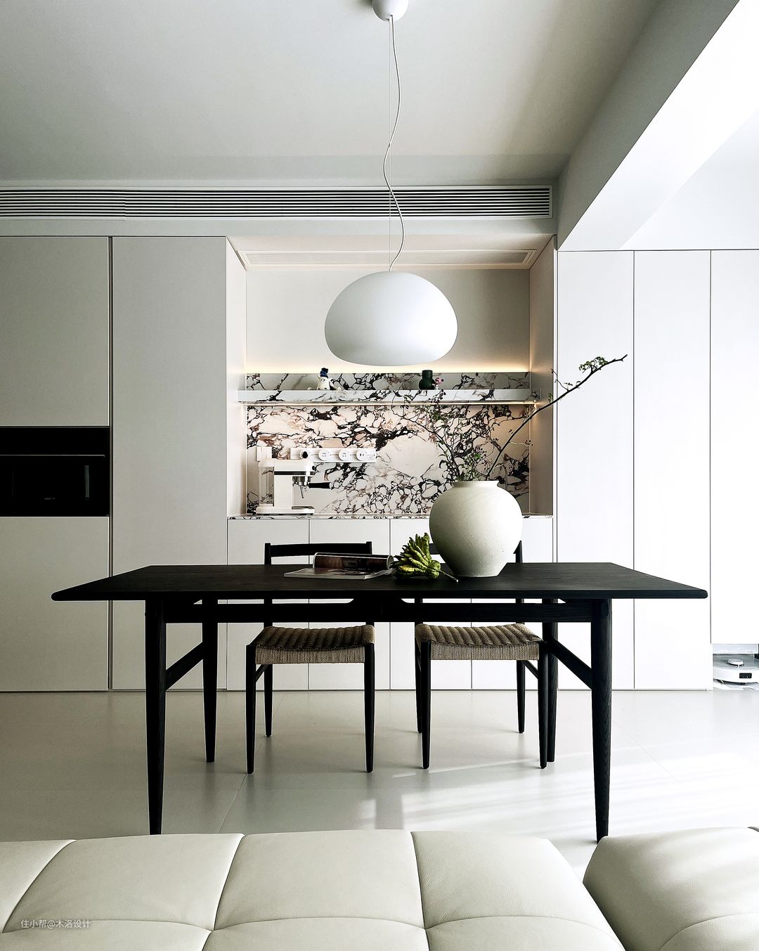 在空间布局上,餐厅与客厅融为一体,打造出一个宽敞而通透的空间。餐厅区域配备了复古风格的餐桌椅,线条简洁而优雅,餐边柜上的宝格丽大理石瓷砖,彰显出一种低调的奢华。