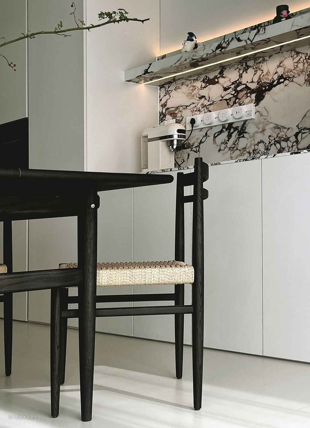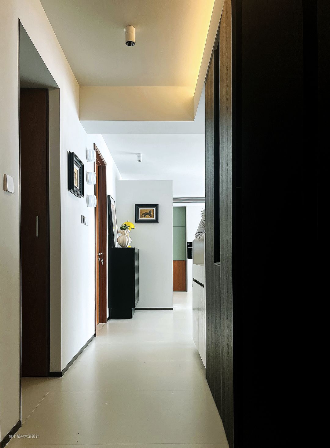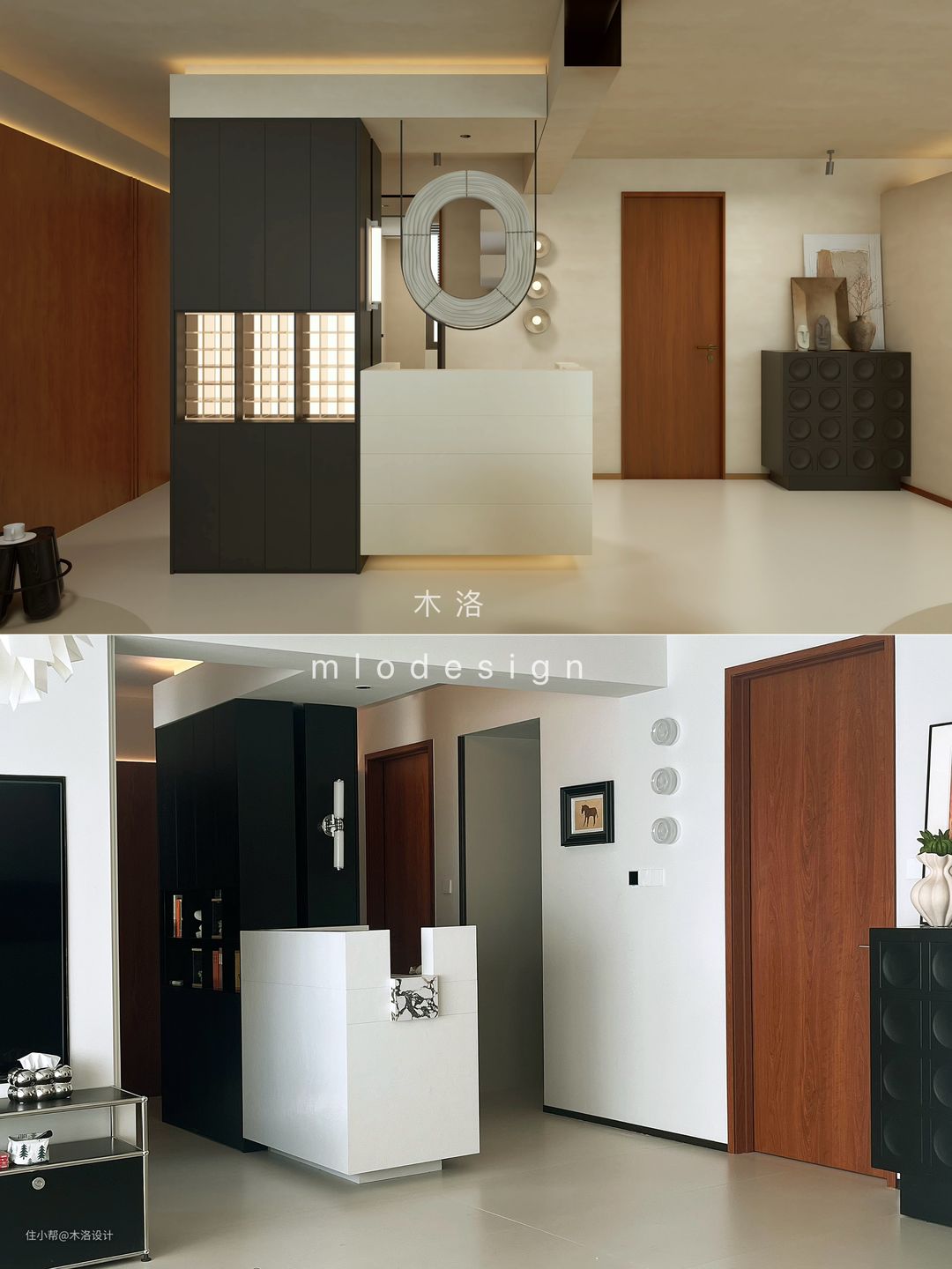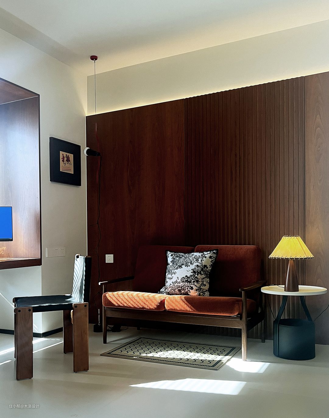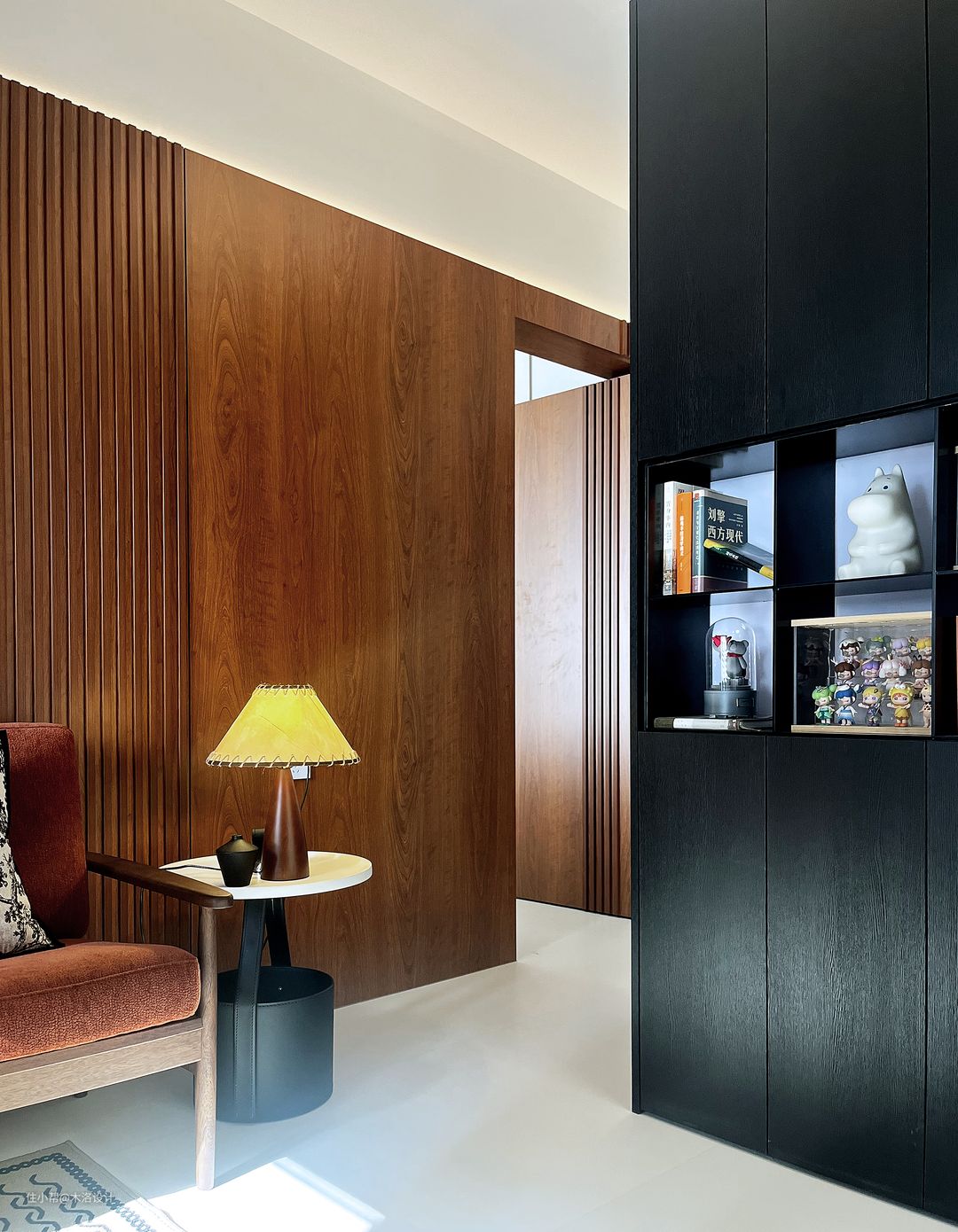 我们把客卫的干区移到了走廊,把原来干区位置做成了洗衣房,颜色樱桃木、黑色纹理硬包和浅咖色乳胶漆搭配,非常和谐,把中古风的氛围感营造到极致。