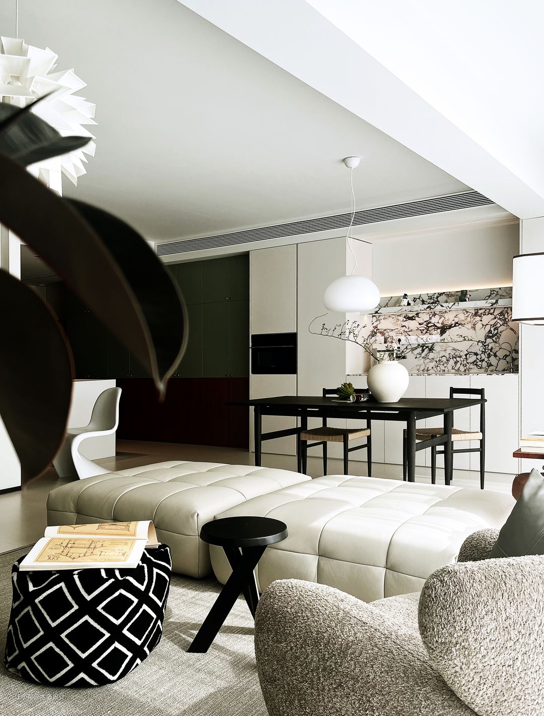 在空间布局上,餐厅与客厅融为一体,打造出一个宽敞而通透的空间。餐厅区域配备了复古风格的餐桌椅,线条简洁而优雅,餐边柜上的宝格丽大理石瓷砖,彰显出一种低调的奢华。