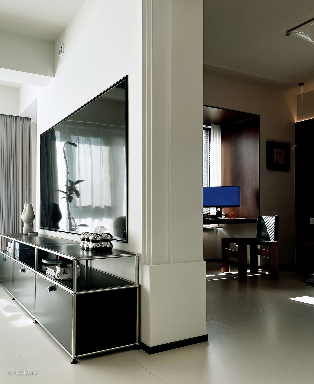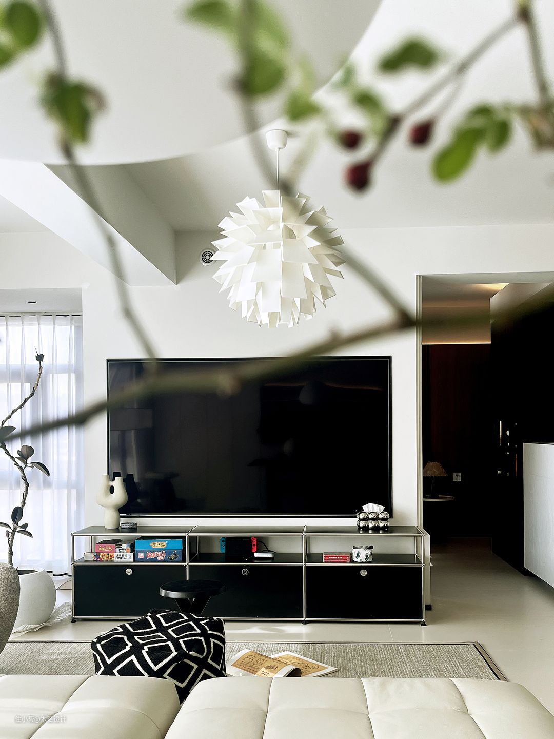 客厅以浅色为主色调,搭配深色家具,营造出一种沉稳而温馨的氛围。电视下的黑色中古模块不锈钢电视柜,与整个客厅的风格相得益彰。