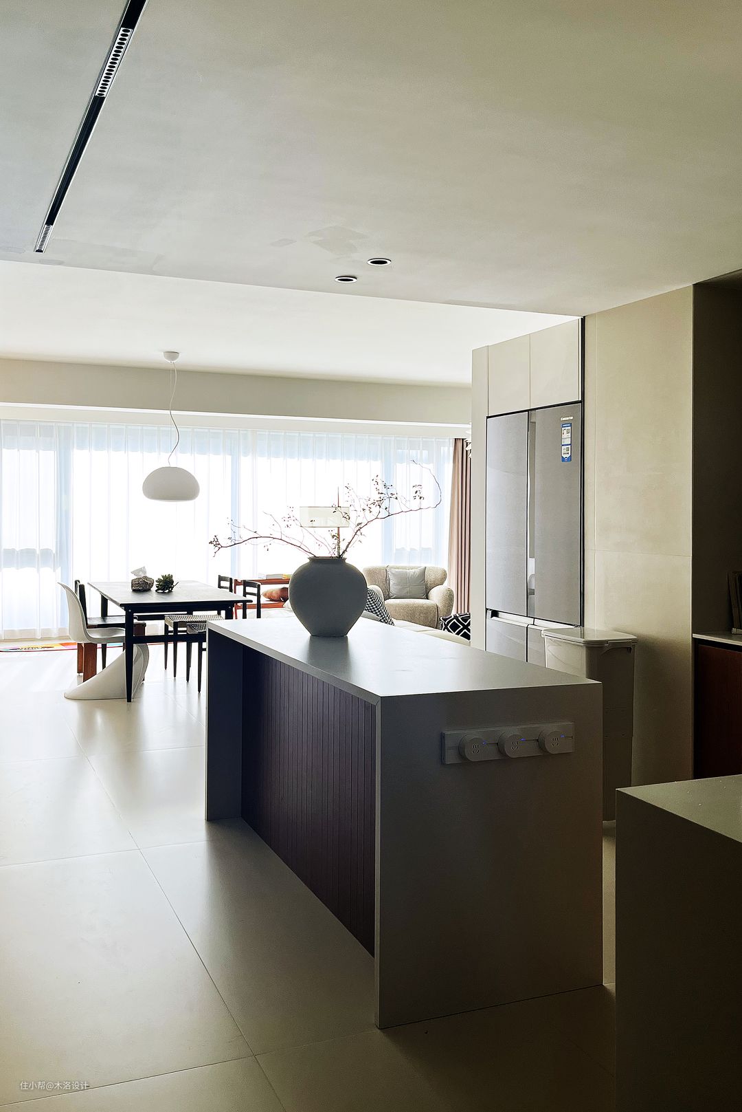 从整个空间来看,厨房、客餐厅与书房是一体的、是相通的,挪到走廊的水盆和书房、房间之间做成了“回”字动线,各个小空间也互不打扰,非常舒服!