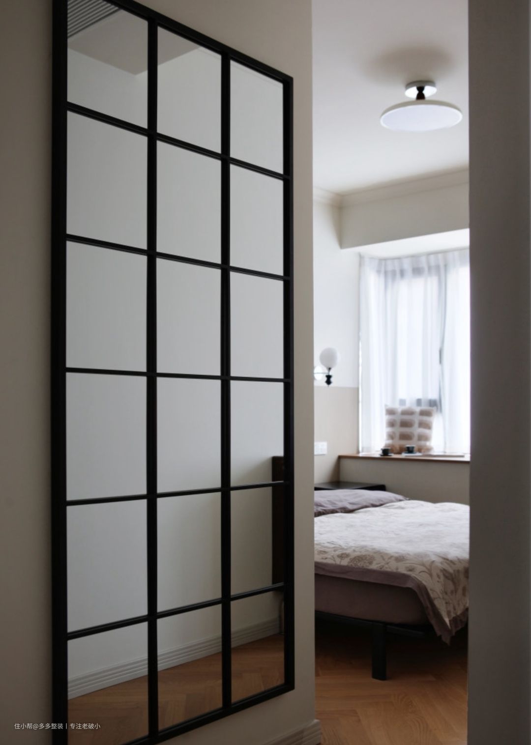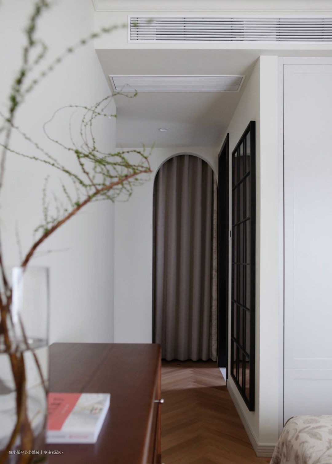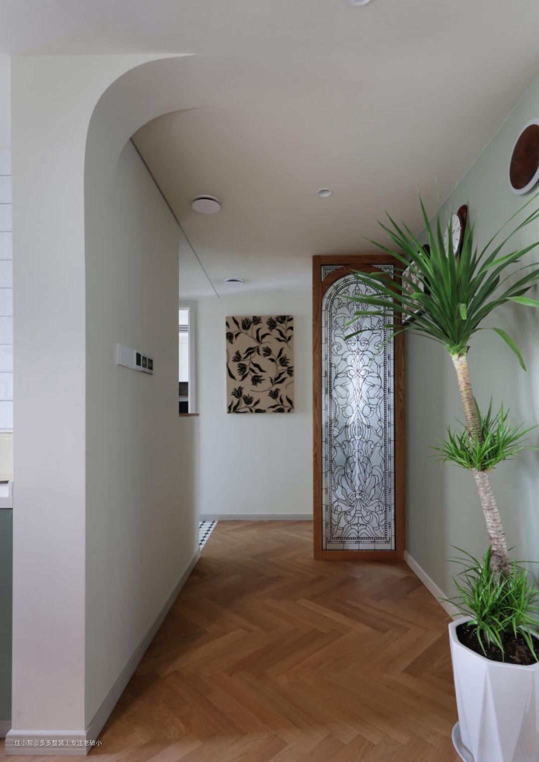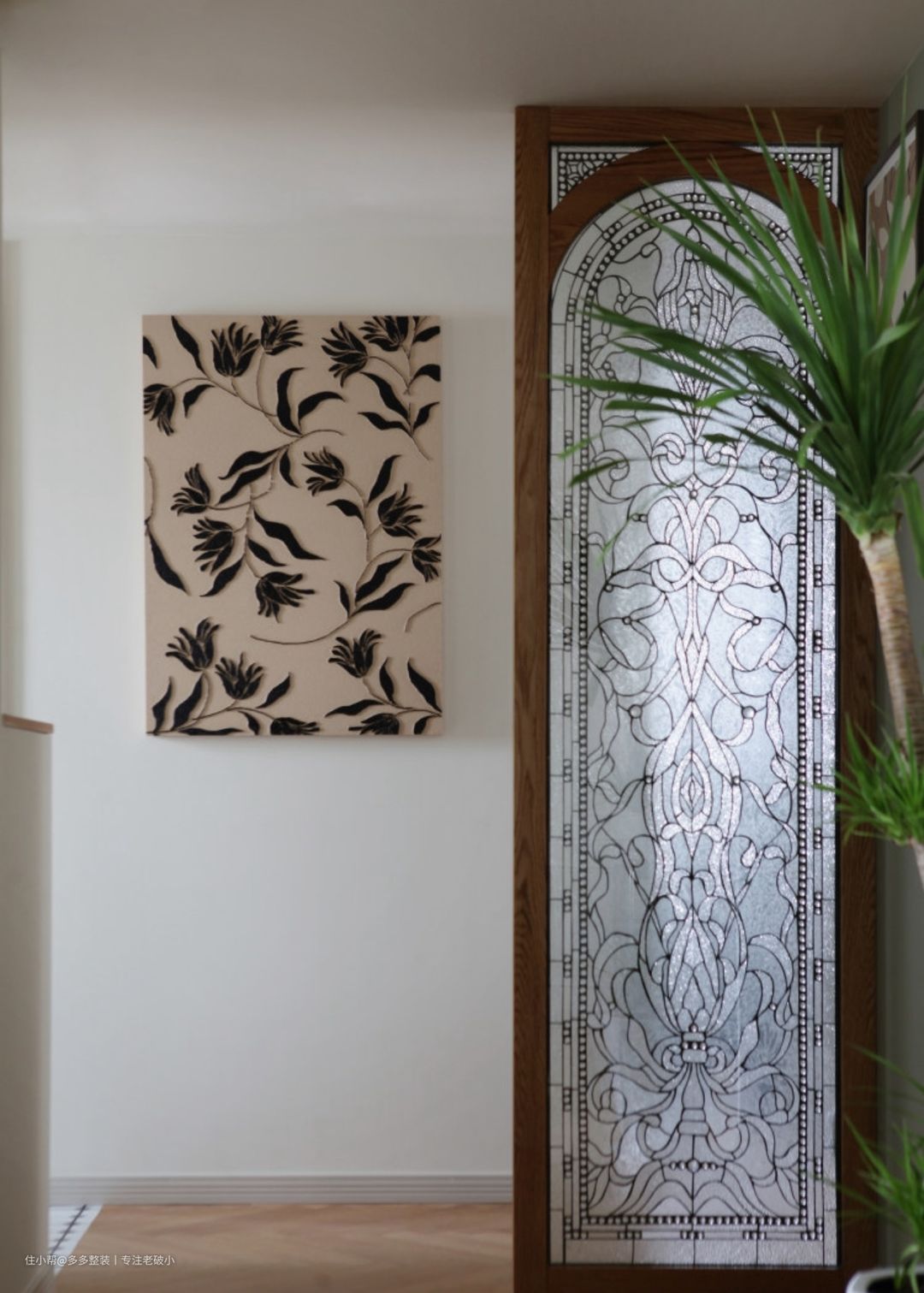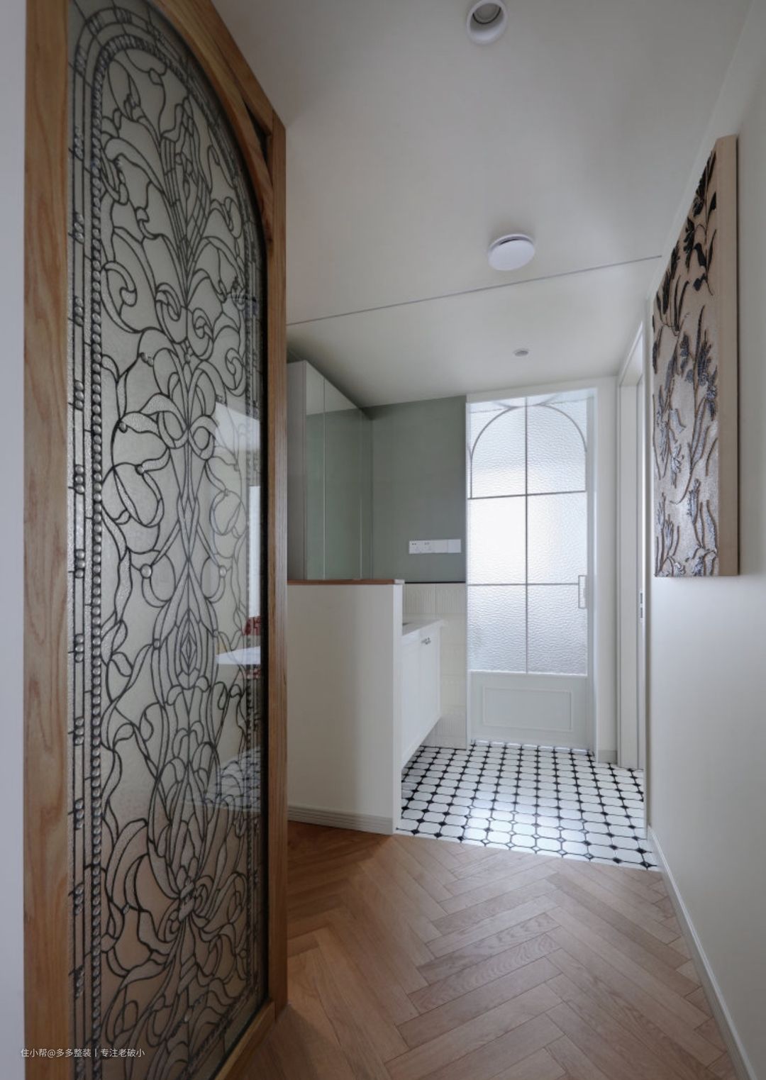 因为改动了户型结构,改后的卫生间门一入户就可以看到不是很好,所以在走廊尽头定制了一段屏风,实木框架内嵌蒂凡尼玻璃,浪漫又神秘~ 半拱形的走廊门洞增加不少柔和度,不仅丰富了空间的层次感,也增加了视觉的纵深感。