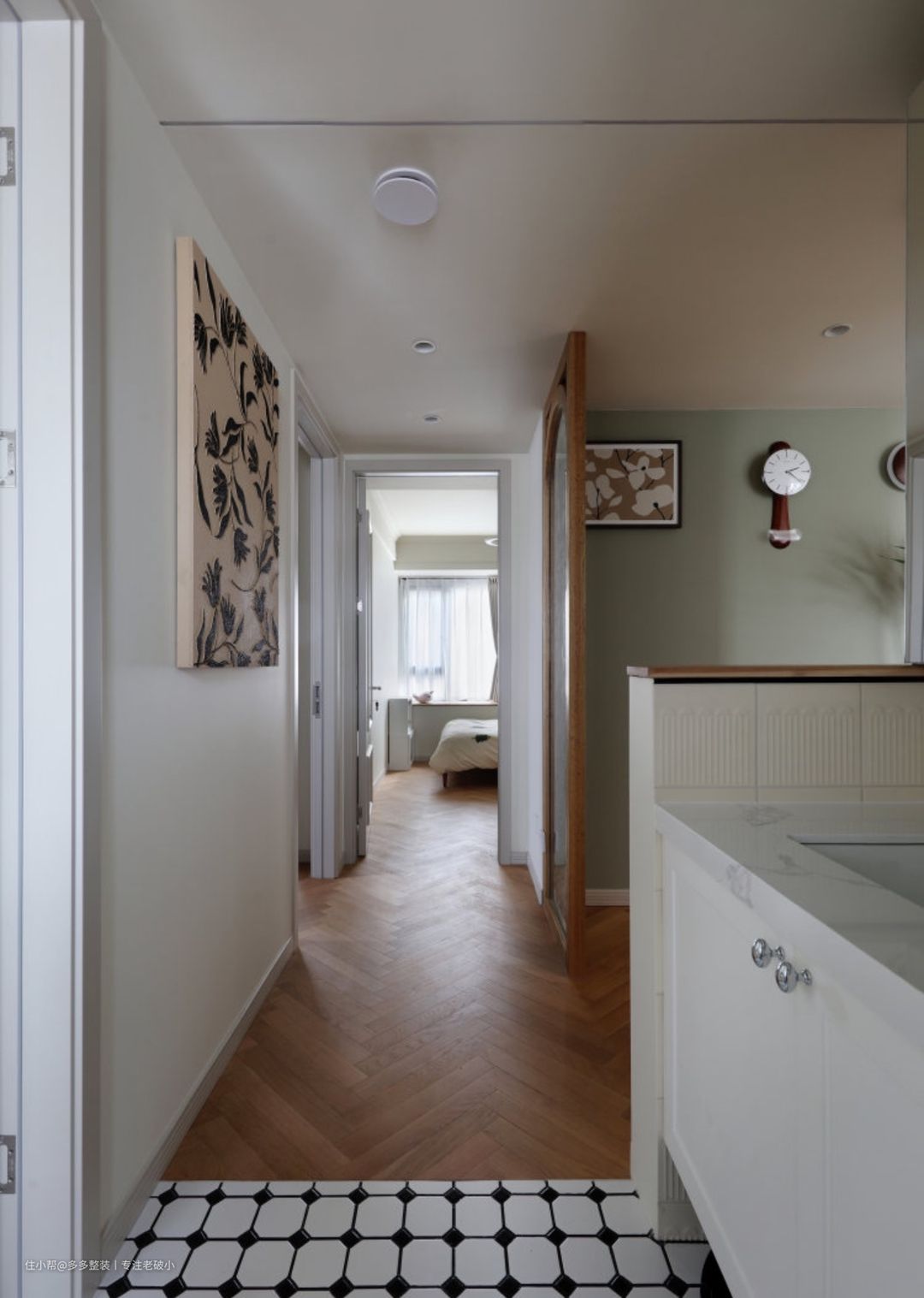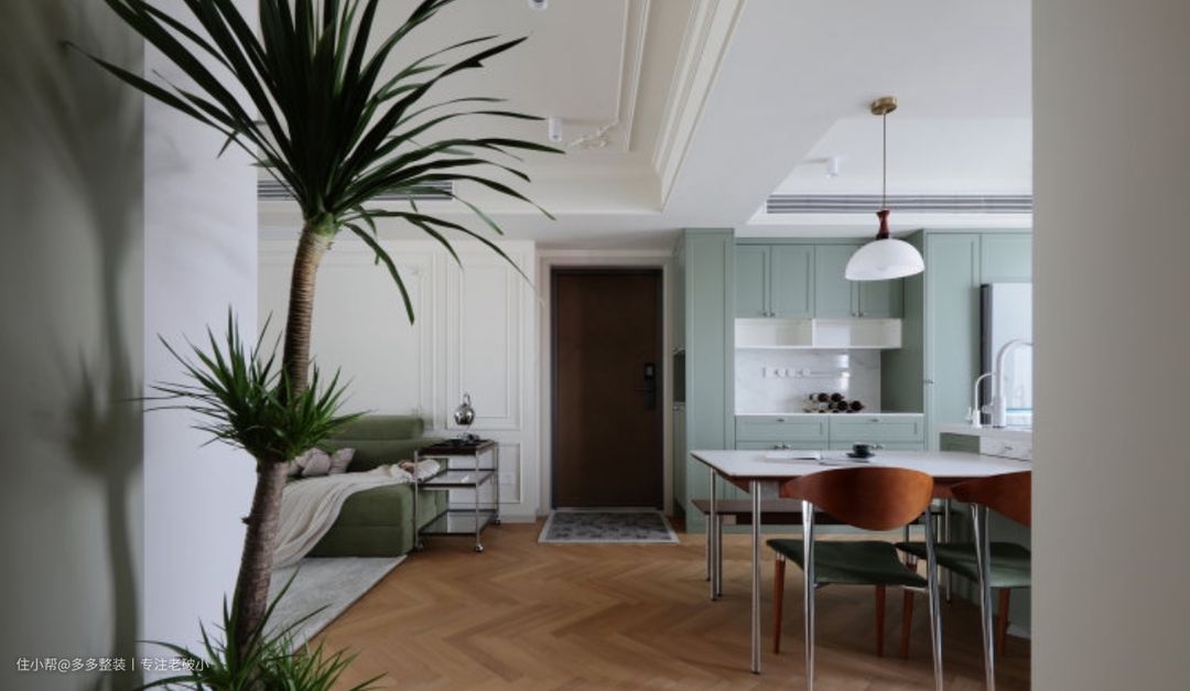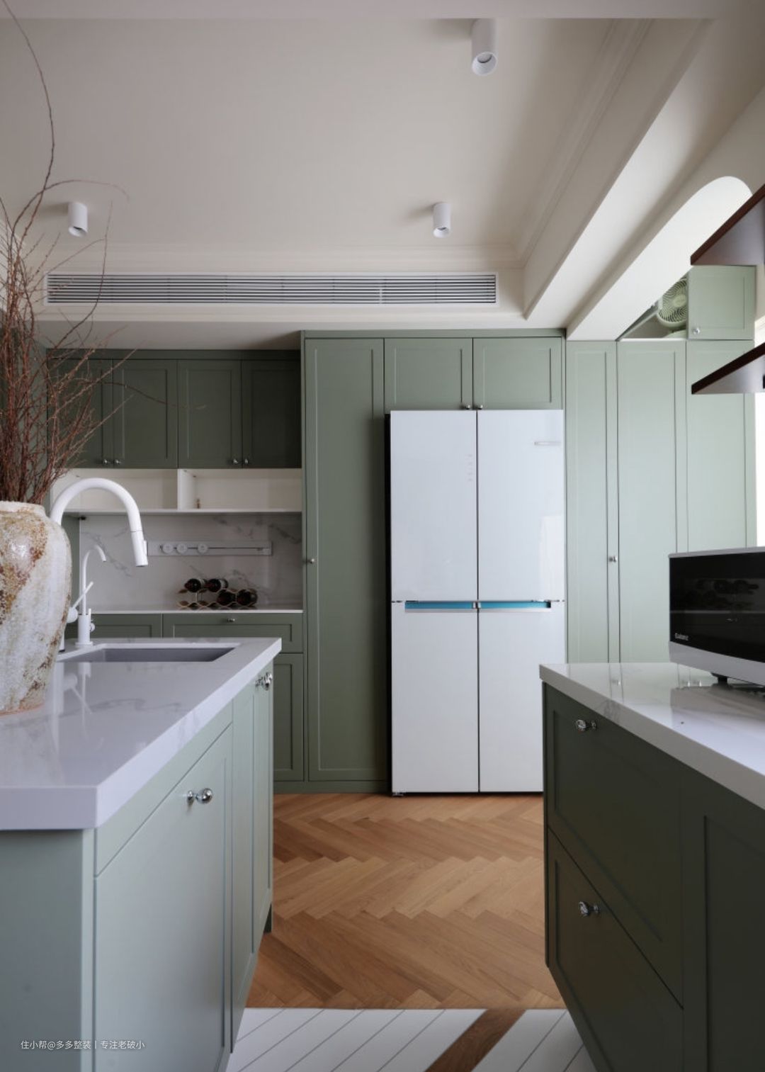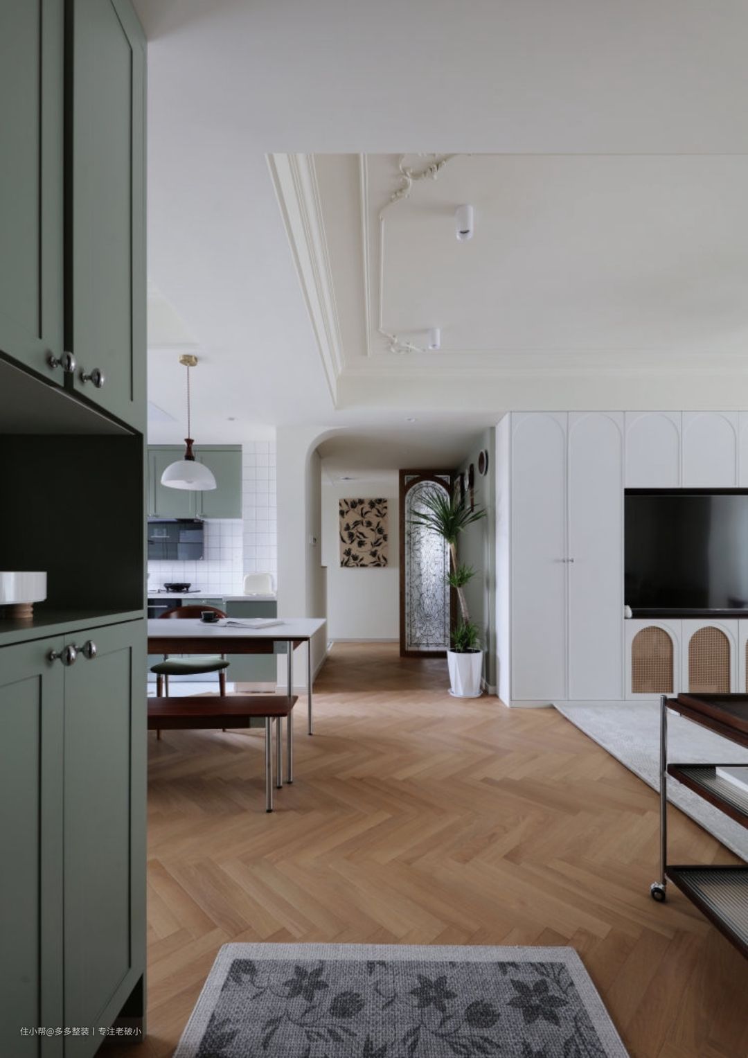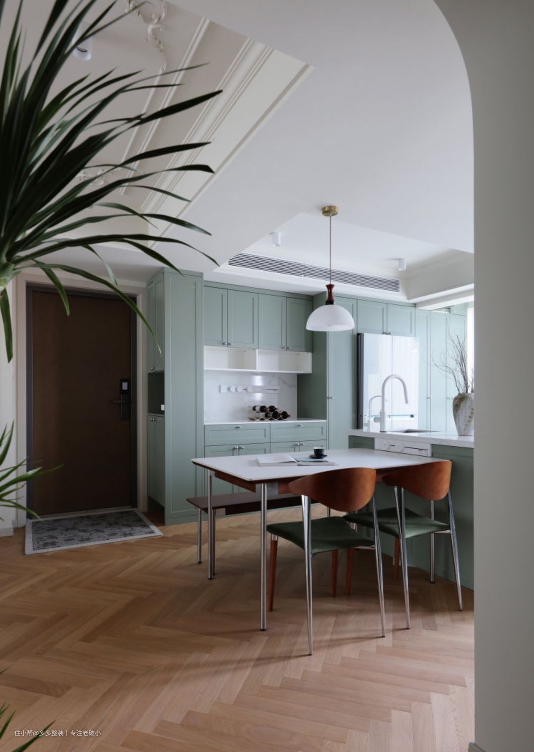 岛台的设计大大的补充了厨房台面,一些简单的餐食都可以在这里制作完成,下方做收纳柜设计,保证了厨房的收纳空间,让一进门就可以看到的餐厨保持干净整洁。餐边柜高矮柜的设计也便于收纳各种餐具,开放平台可以放置日常使用的小电器,吊柜下方做了一层开放格,好看的杯子也有了展示的空间。 冰箱内嵌于一排高柜中,顶天立地的柜体收纳进各种尺寸的锅碗瓢盆都不成问题。 因为是开放式厨房,地面材料的选择需要一些小心思。 普通方正的瓷砖铺设,跟木地板之间的拼接总是过于生硬,考虑到客户选择了人字拼的木地板,索性将瓷砖也做成人字拼,不规则的穿插进木地板中,让两个空间的地面有了自然的过度。