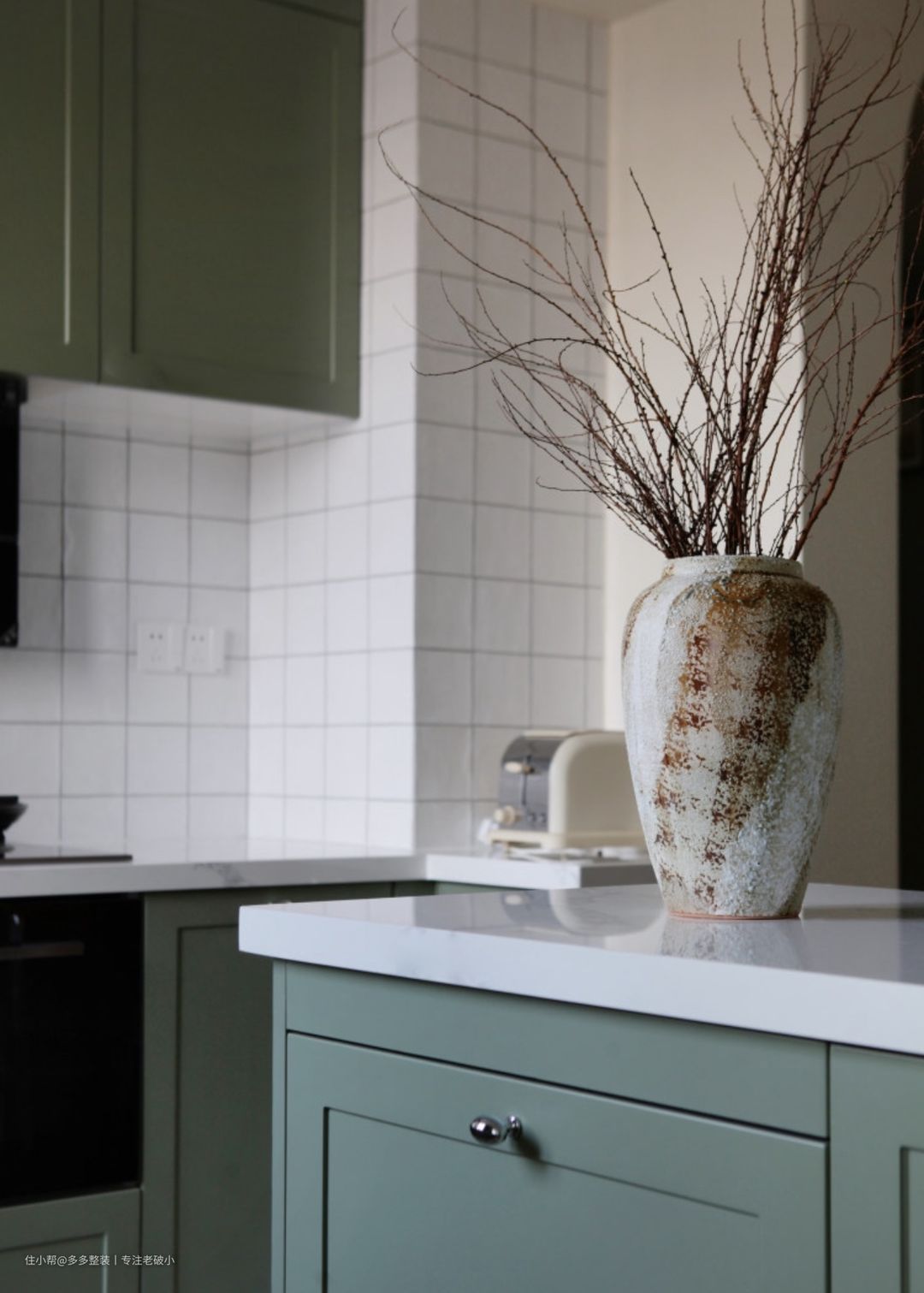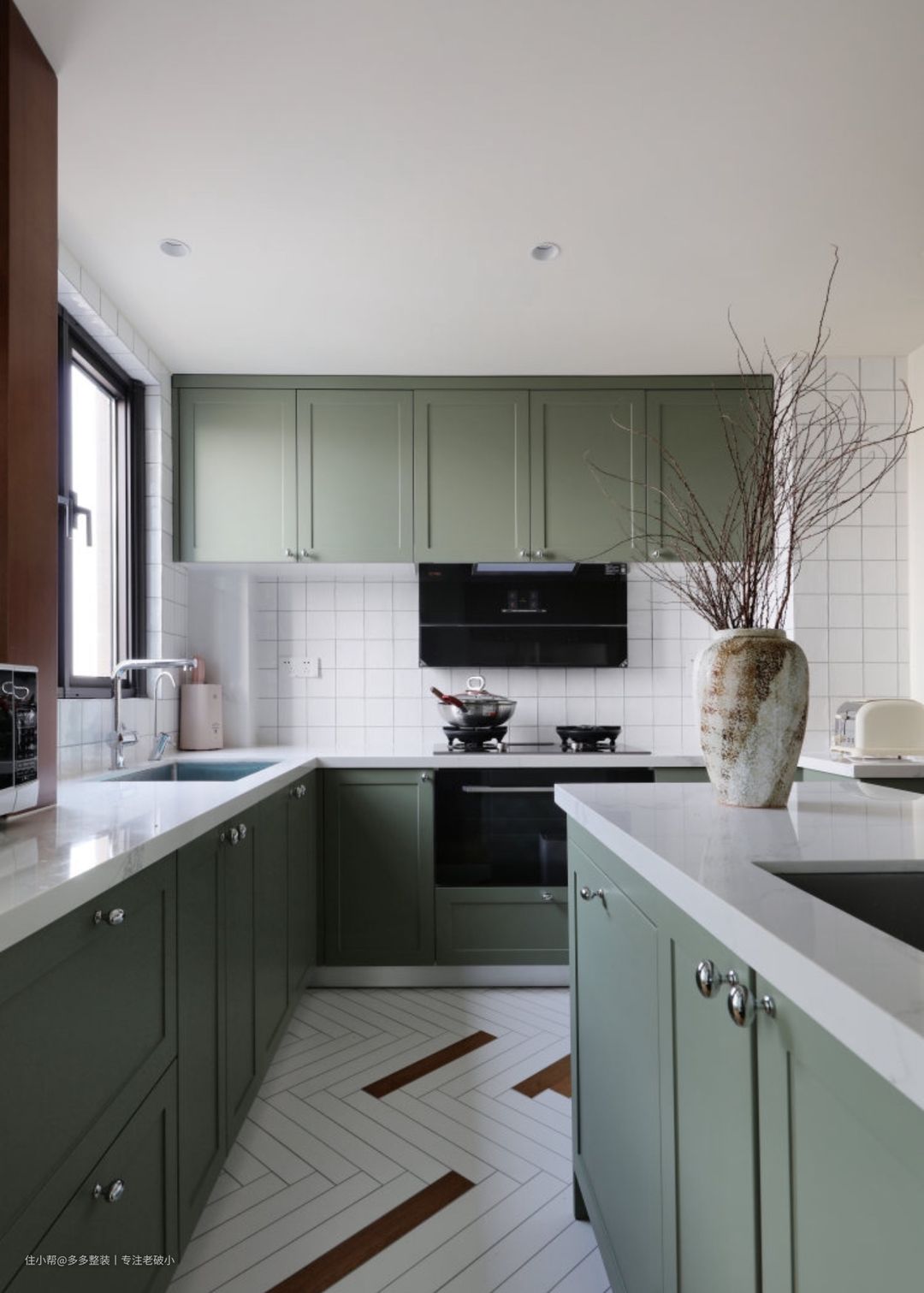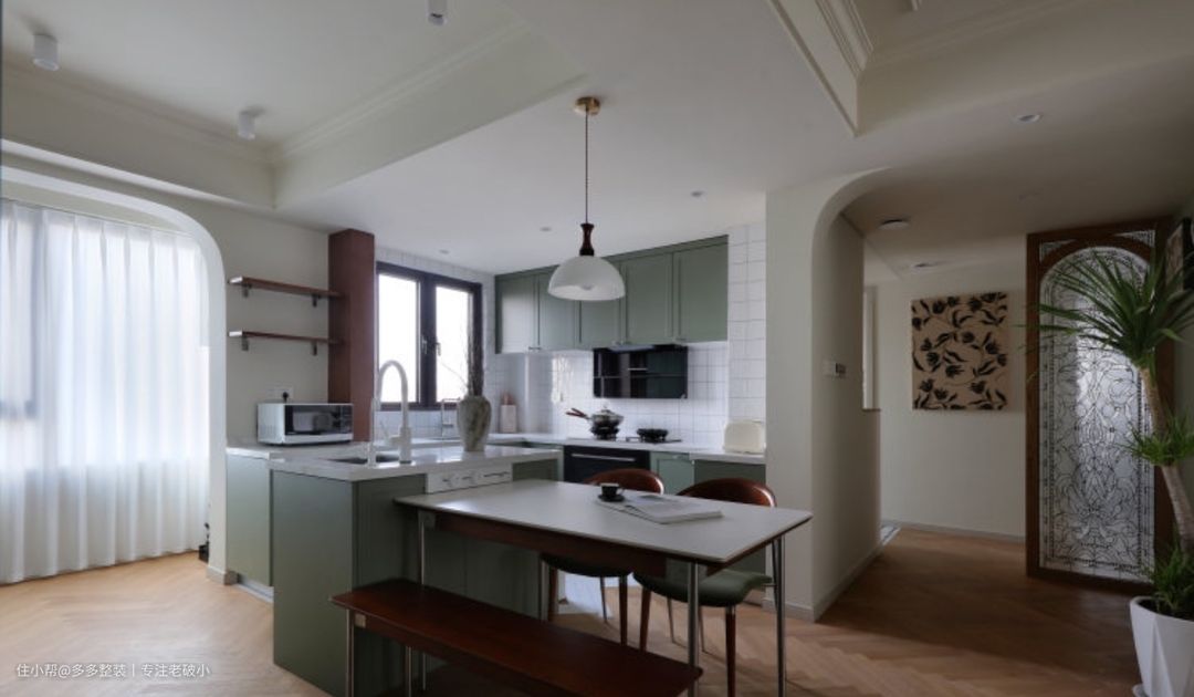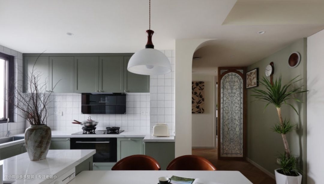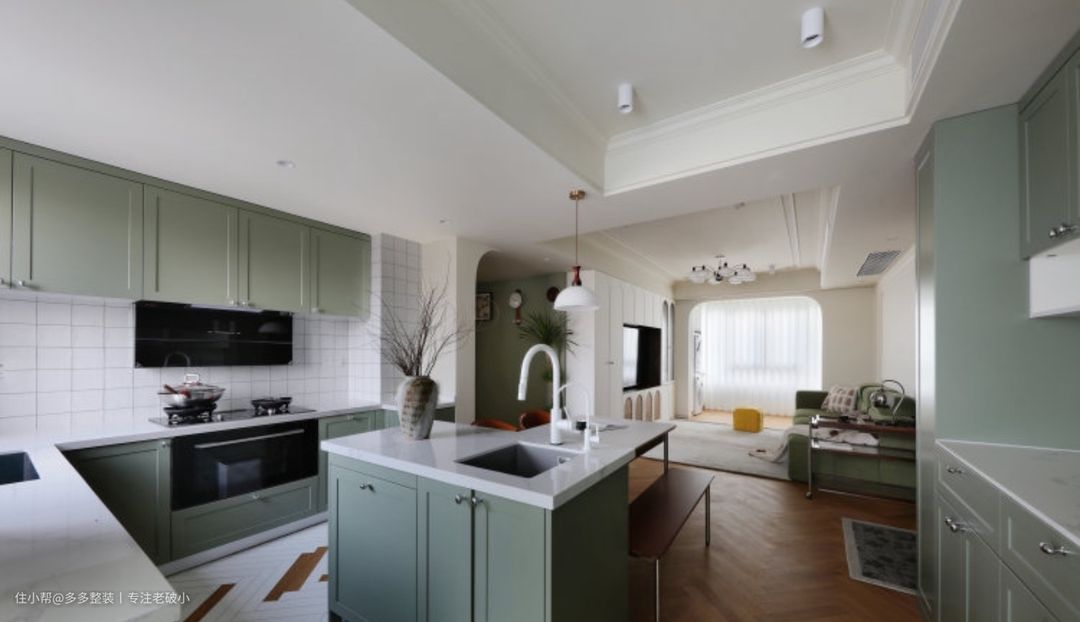 岛台的设计大大的补充了厨房台面,一些简单的餐食都可以在这里制作完成,下方做收纳柜设计,保证了厨房的收纳空间,让一进门就可以看到的餐厨保持干净整洁。餐边柜高矮柜的设计也便于收纳各种餐具,开放平台可以放置日常使用的小电器,吊柜下方做了一层开放格,好看的杯子也有了展示的空间。 冰箱内嵌于一排高柜中,顶天立地的柜体收纳进各种尺寸的锅碗瓢盆都不成问题。 因为是开放式厨房,地面材料的选择需要一些小心思。 普通方正的瓷砖铺设,跟木地板之间的拼接总是过于生硬,考虑到客户选择了人字拼的木地板,索性将瓷砖也做成人字拼,不规则的穿插进木地板中,让两个空间的地面有了自然的过度。