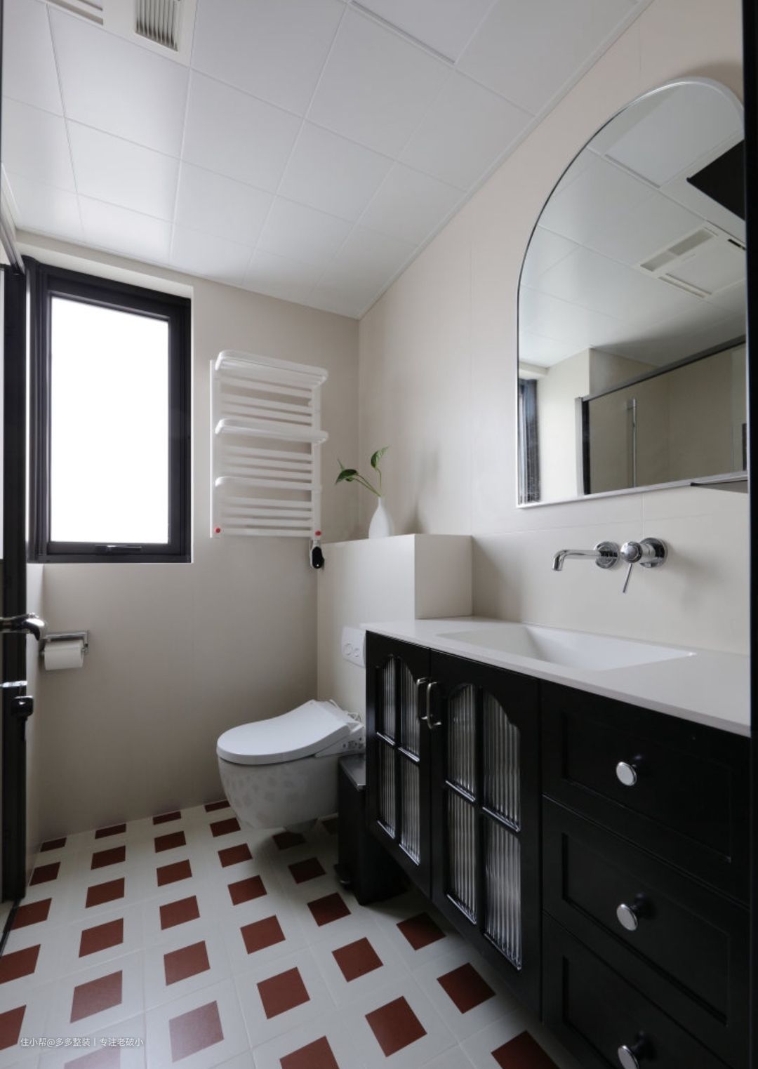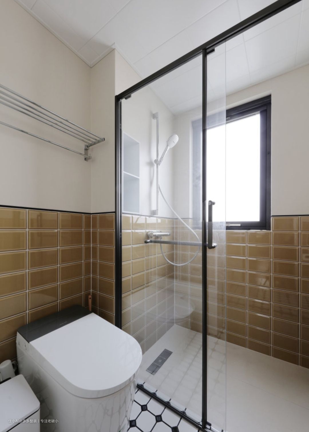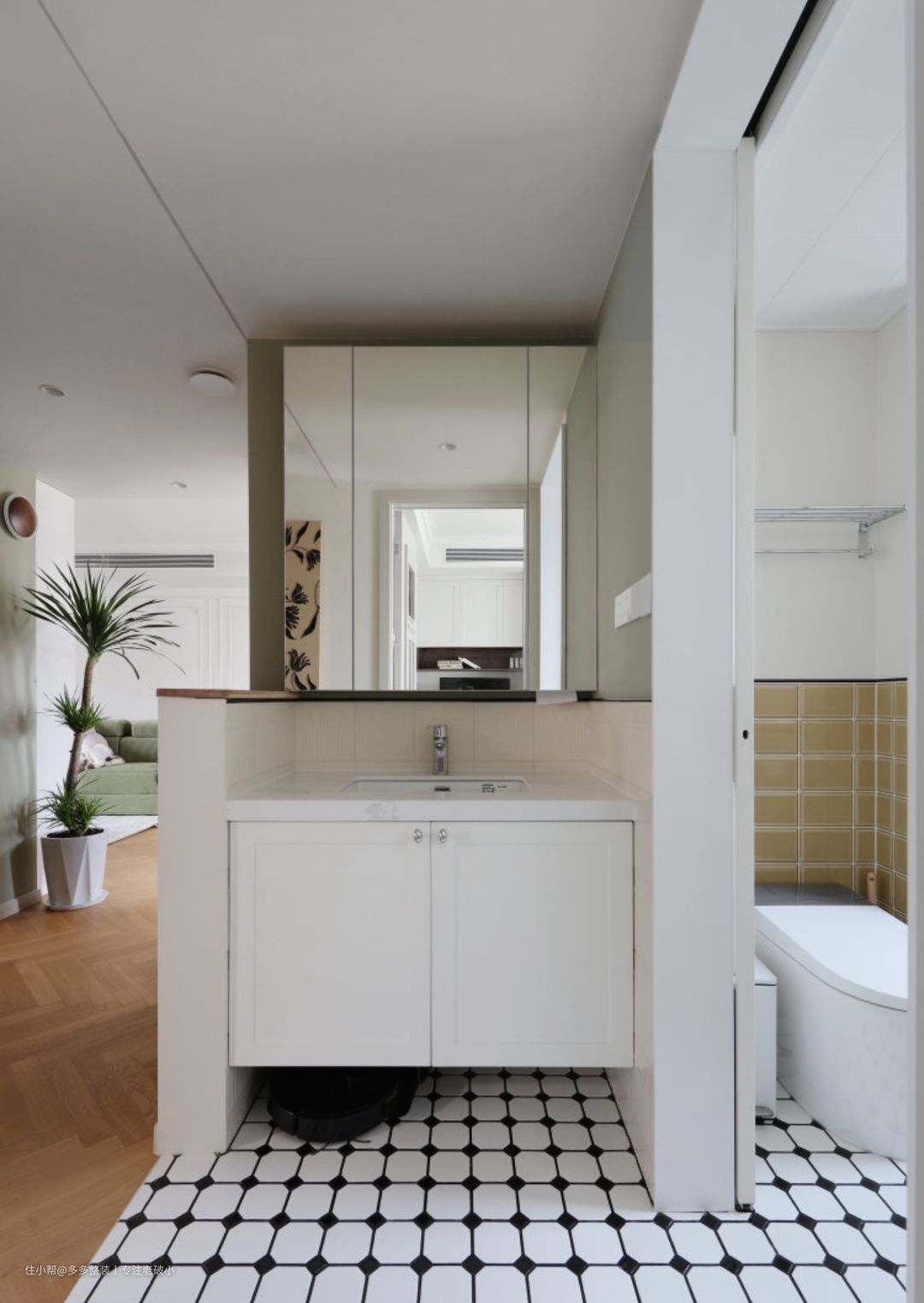 次卫从干区延伸进湿区的复古黑白马赛克,看到它就会被它的颜值打败。 干区半高墙的设计更加通透,立体浮雕花纹的奶白色墙砖与浴室柜相得益彰。 湿区姜黄色立体感小方砖搭配米白色大砖,让整个空间精致又充满松弛感,空间虽小,但细节满满。