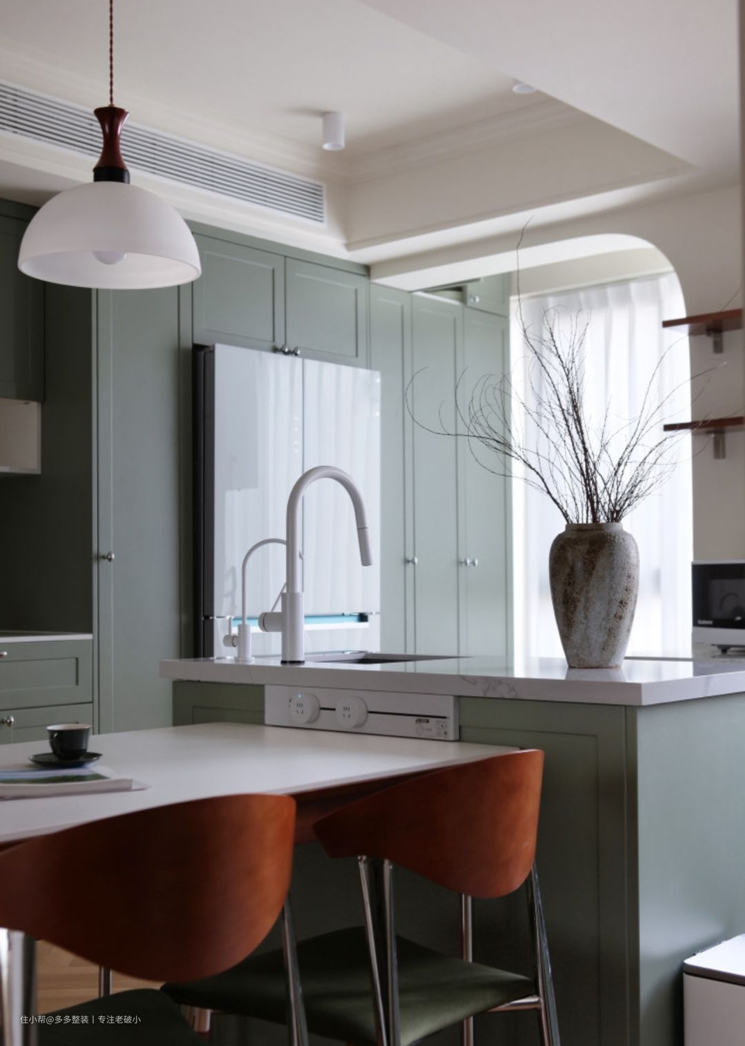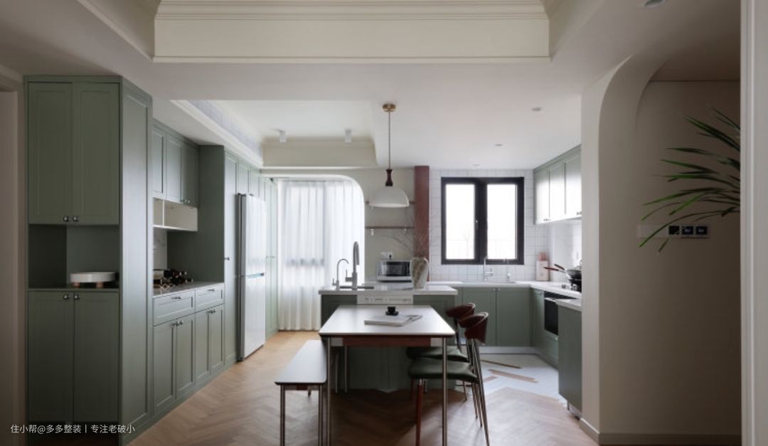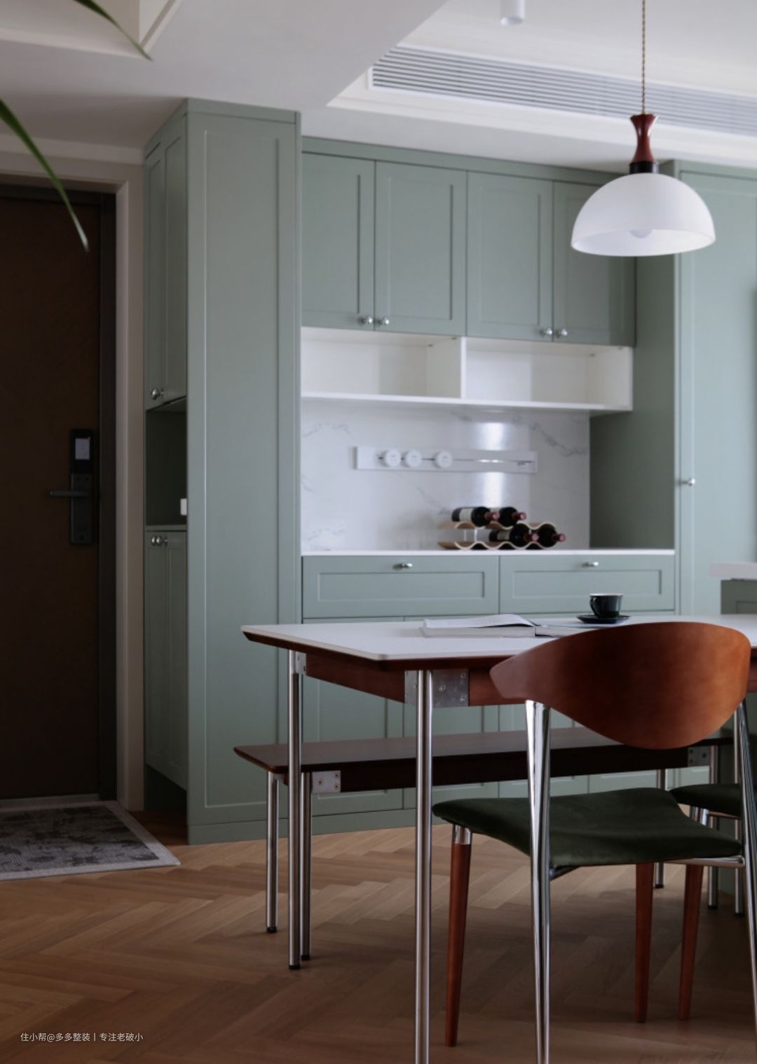 原本各自独立的餐厨做成开放一体后,让餐厅瞬间放大一倍,储物空间和生活动线都更加合理舒适,岛台➕长餐桌的配置不仅增加了餐厨的操作空间,也让日常生活使用更便捷。因为条凳一侧后靠餐边柜,用传统餐椅多少会有一些阻碍,搭配条凳不仅让空间元素更加丰富有趣,也减少了生活中一些不便利的因素。