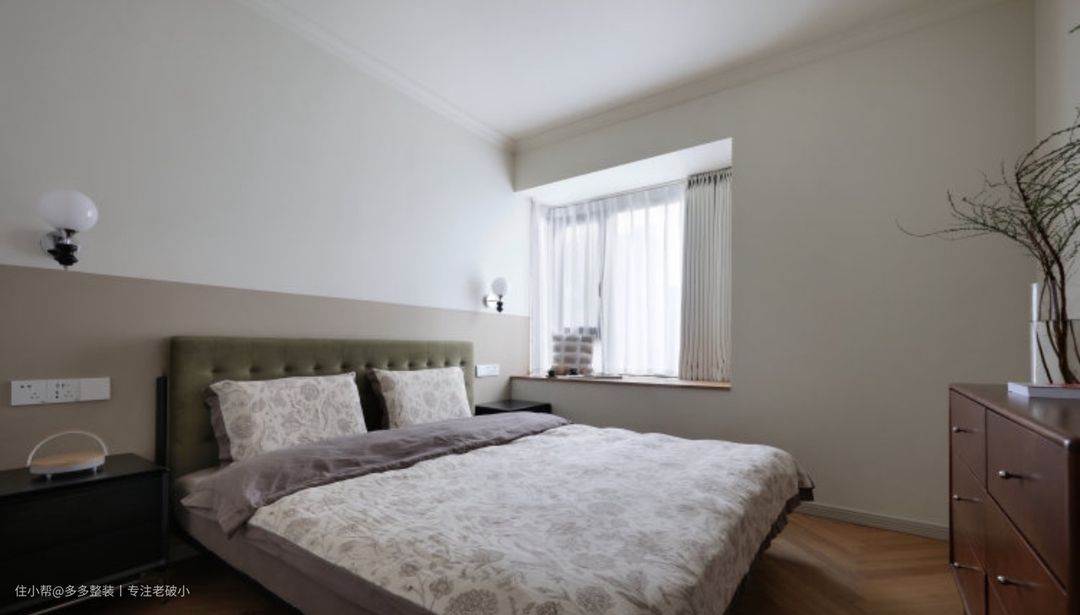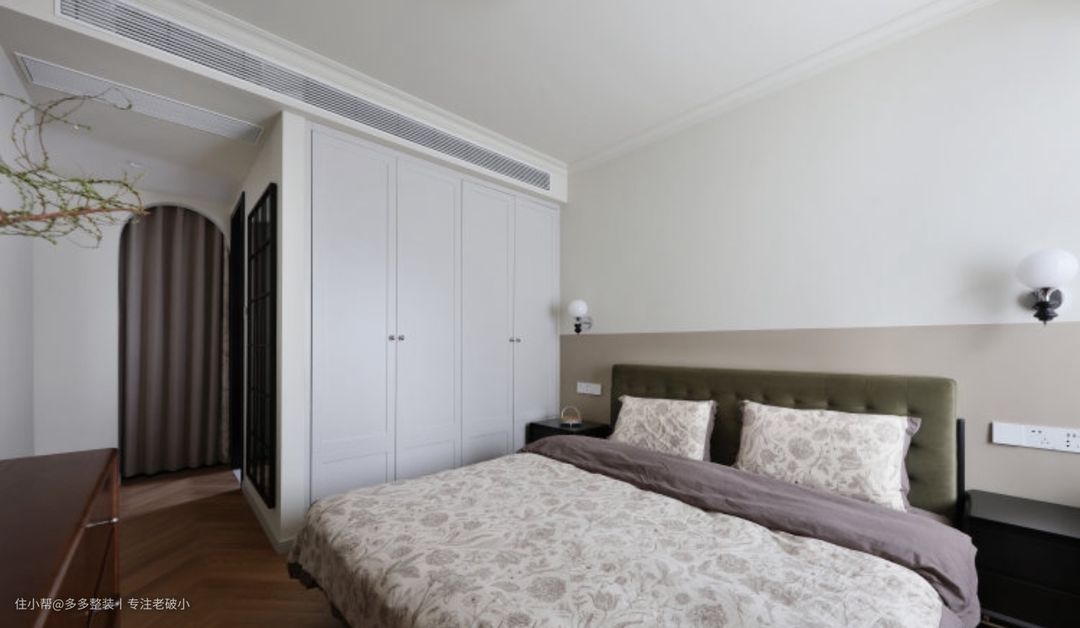 一进主卧,映入眼帘的是一面巨大的复古仿窗格镜子,瞬间氛围感拉满,黑色线条描边韵味感十足,让空间有一种被拉伸的错觉。主卧衣帽间设计了一个正拱形门洞,内挂窗帘充当门,既保护了隐私又起到装饰作用,窗帘自然的褶皱和垂感,给卧室氛围增加了些许灵动感。 主卧背景墙没有复杂的装饰,仅仅用两种深浅不同的脏粉色就营造出卧室浪漫温馨的氛围感,复古绿的软包床头与背景色彩形成对比互补,谁说红配绿不高级~ 原本鸡肋的飘窗,简单布置后瞬间变成家中一抹靓丽的风景,坐在这里畅享片刻宁静时光,无论是夜晚的星空,还是白天的阳光,都能在这里找到一份独特的宁静与惬意。