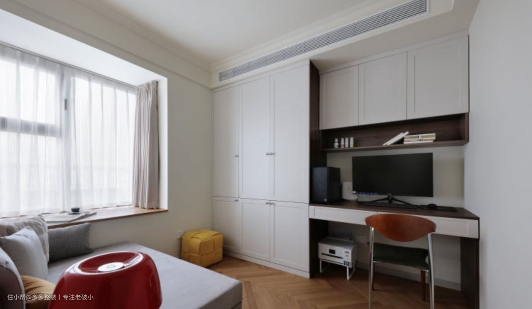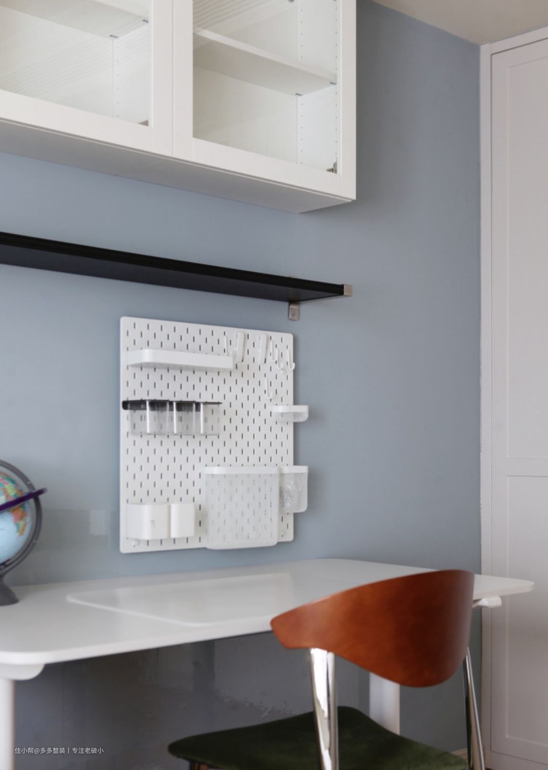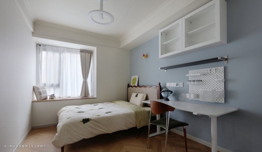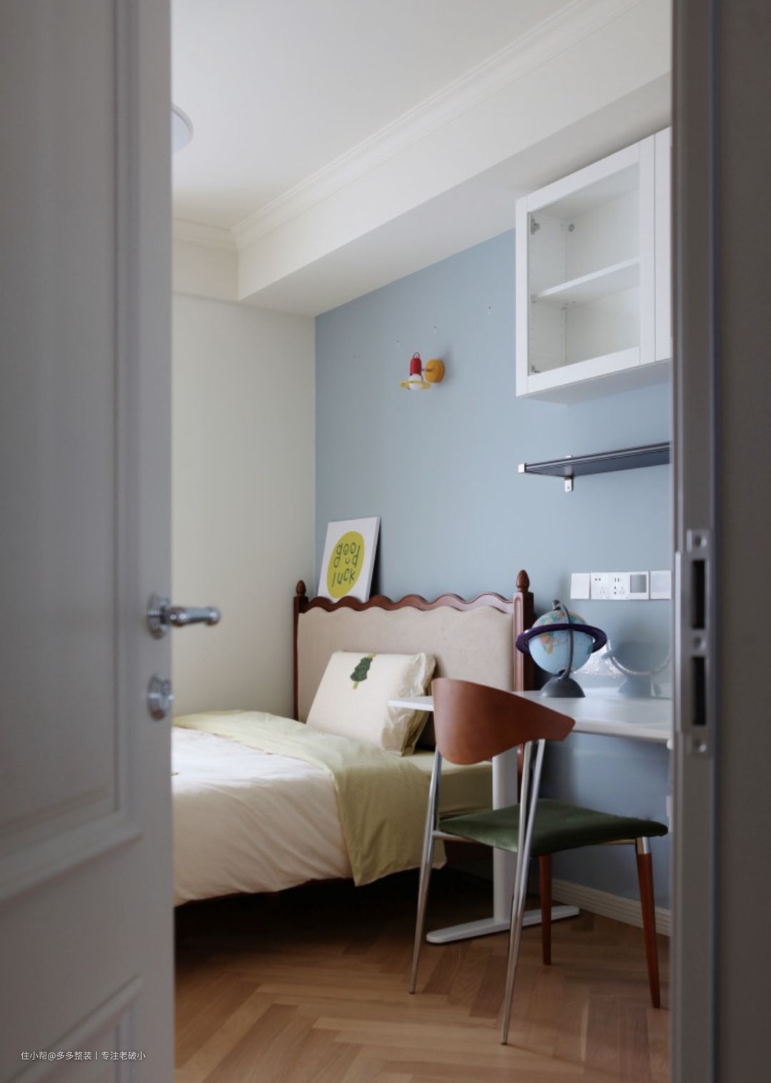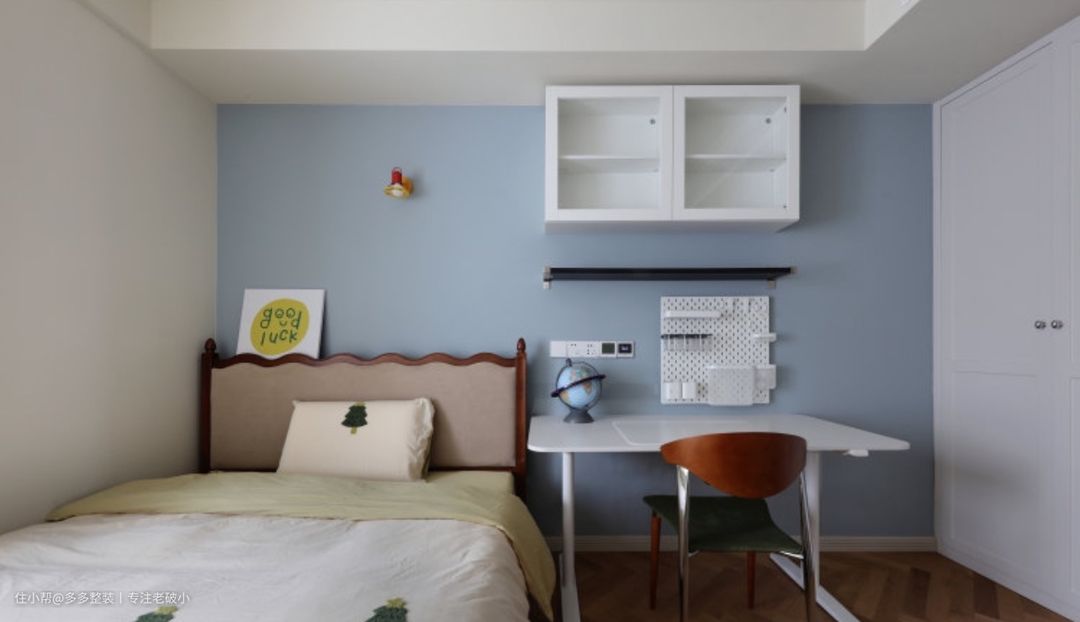 儿童房用雾霾蓝打底,营造出清新活泼的氛围感,波浪形的床头增添不少生动与童趣。书桌柜搭配简单的白色,让空间整体保持简洁干净,随着小朋友的成长,再更换适合的可移动家具或软装搭配,都不会与白色有冲突。