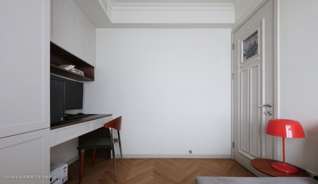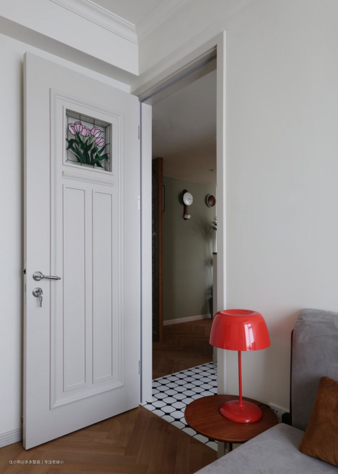 书房柜体用胡桃木色和暖白色进行搭配组合,让空间氛围更加沉稳内敛,角落配置一张简单的沙发床,既不破坏整体的设计,又可以让书房作为临时客房使用。鲜红的花苞灯是无法遮掩的夺目焦点,一眼惊艳,天真而热辣~ 复古造型的门内嵌一小块蒂凡尼玻璃,不得不说与法式复古真是绝配,非常点睛的增加了空间色彩和艺术气息。