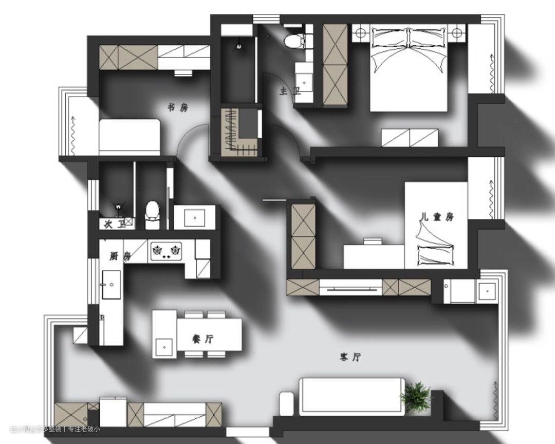 改造后: 1. 将厨房做成开放式,餐厨一体增加岛台的设计,让餐厨面积都更加宽敞实用。 2. 改变衣帽间的位置,让主卧跟儿童房的空间都更加方正便于空间布局规划,合理利用每一平面积。 3. 因为改动了主卧的空间,书房门洞位置也不得不变化,没有影响书房的使用面积,同时又便于书房与儿童房的使用者进出入卫生间。