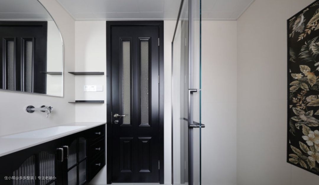主卧卫生间的黑色复古门与浴室柜的搭配相得益彰,红色的几何花砖衬托的黑色更具神秘色彩,淋浴房特意用四片壁纸花砖拼成一副挂画,优雅又别致。