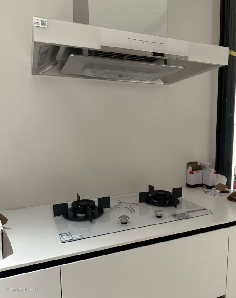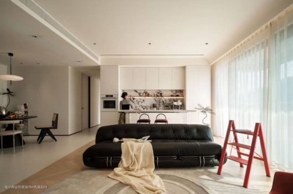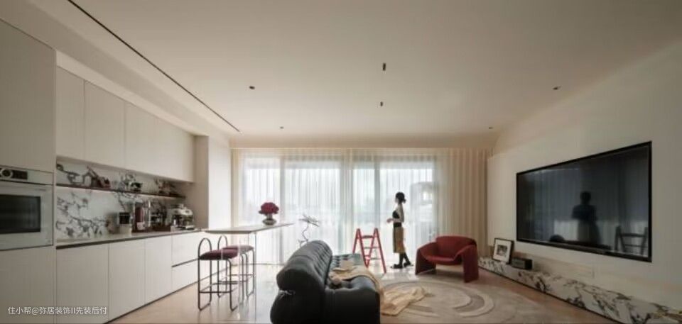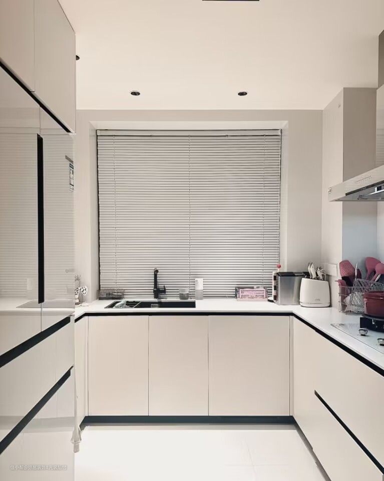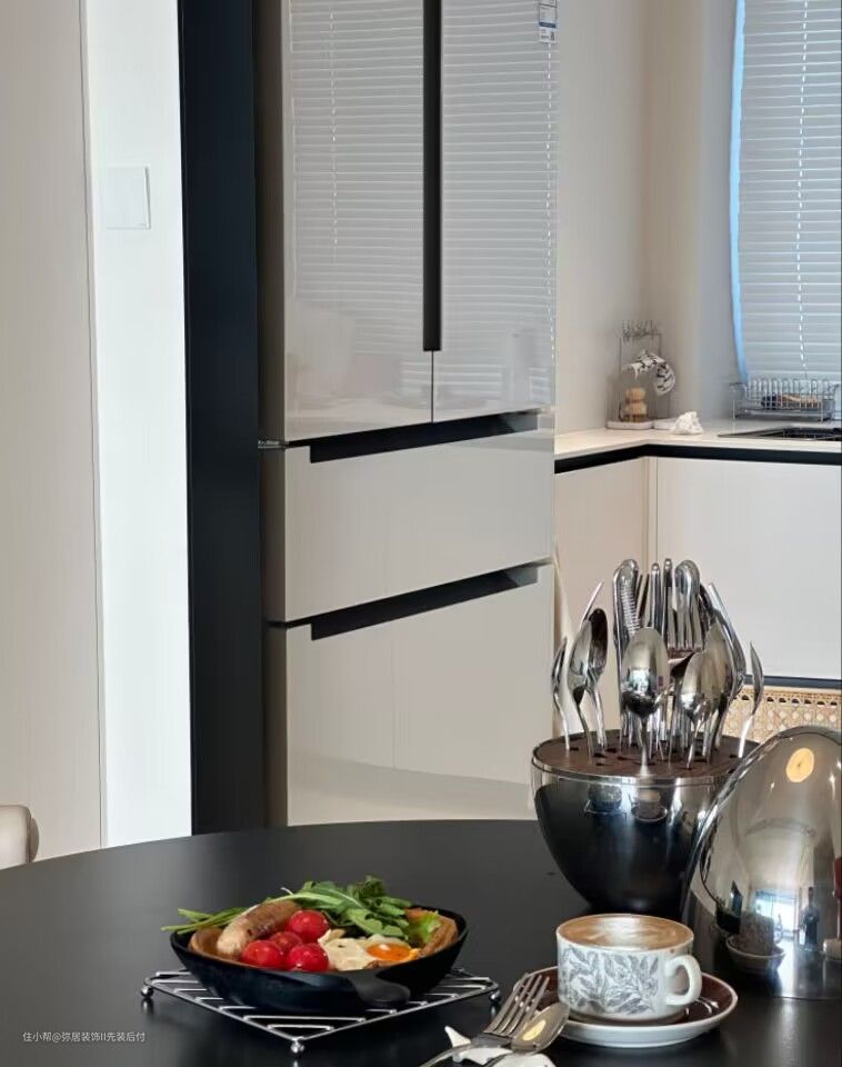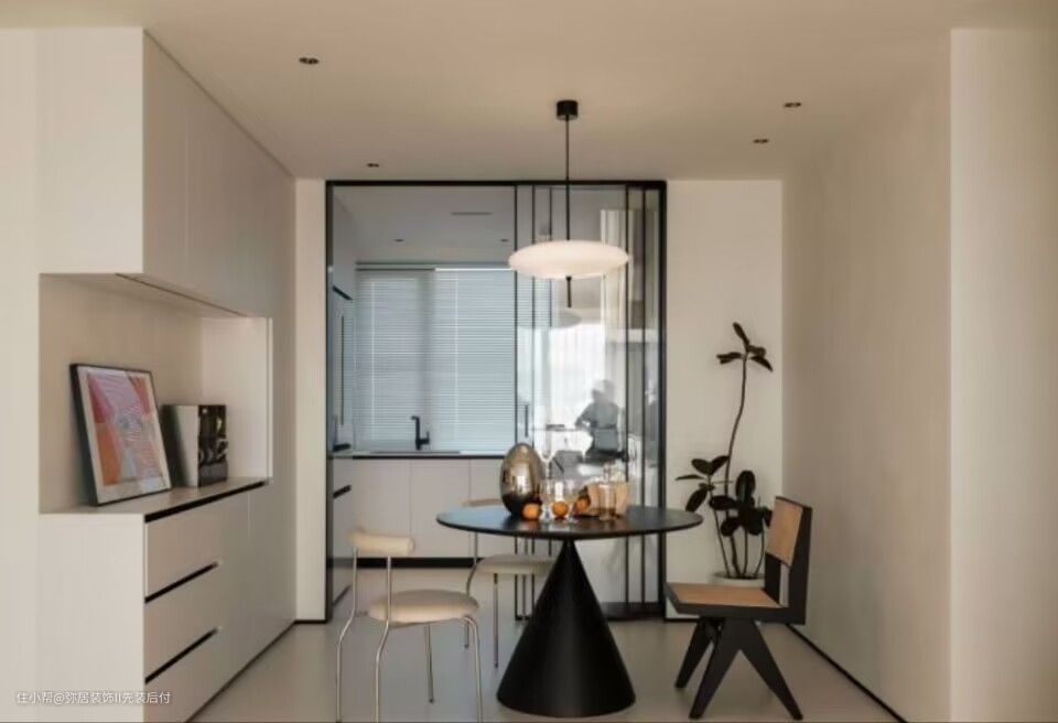 餐厅和厨房面积有限,为了让空间看上去尽可能大,和设计师讨论过程中,决定在细节多做减法。 ·在色彩上: 做到完全的统一,餐边柜、岩板和地面,做到最大程度统一的白。 ·在吊顶上: 放弃一部分层高,从餐厅到厨房直接吊顶拉平,最大程度的保留整体性。 ·在隔断上: 极窄三联动移门、放弃抽油烟机吊柜(划重点),视觉上的通透让小厨房变大!
