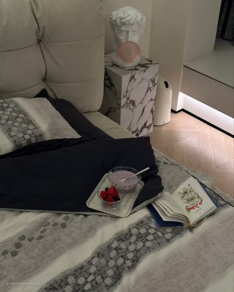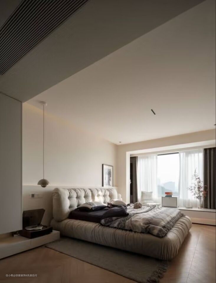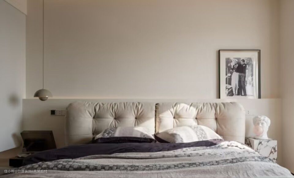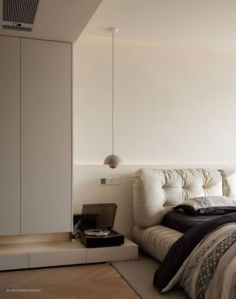 了保留一个宽敞的主卧,以及搬进心心念念的云朵床,坚持取消了主卧内大部分衣柜的设计,仅床头保留了一个悬浮衣柜和地台式床头柜,没有了隔断,也达到了南北通透采光极好的效果。