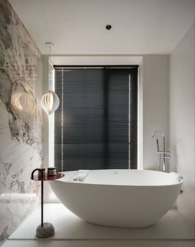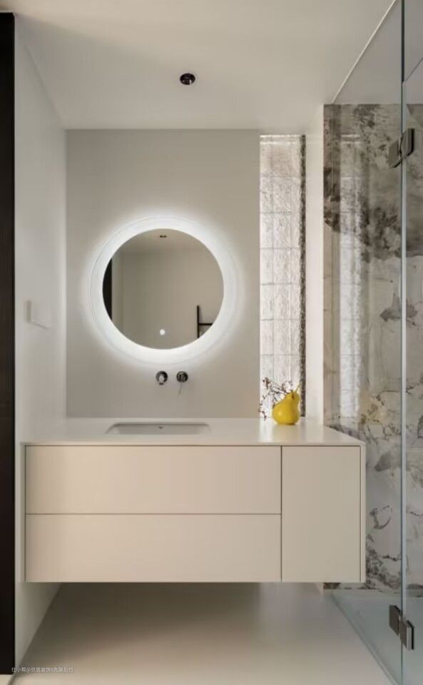 一意孤行的纯白卫生间,搭配潘多拉岩板的撞色,落地玻璃边,把浴缸搬进无边框淋浴房。为了让主卧里的衣帽间和主卫有一点关联性,还在中间加了一小块玻璃砖墙增加通透感。