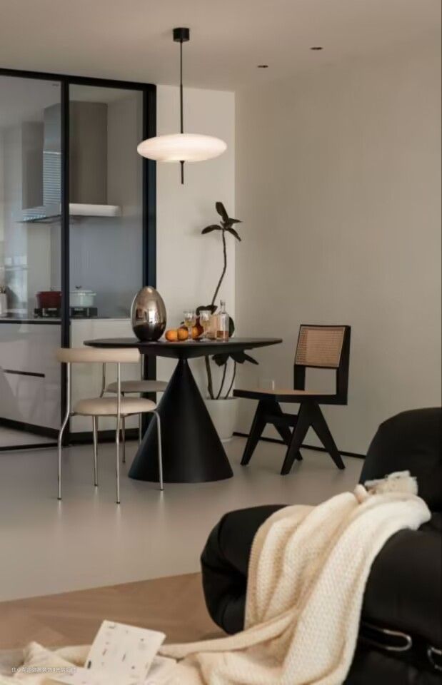 餐厅的整体色调和厨房保持统一的白色,作为厨房和客厅的连接,在软装色彩搭配上也呼应了客厅的黑、红主色调。