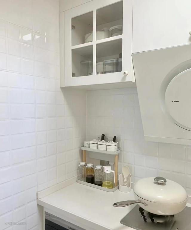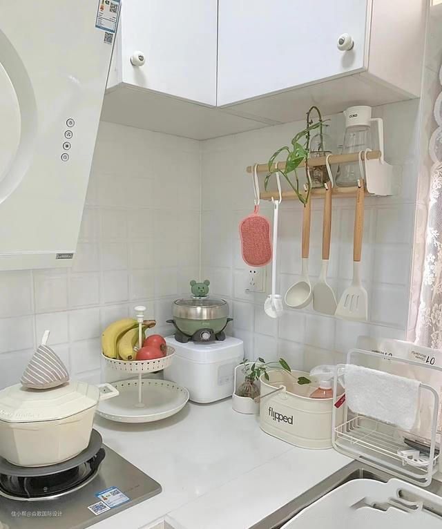定制了橱柜,材质是多层实木,设计的时候加了一个玻璃柜门,整体不单调更加有设计感,橱柜颜色是肤白,有点哑光的感觉,非常奶的颜色,搭配了宜家的白色把手整体真的绝绝子。使用了不同样式的置物架与墙面收纳,让整个厨房保持整洁有序,营造舒心的体验感