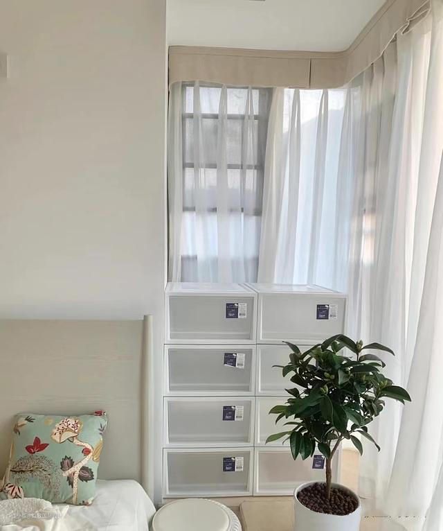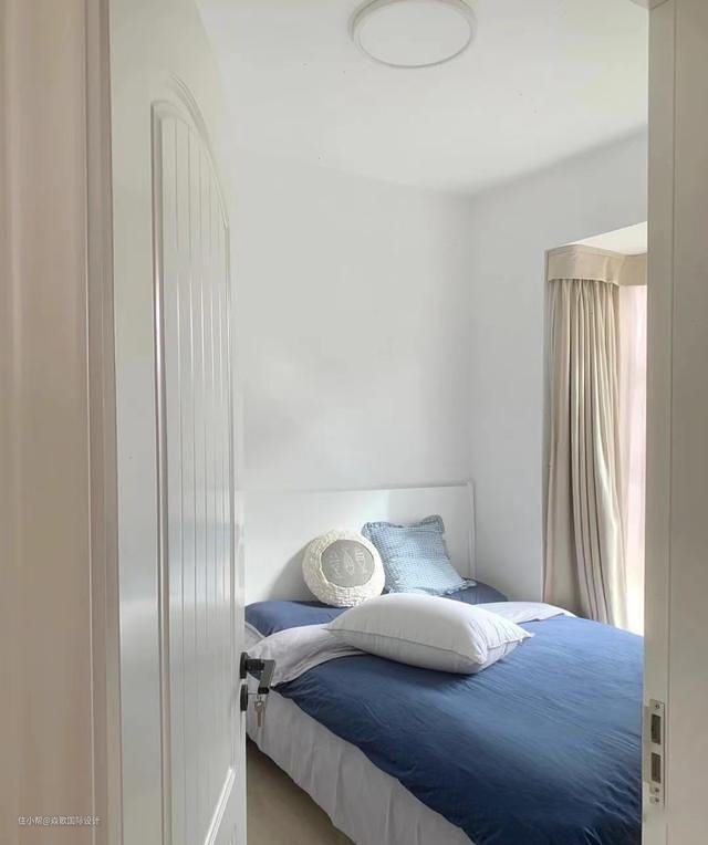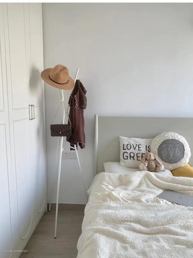 床边放置了晾衣架,收纳帽子、包包等好看又实用。床尾放置了全身镜,方便女主的穿着搭配,可以随时臭美啦。次卧大白墙,视觉上简洁又清爽,使用了蓝色的床品,让人联想到海洋、天空、湖水,表现出一种宁静、自由、清新的氛围感,让人身心瞬感清爽。采用了斗柜搭配宜家圆镜,打造了一个既能当梳妆台又能储存日常用品的小空间,美观又实用