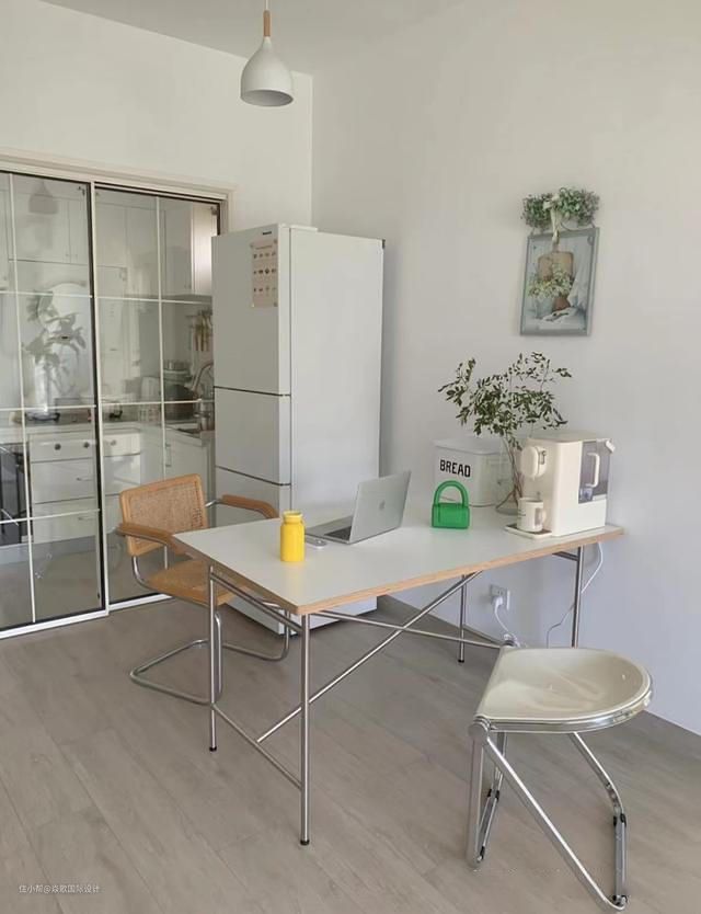 搭配了不同类型的餐椅,让空间更加有趣,实木餐椅也让空间多了一些温暖与柔和感 墙面设计了装饰画来搭配桌面的绿植,让空间不单调从而活络起来,增添了一些活力和生机