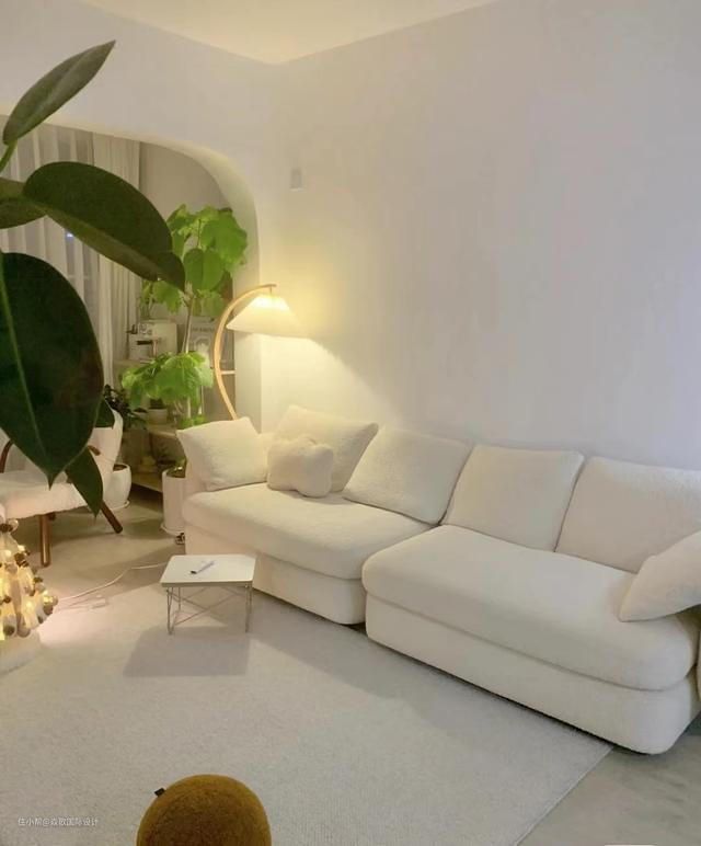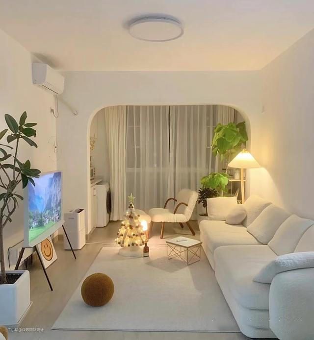 客厅通刷白色的乳胶漆,搭配浅色系的软装,营造奶油风的居家环境,吸顶灯是三色光源,可以根据需要营造不同的氛围感,也让空间明亮温馨 布艺沙发安全绿色环保,布料舒适触感与坐感很舒服,而且透气性能好,采用木质框架构成,细密的海绵,给人带来温暖舒适环保的居家生活环境 电视右边放置了金属搭配玻璃的置物架,能给人以明亮感,有扩大空间的视觉效果,金属透露的坚固感,给人满满的安全感 电视左边放置了一株绿植,充满生机与活力,让整个空间都充满活络起来