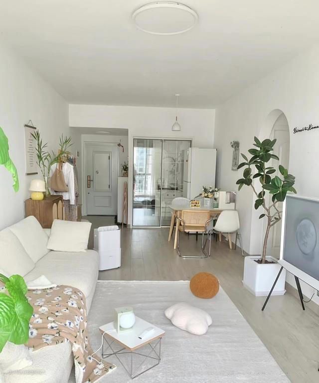 电视背景墙没有做装饰,也设计电视柜,使用了三星超高清超薄网络液晶平板智能电视机,简洁又大气 客厅与阳台打通,与餐厅之间通铺了米灰色的木纹砖,价格低廉、健康环保、易清理,视觉上给人实木的温暖感,采用了三六九铺贴法,整体呈阶梯状,能给人呈现出一种立体感 搭配了落地灯、台灯等灯具作为辅助光源,可以随时营造出满满的氛围感,让生活更有情调