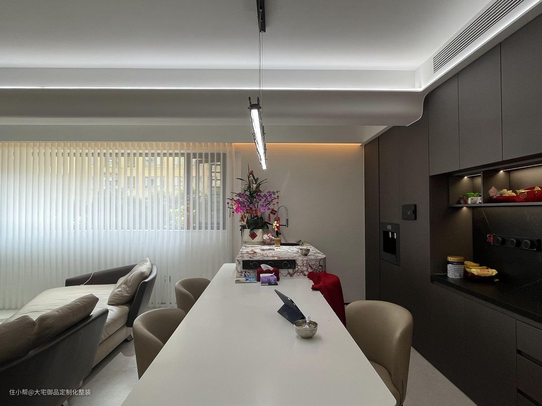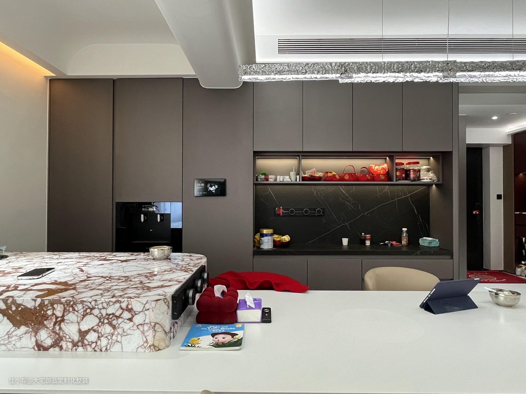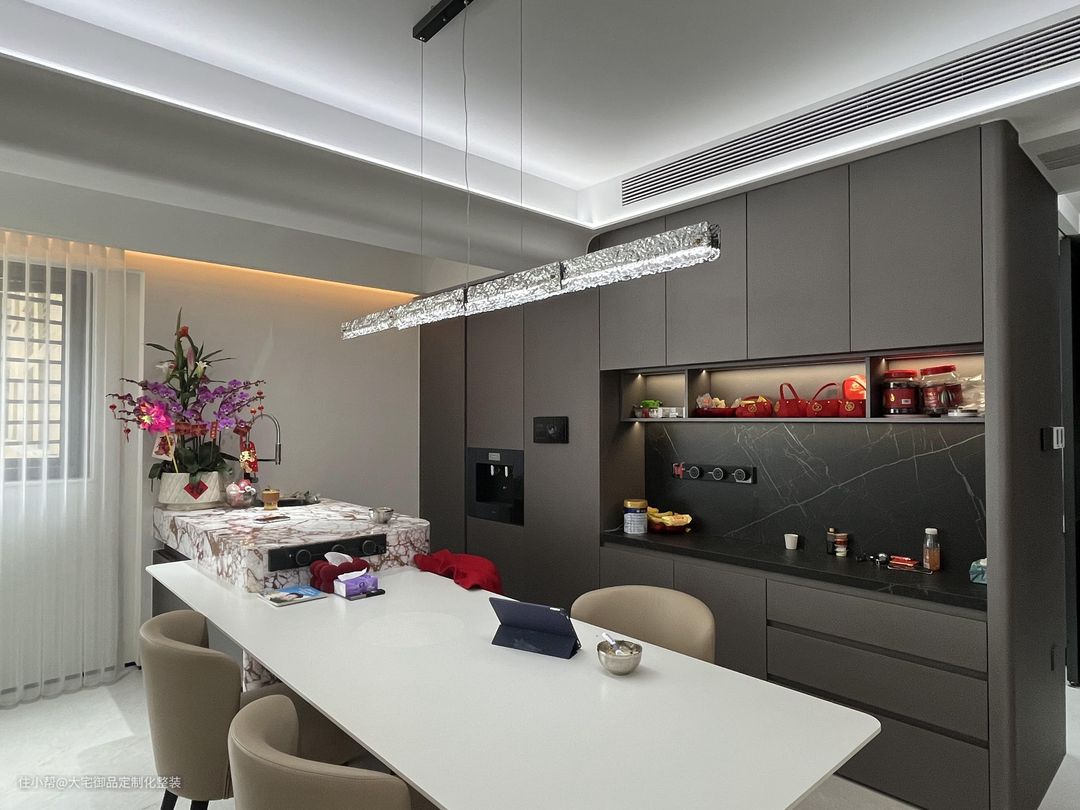 餐厅沿用客厅的色调,墙面采用白色艺术漆,地面采用大理石花纹磨砂砖通铺,搭配直排岩板吊灯,氛围感拉满,餐桌采用白色简约餐桌搭配大理石花纹岩板岛台,美观高级的同时实用性拉满,餐边柜与电视背景墙色调相呼应,采用一整面深棕色定制柜、灯光展示柜和岩板台面代替墙面,提高收纳能力的同时,也更加协调美观,提升就餐环境。客餐厅空间色调和色彩搭配氛围感、设计感、高级感拉满。