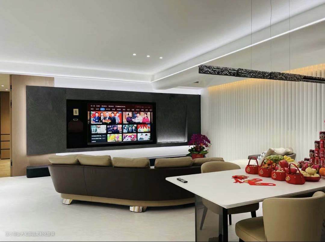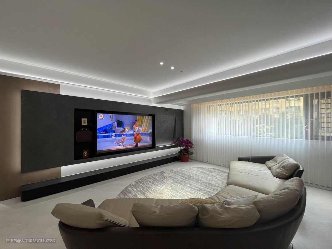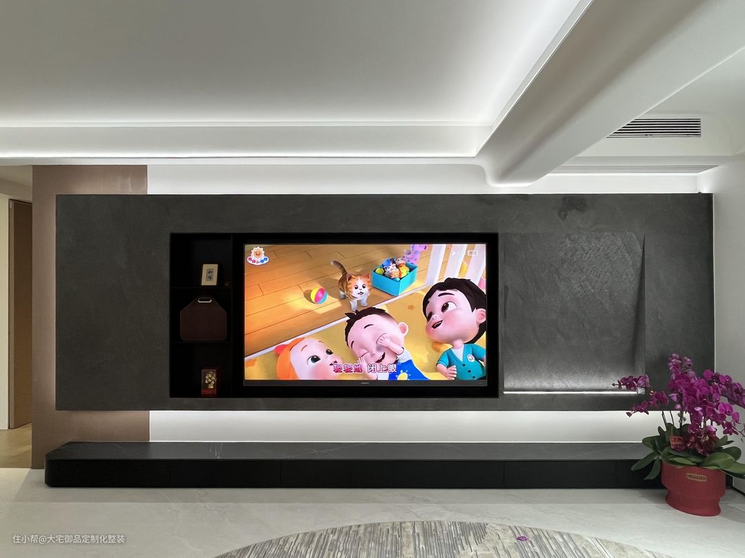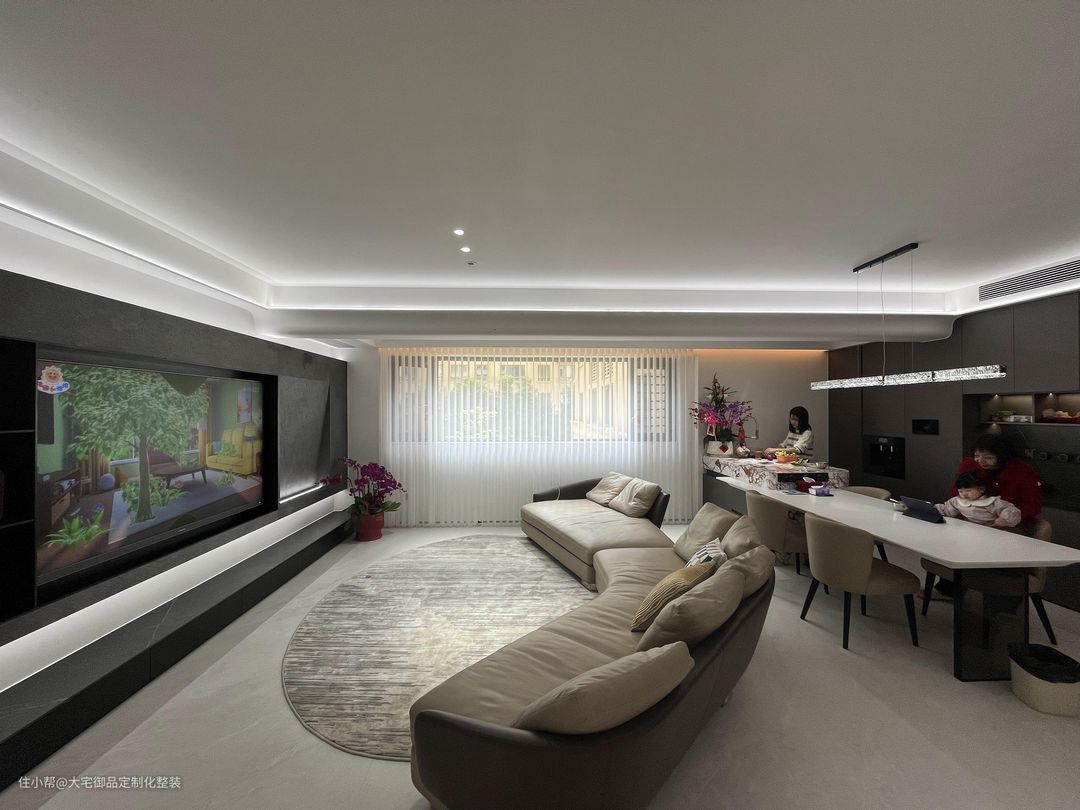 客厅整体采用黑白为主色调,墙面采用白色艺术漆,地面采用大理石花纹磨砂砖通铺,搭配无主灯设计,采用磁吸灯和隐藏式灯带,整体空间明亮整洁,电视背景墙采用黑灰色整块岩板作悬浮式处理搭配隐藏式发光灯带,搭配原木色木饰面板和白色艺术漆打底,增加设计感和质感,整体格调高级沉稳,客厅沙发选用圆弧沙发和地毯,大气实用,大落地窗搭配白窗纱更显氛围感,整体高级协调。