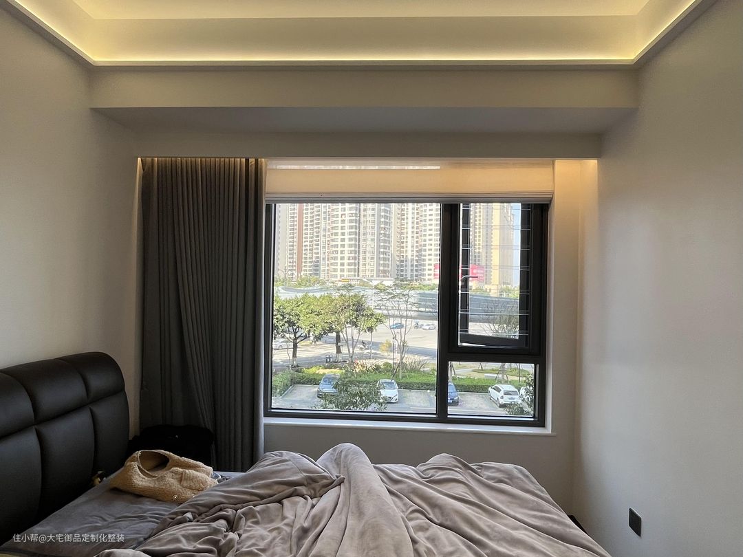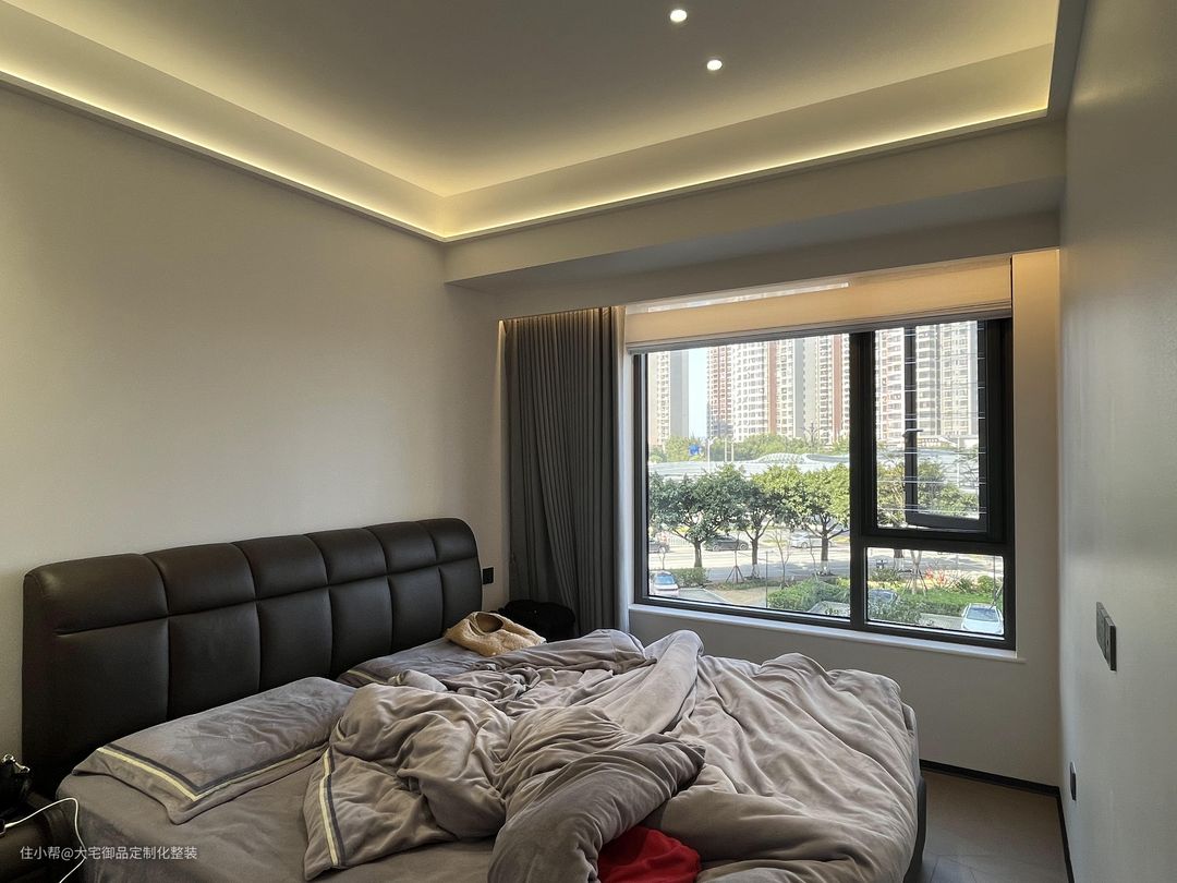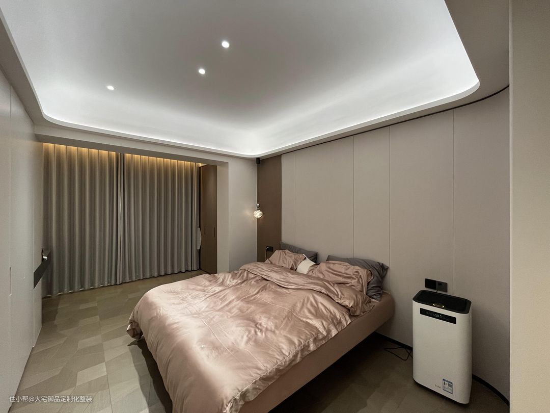 次卧整体采用米白色为主色调,墙面采用米白色艺术漆,地面采用岩板花纹磨砂砖通铺,搭配无主灯设计,采用磁吸灯和内嵌式发光灯带,明亮美观,床头背景墙采用米白色墙纸,窗帘采用深色系窗帘和发光灯带,配合无主灯设计,氛围拉满。