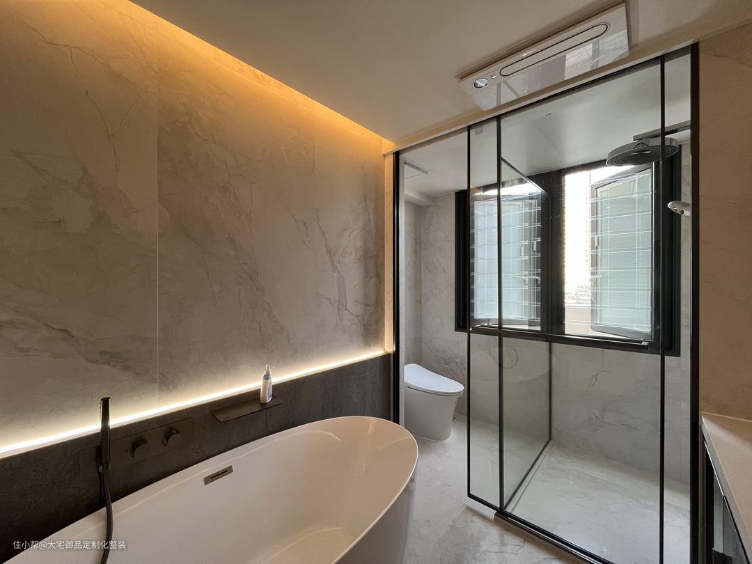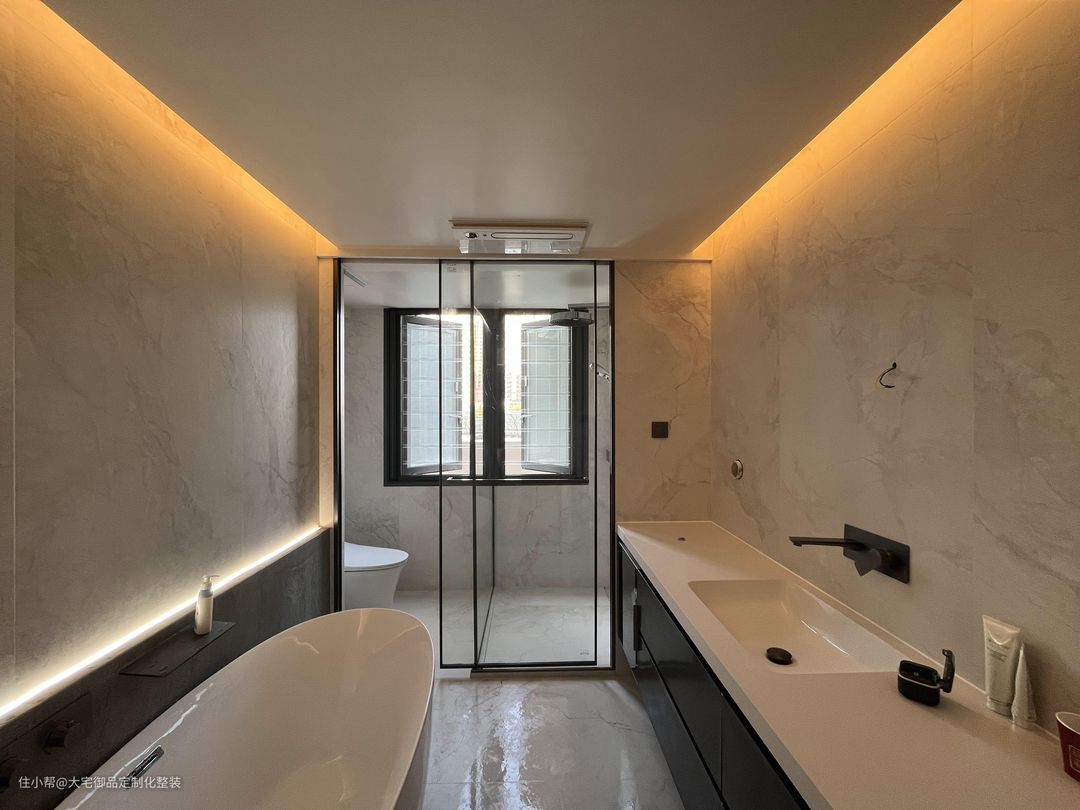 主卫采用无主灯设计,采用两侧隐藏式发光灯带和墙面发光灯带,搭配大理石花纹磨砂砖通铺地面墙面,明亮整洁。搭配浴缸、一体式储物台盆,还设有淋浴区,通过玻璃隔断进行干湿分区。