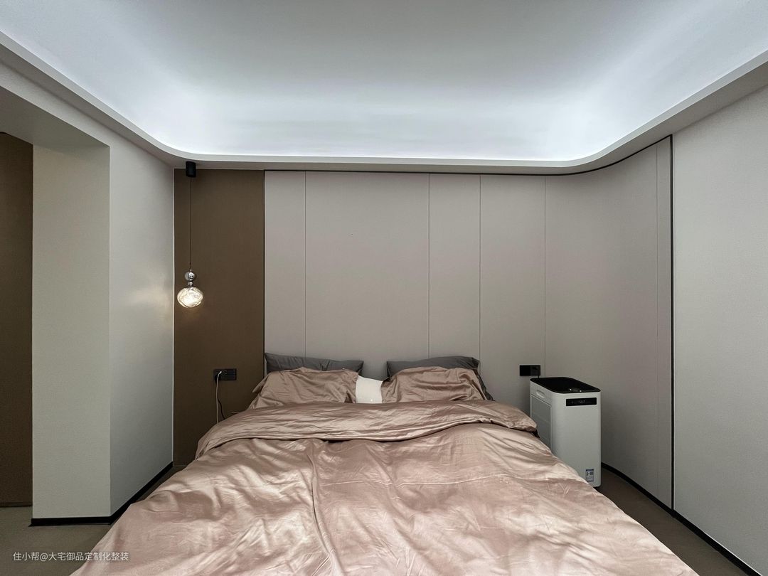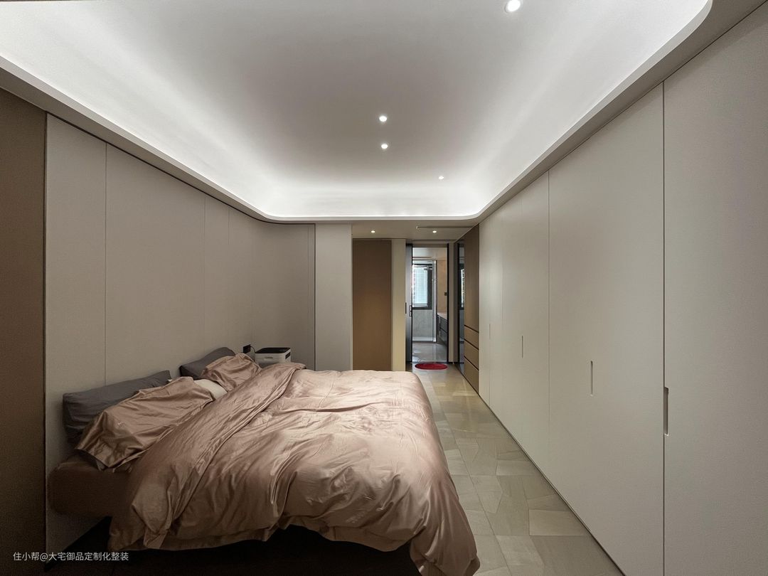 主卧整体采用浅色为主色调,墙面采用米白色艺术漆,地面采用岩板花纹磨砂砖通铺,搭配无主灯设计,采用磁吸灯和内嵌式发光灯带和床头小吊灯,明亮美观,床头背景墙采用浅色和棕色护墙板拼接,设计感拉满,不显单调,床尾采用整排浅色系定制柜、灯光展示柜,代替墙面的同时,色彩协调、收纳能力极强,搭配同色系窗帘和发光灯带,氛围感拉满。