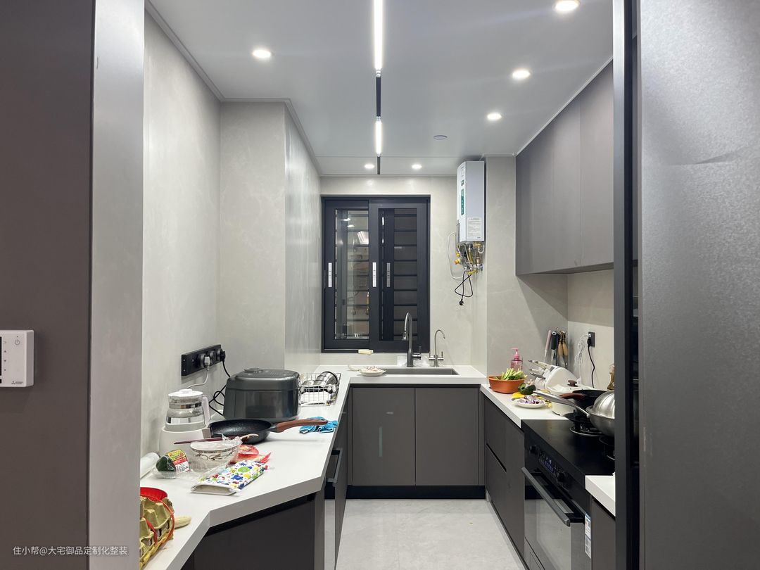 厨房采用灰白为主色调,墙面通铺白色哑光防滑瓷砖,地面采用大理石花纹磨砂砖通铺,采用无主灯设计,操作台采用U型设计,整体明亮整洁,搭配灰色定制吊柜提高收纳能力的同时使得空间色彩协调。