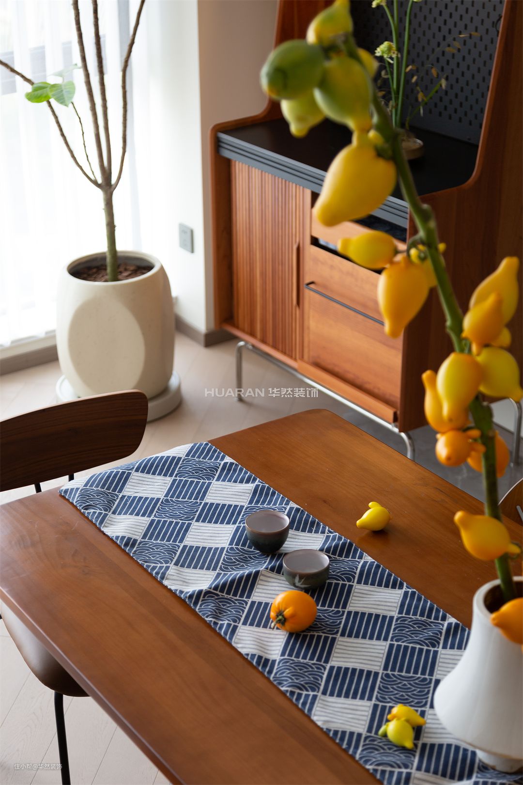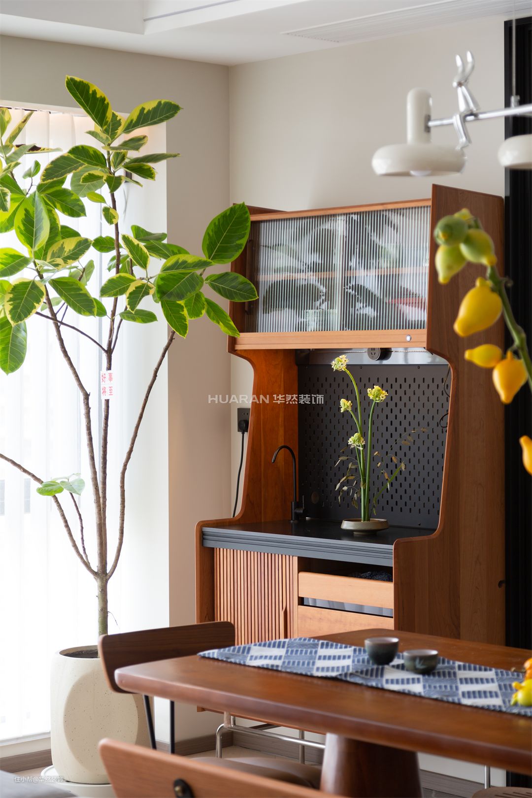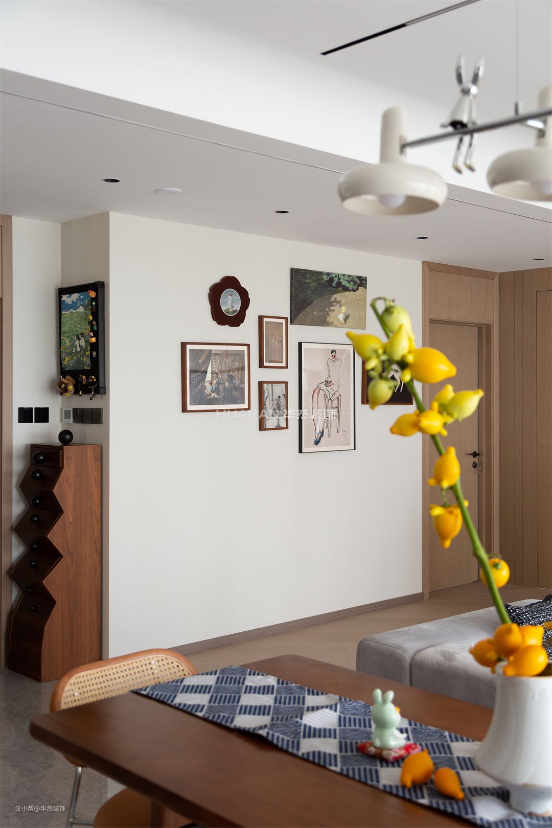 客厅与餐厅空间的衔接与交融 将整个空间舒展开来 创造出开放且自由的生活情境 让居者能以更加松弛 慵懒的姿态在这里游走 长条餐桌的设计,配以温暖灯光 构建出规则的秩序美感 承担起一家人亲密无间的四时三餐 也成为三口之家情感交融的岛屿 绿植的清醒自然之气,扑面而来 顺势置入胡桃木餐边柜,增加收纳空间 赋予餐厅空间层次感与轻盈感 和谐的融于这方寸之地