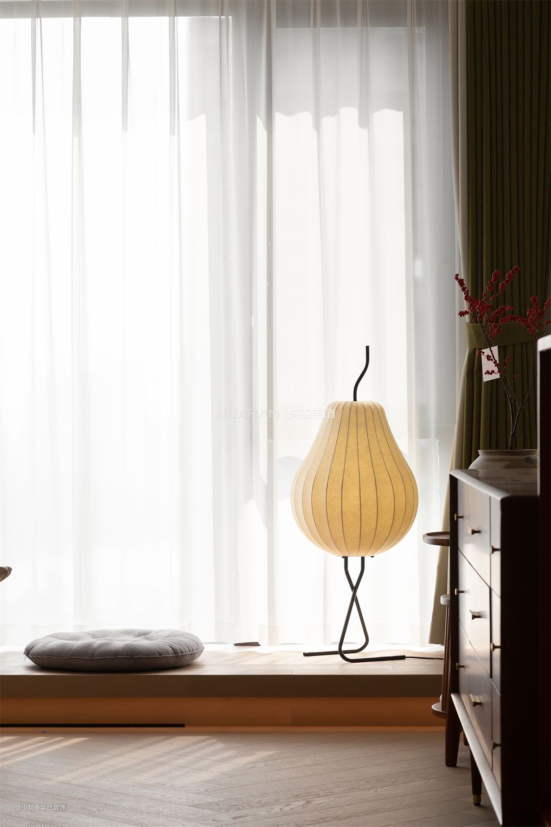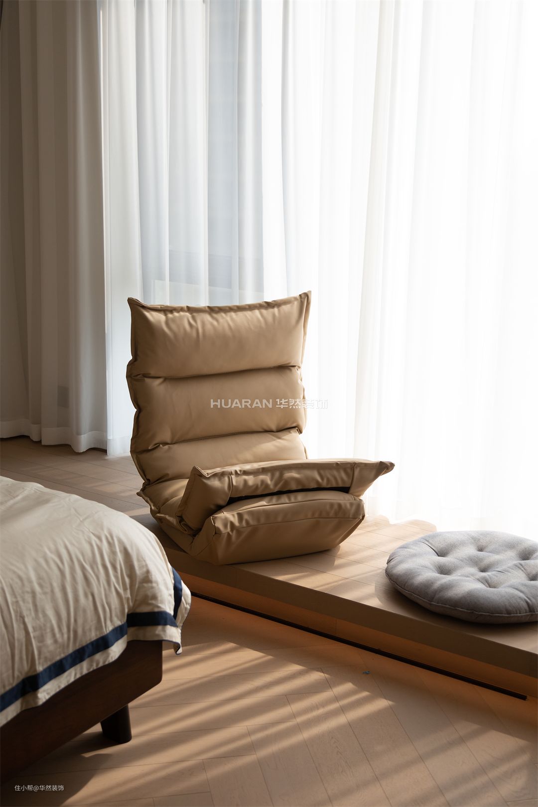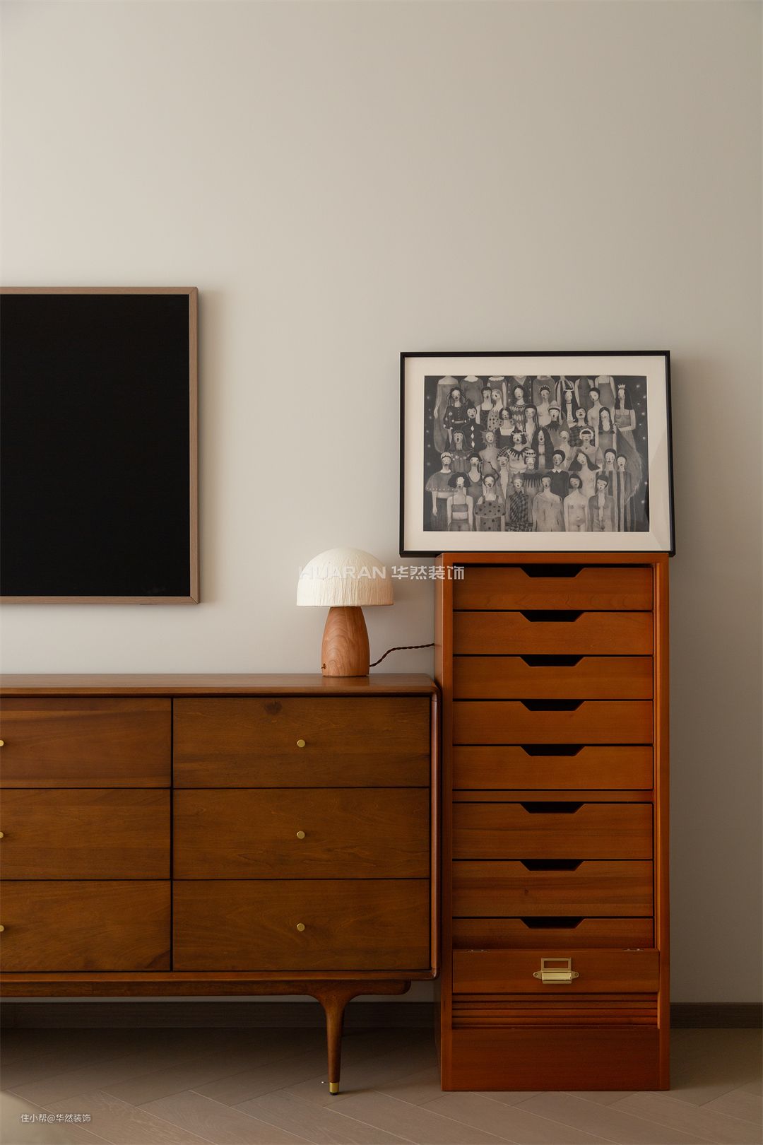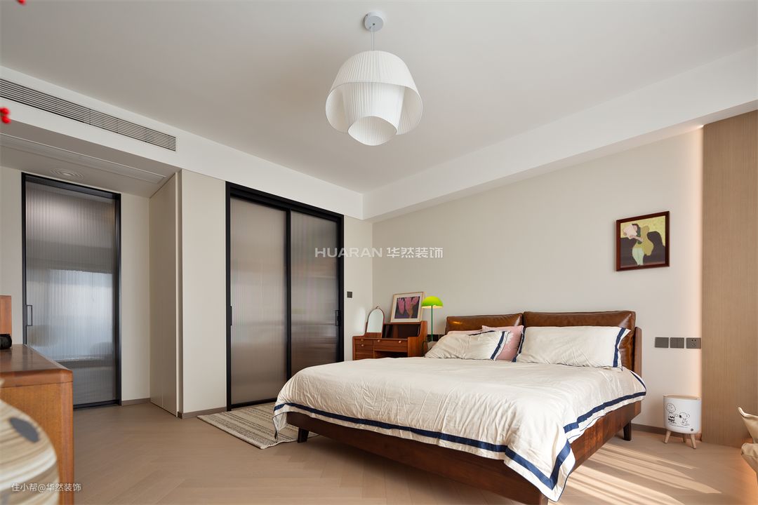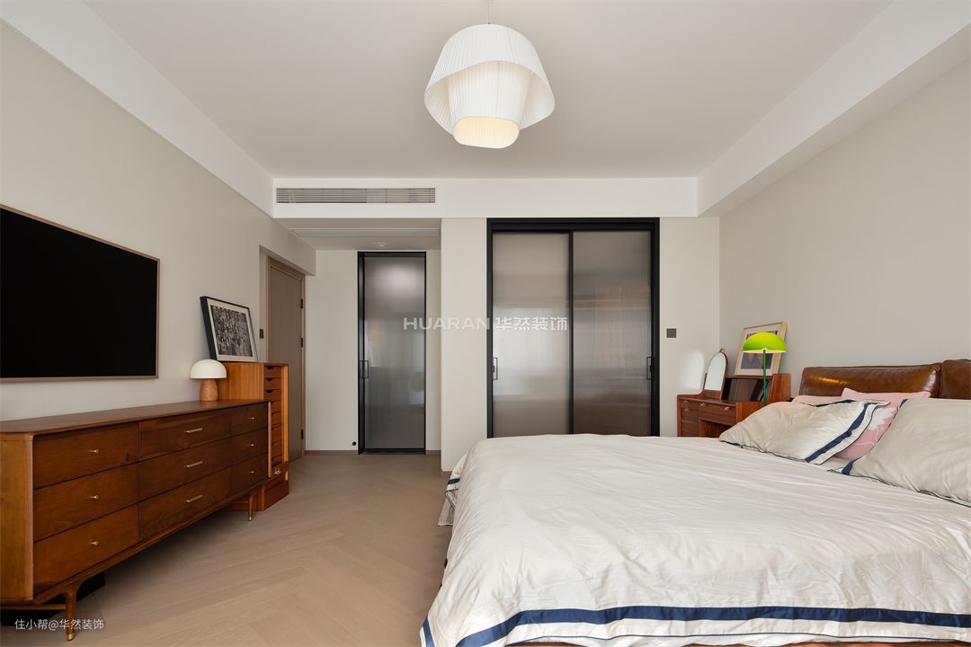 温和的白,成为贯穿空间的灵魂 主卧无需过多润色与繁复装饰 仅以素雅色块、温润材质、柔软床品等彰显层次 打造出空间的温柔质感 地台的构建是一个让人心生安宁的空间 在这里共享静谧与怡然的时光 柔和灯光嵌套于木质质朴的底色中 材质与情感交融,勾勒出结构之外的情感空间 为居住者带来独特的精神回响 为获得更大的尺度感和空间感 取消卧室中的大篇幅的衣柜 选择细脚原木斗柜,独特又轻盈