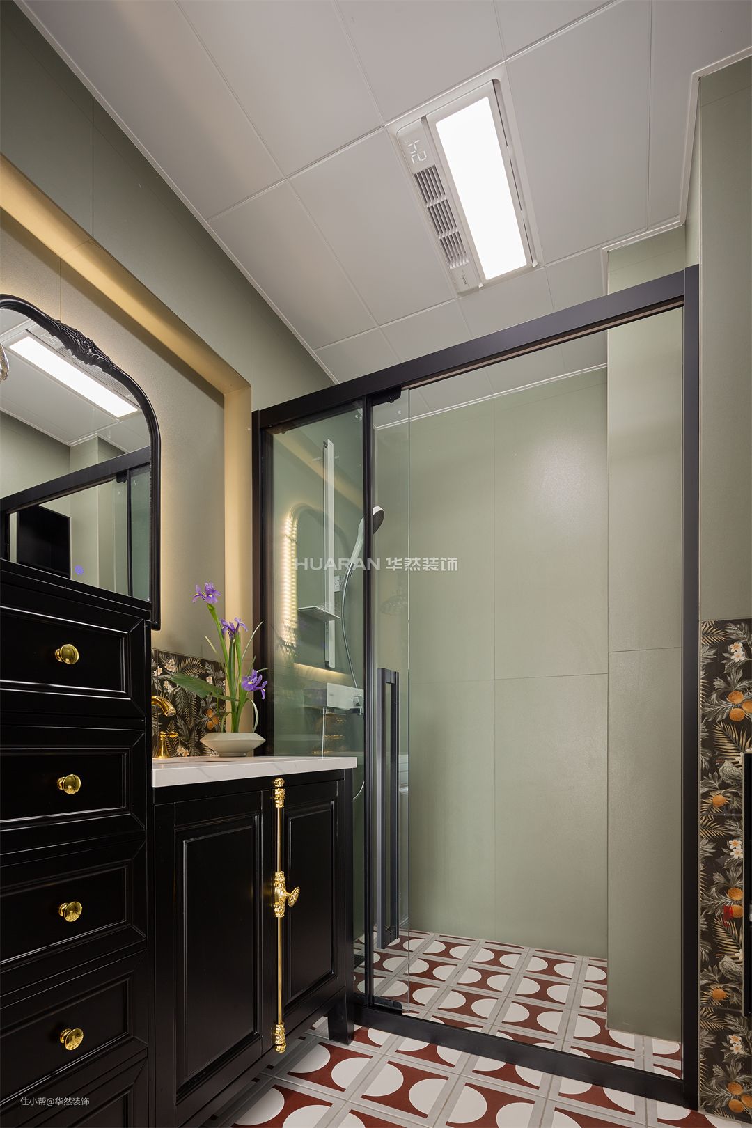 红色瓷砖搭配绿色磨砂墙面瓷砖 交错纵横之间,兼具了中古风与现代时尚的神韵 局部复古绿色的花墙壁又如同置身老电影里的场景 视觉极具丰满