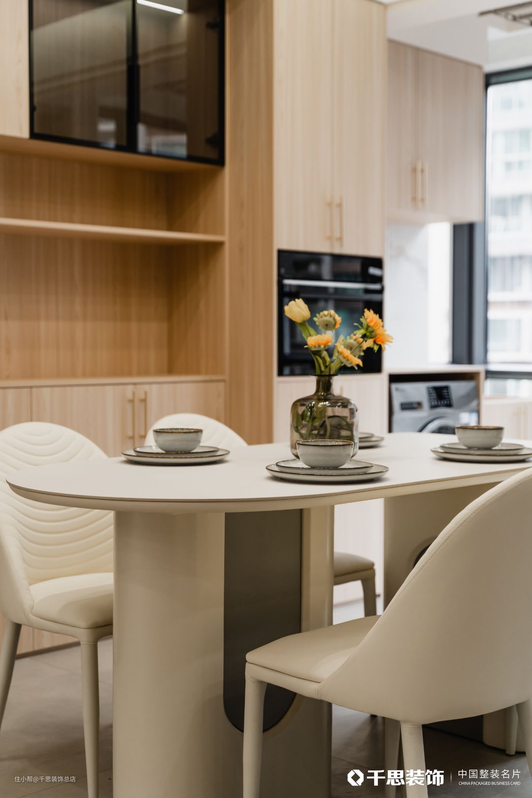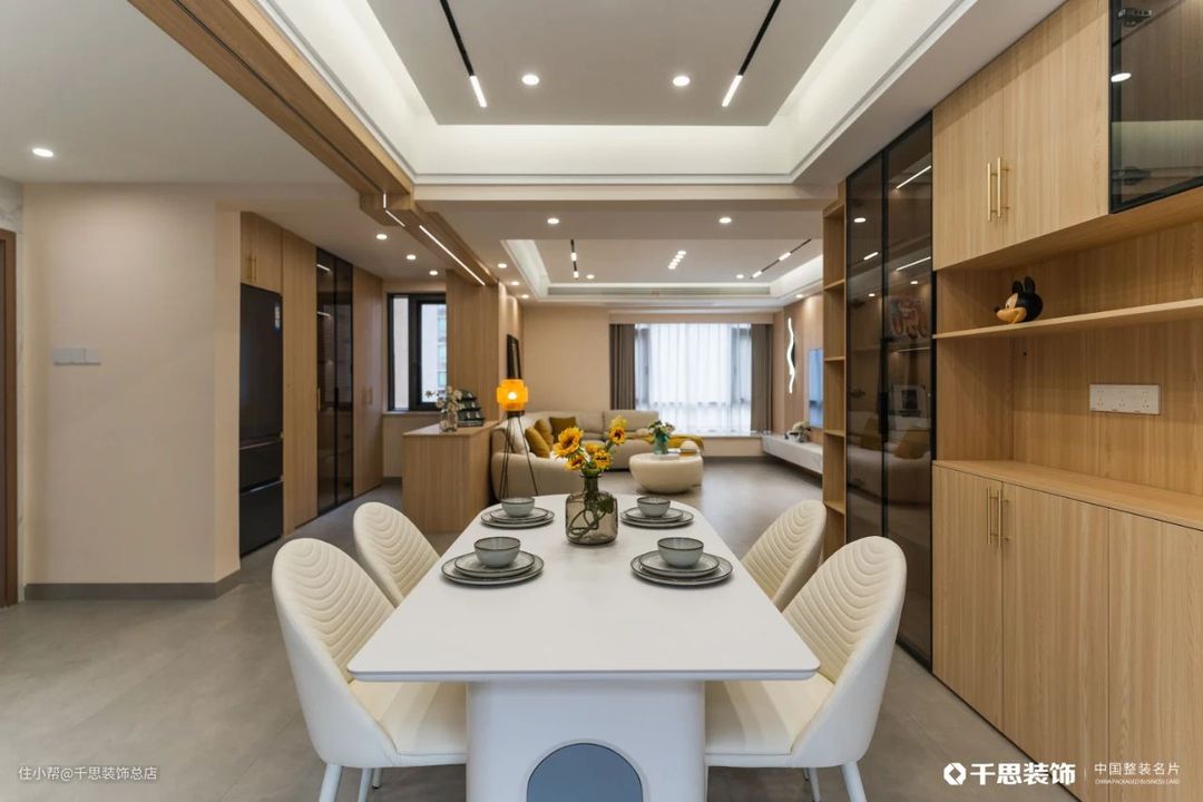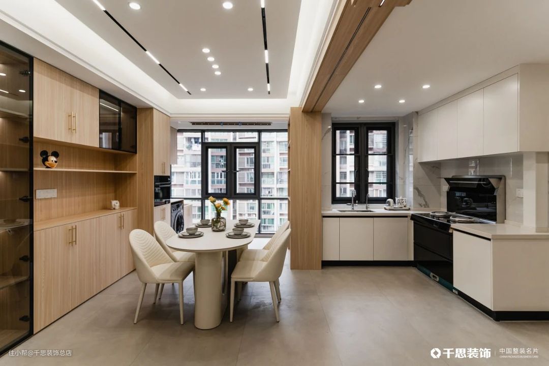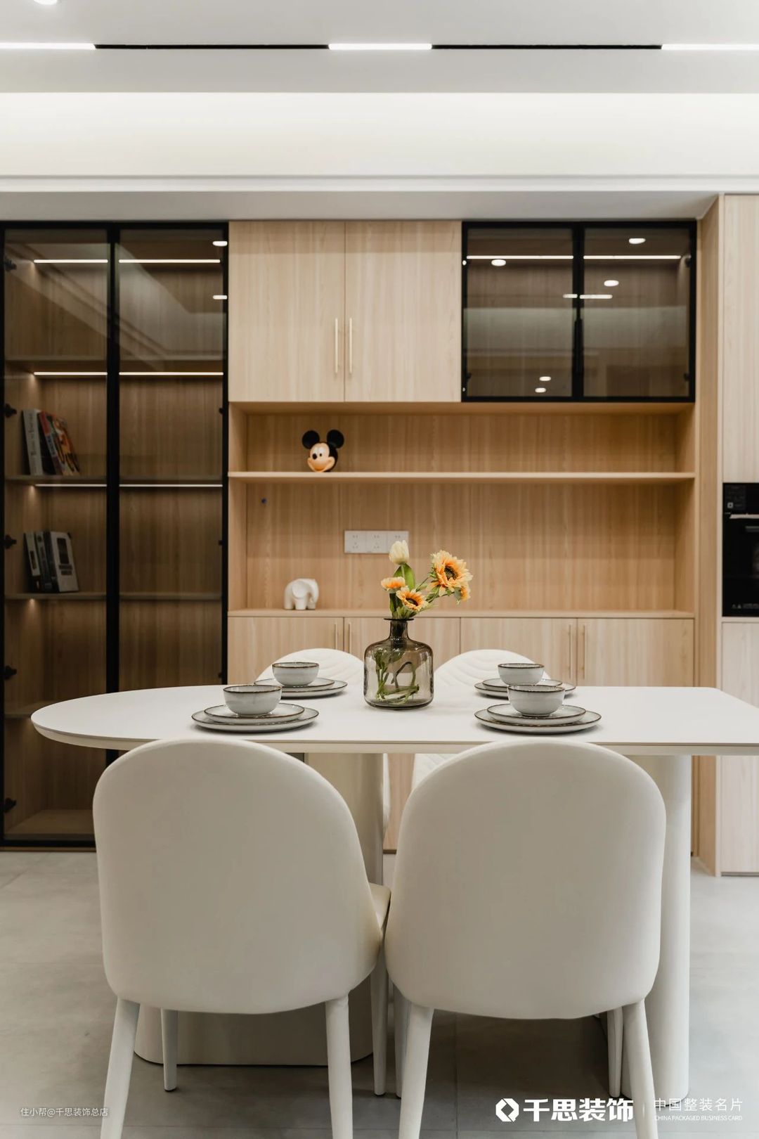 素雅的岩板白餐桌椅,照亮欢愉用餐时刻;木色横梁与块面贯穿整体,哪个视角看过去都有呼应。