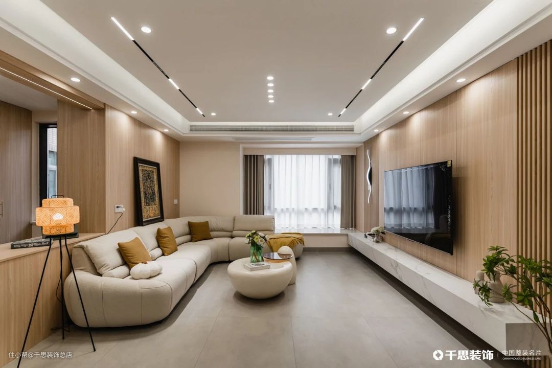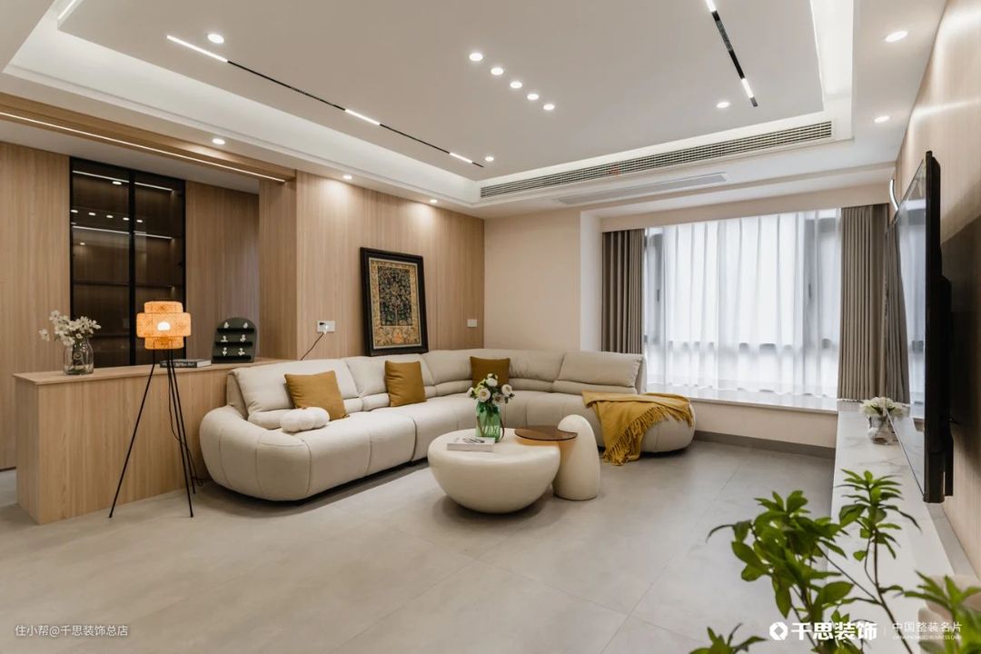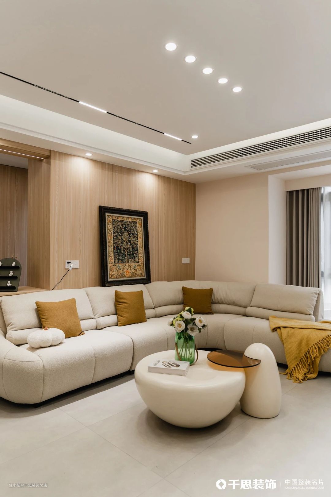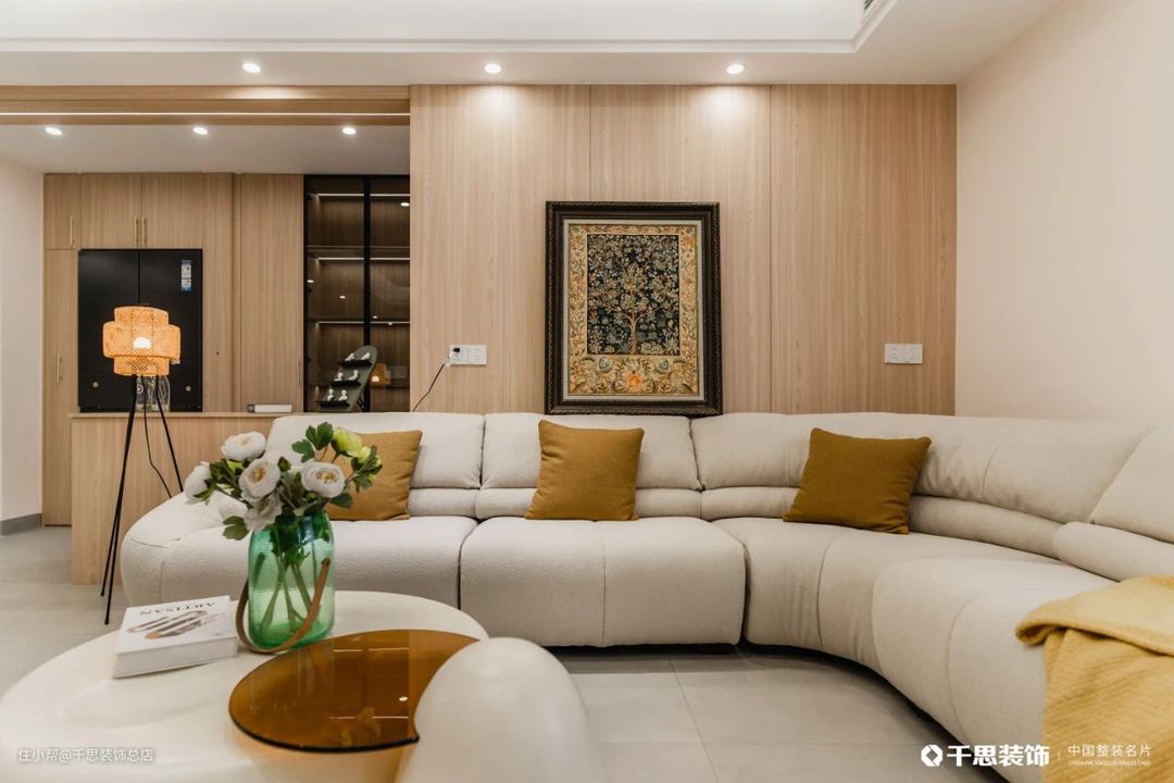 冰箱有序嵌入高柜中,侧面释放厨房压力;电视墙以木饰面打底,配合极简悬空地台,展现质朴温馨的腔调;抱枕、盖毯、装饰画,选取明亮却不跳脱的芥末黄色系,并不繁杂却依然能强化家居氛围;软糯的弧形转角沙发与组合圆几轻盈可爱,高低错落间层次拉满。