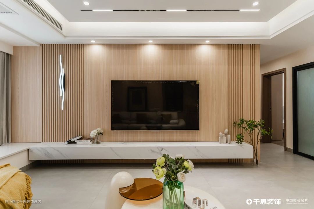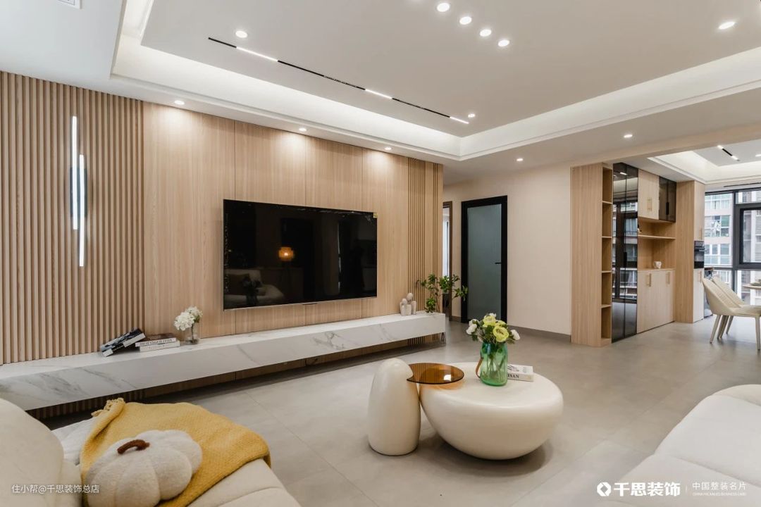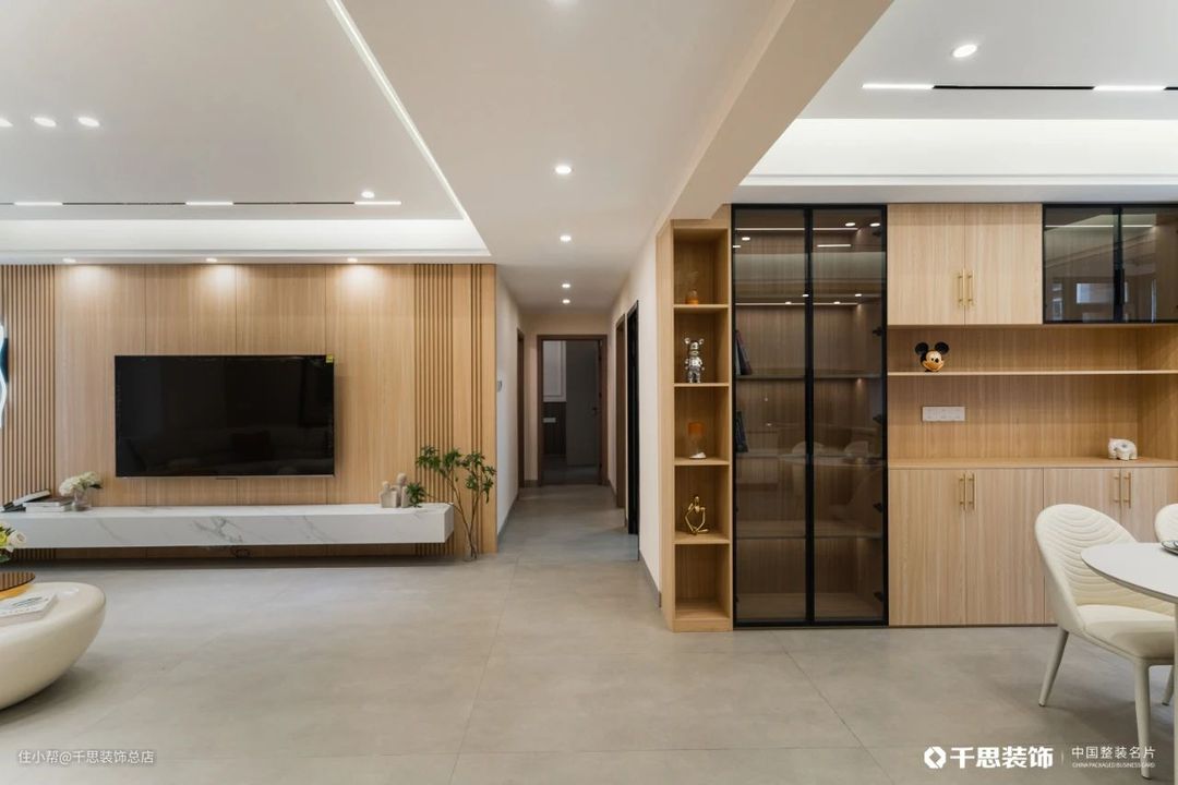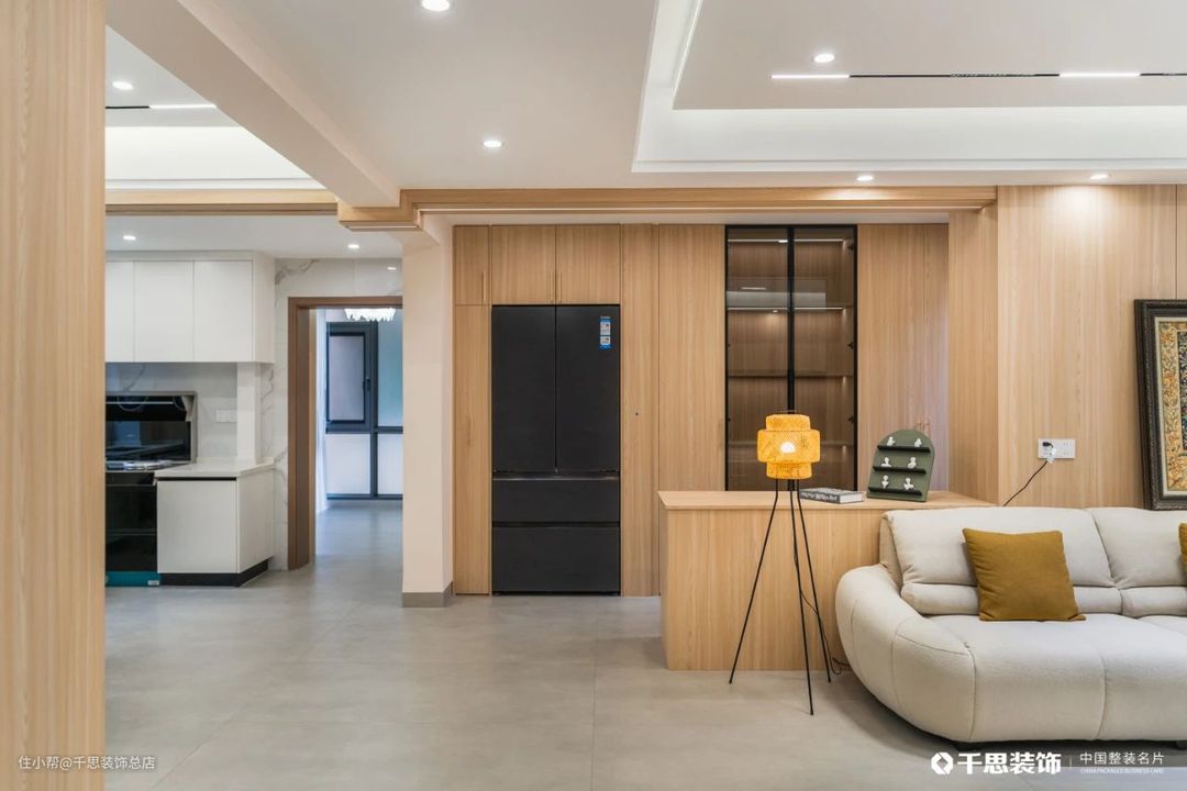 转入客厅,色调温暖,线条流畅,悬浮吊顶+无主灯布局大气感满满,让空间充满质感;木饰面护墙板与木色收纳柜前后围合,将客厅包裹在原木的清芬中;将小户型原本的储物间打通,拆掉隔墙以木质吧台代替,连通客厅,拓展视野,空间感瞬间翻倍!