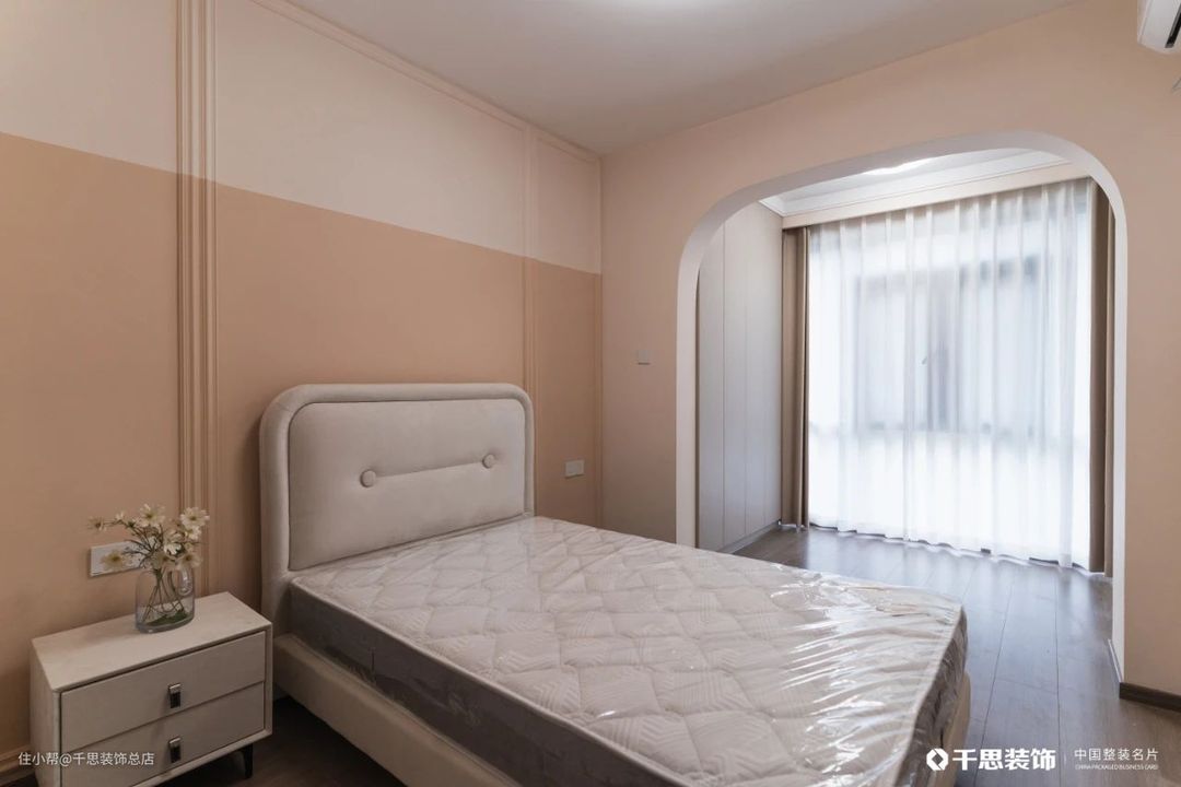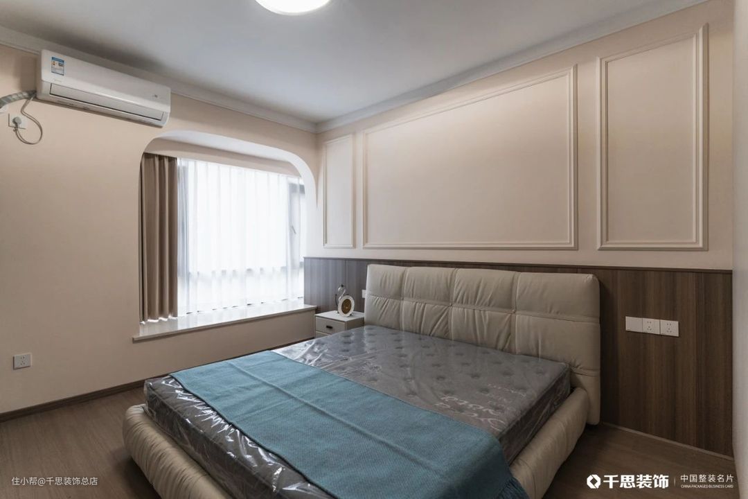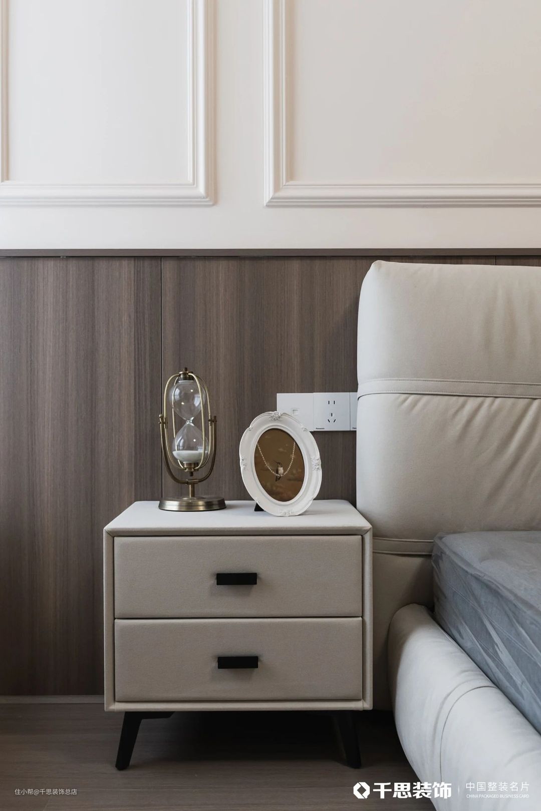 主卧雅致静逸,用木饰面和墙漆拼色修饰背景墙,并辅以pu线条点缀,呈现低调的高级。