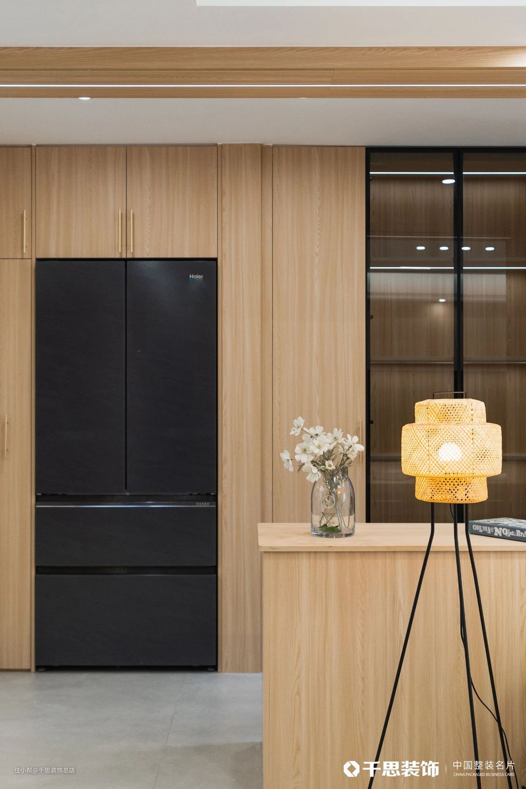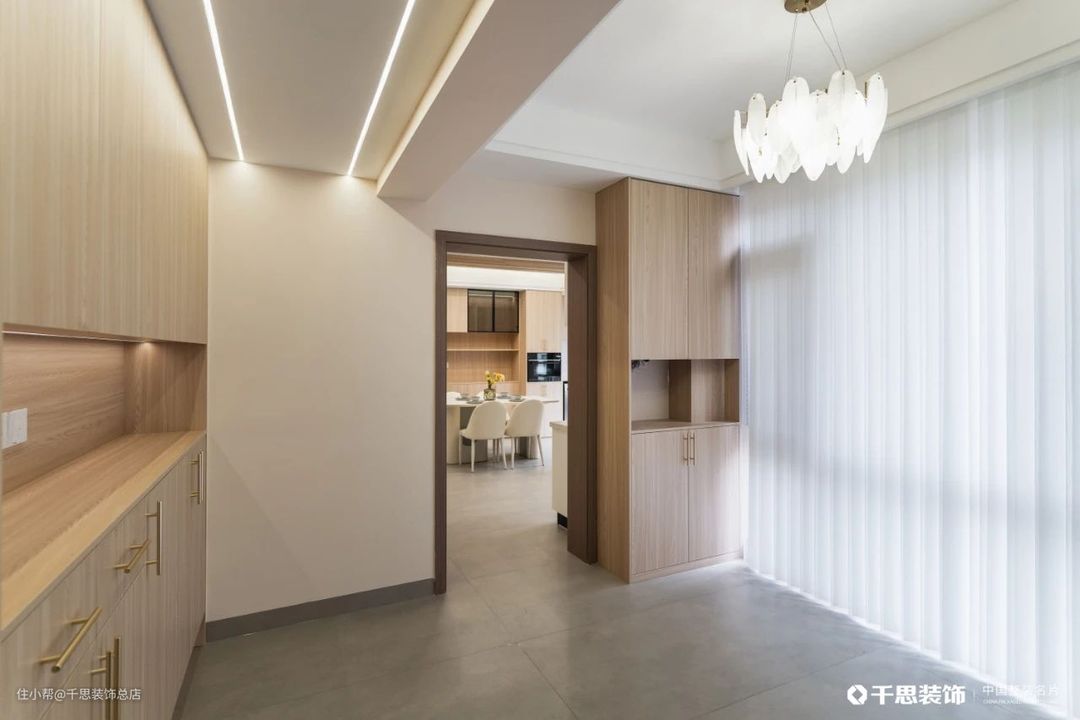 拆掉原大户型的隔墙及入户门后,玄关错开了正对主卧门的尴尬位置,流畅的筒灯下,过道沉静大气。