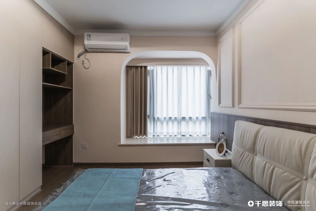 床尾满柜并在端侧留出梳妆台的空间,也避免涩滞的闷重感。