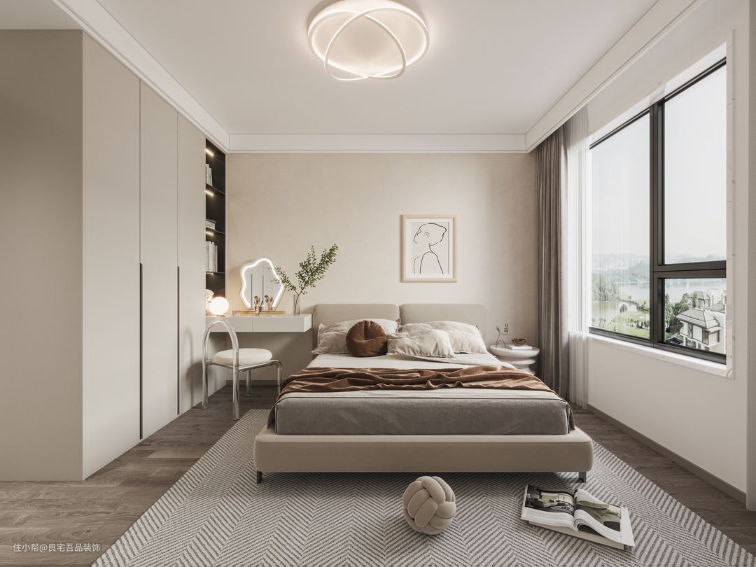 卧室的设计很简单,用类似瓷砖的灰色原木通铺地面,营造简约的氛围。为了增加储物面积,特意打造了通顶柜,无拉手设计很简单,从衣柜处延伸出一个台面作为简单的书桌,在这里可以办公也可以化妆打扮,充分了利用了转角空间。