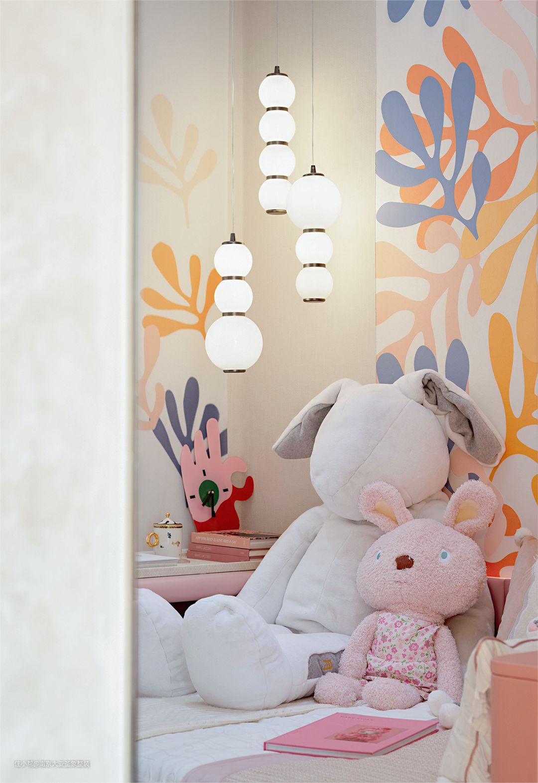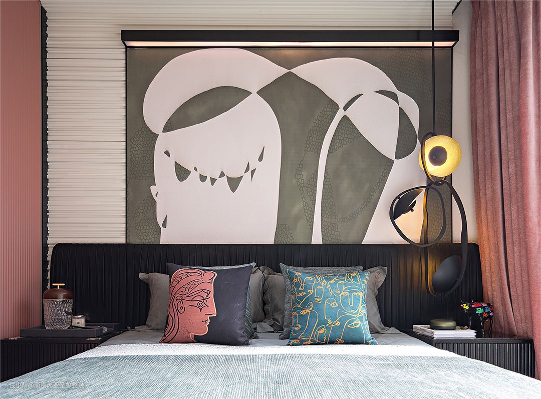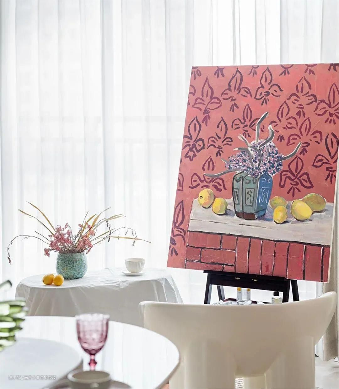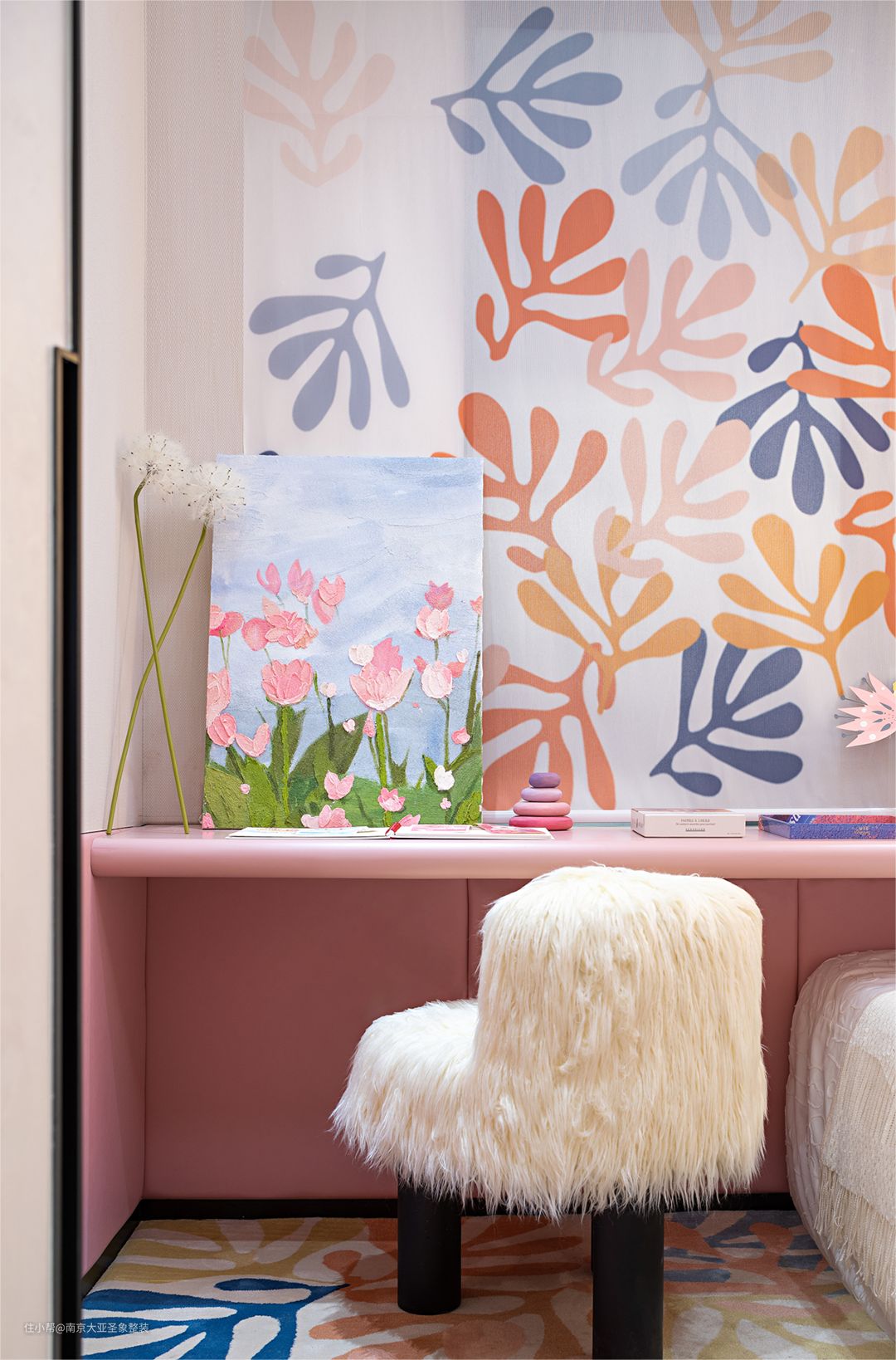 卧室区域以暖色调为主 搭配抽象画以及多种装饰物 卧室的每一个角落都浪漫的刚刚好 彩色珊瑚墙+粉色书桌 还有一把毛绒绒小椅子 不好意思哈 我要开始我的艺术创作啦