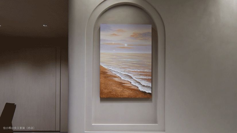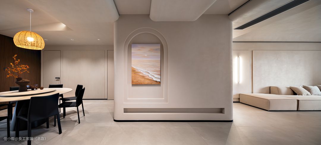 入户即见微水泥墙面斑驳的质感,精巧细腻的拱门搭配一幅色彩柔和的风景画作,形成极简的造境,让全屋的质朴意境缓缓呈现。