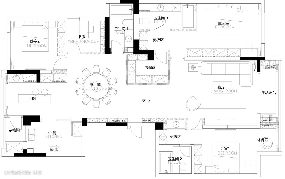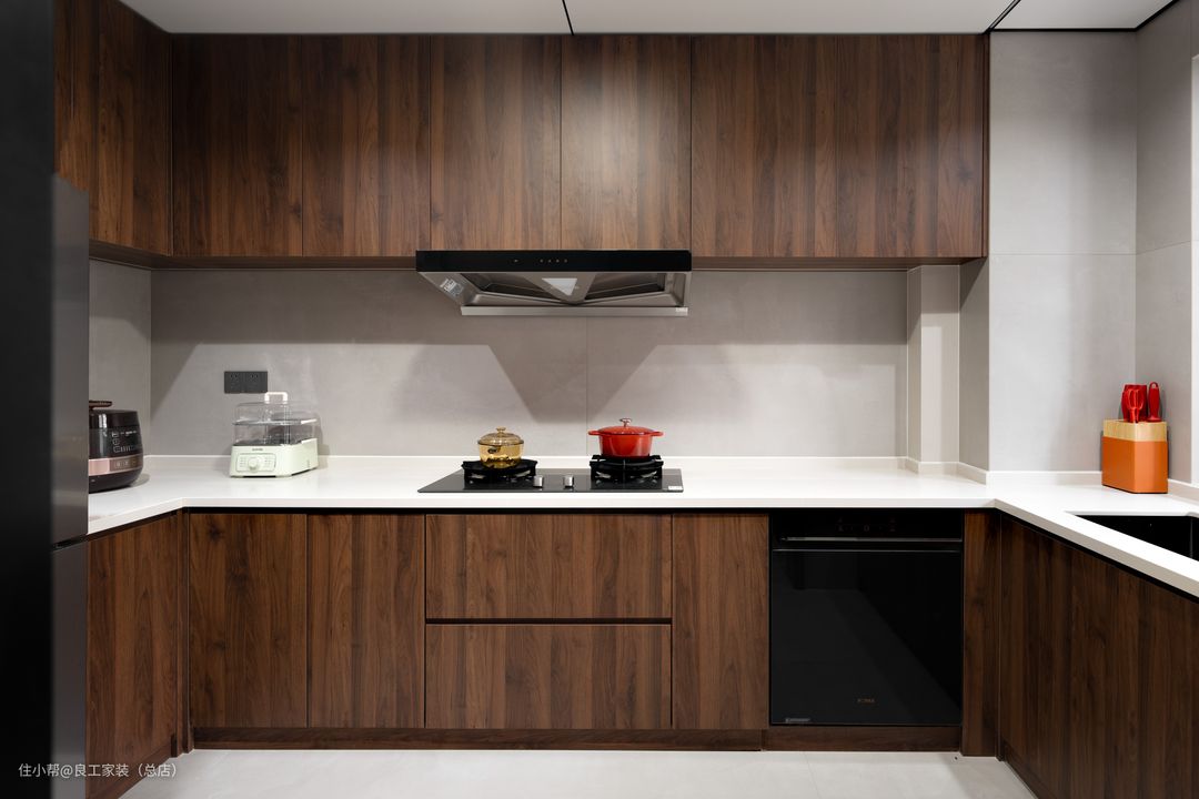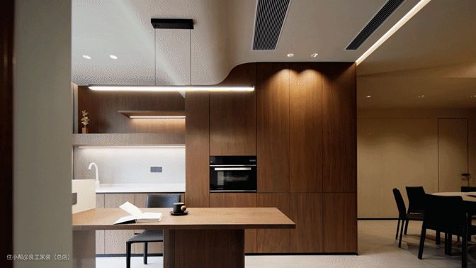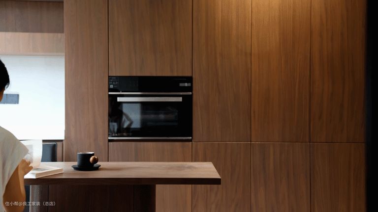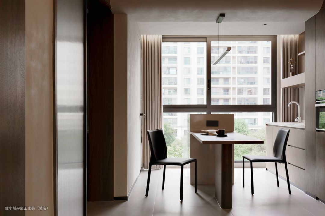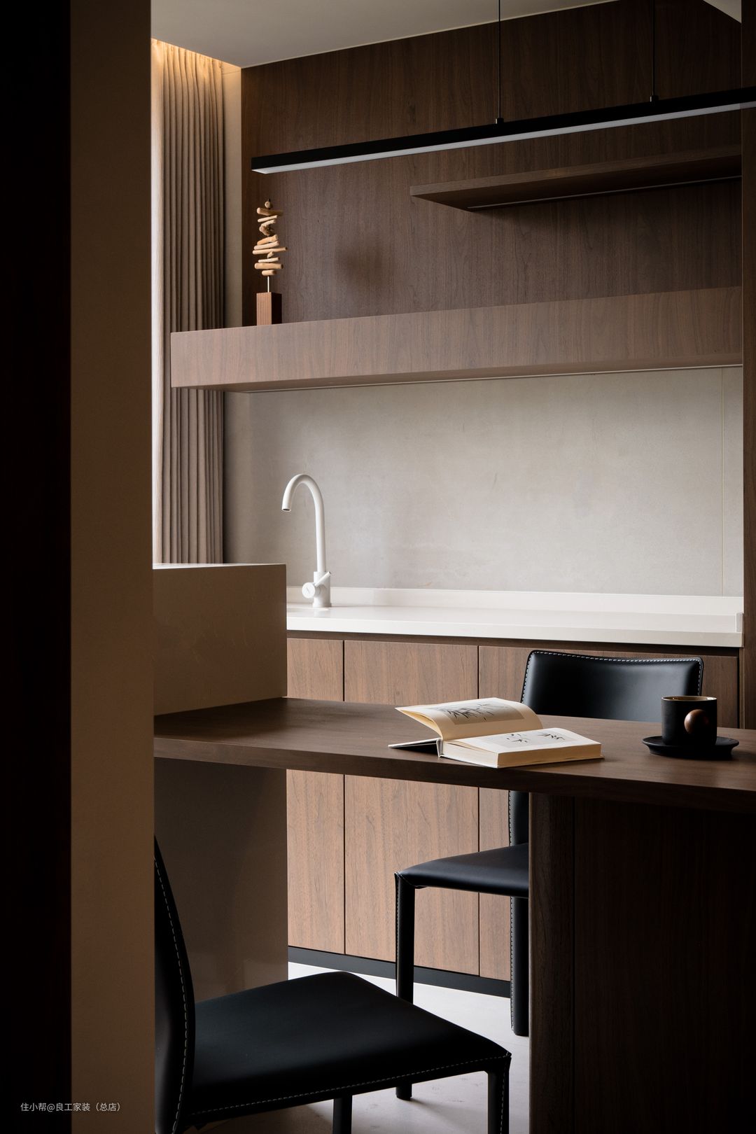 在原本的西厨空间里增设餐桌, 打造成西餐厅布局。岛台与餐桌一体式设计,餐厨空间的功能变得更为多元。这里不仅是舒适的就餐区域,亦可作为阅读、办公、下午茶的舒适场所。餐厨区域柜体全部采用了木饰面,纹理自然,色泽浓郁,温润厚重的质感为空间注入了静谧安然的气度。中厨空间也选择贴合自然的木质橱柜,淳朴清新的木纹低调不失质感。U型的布局让操作动线流畅舒适,也在空间利用上实现了最大化。