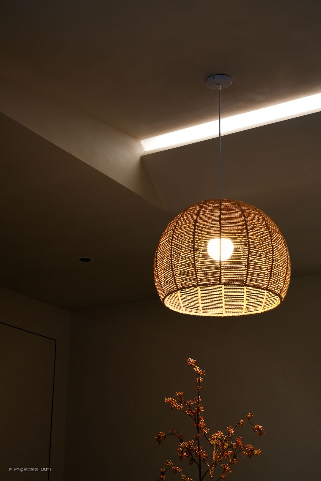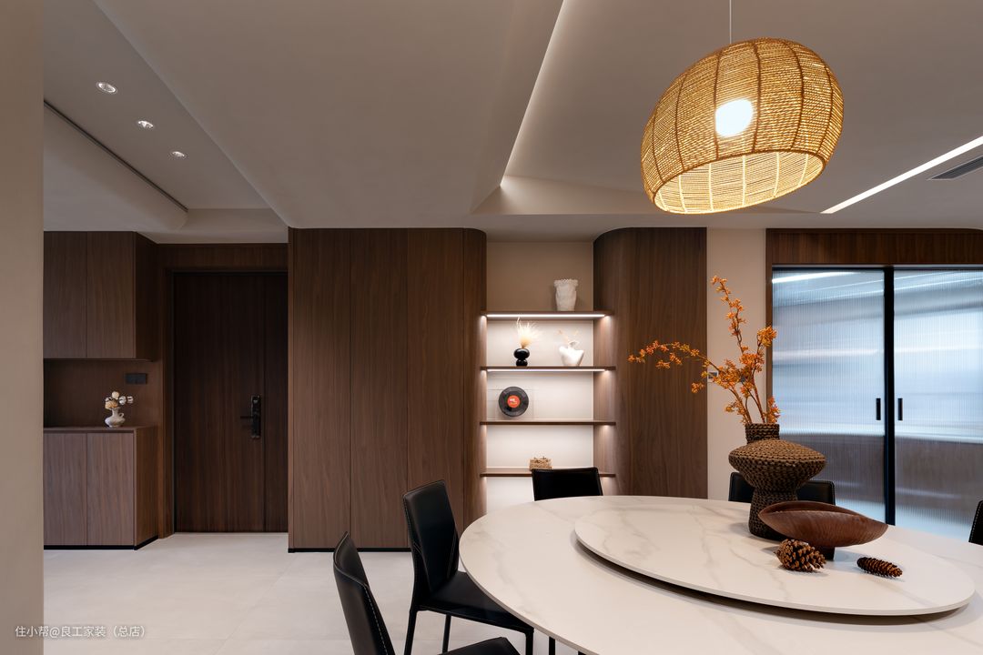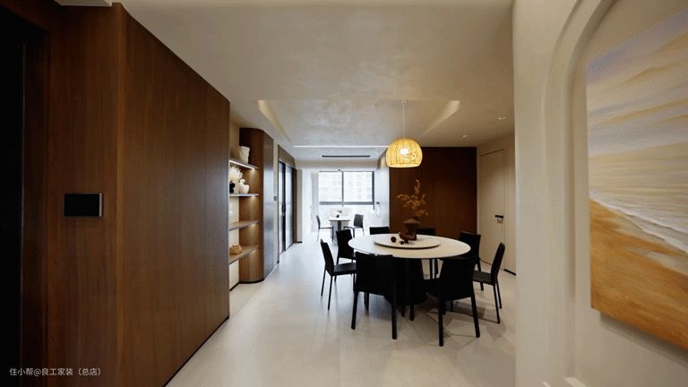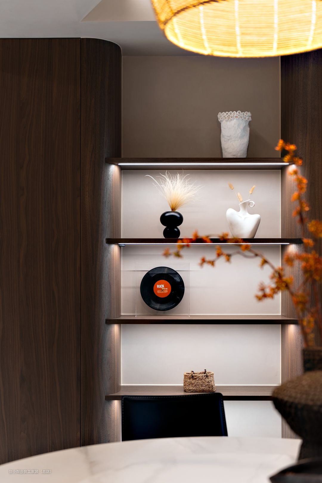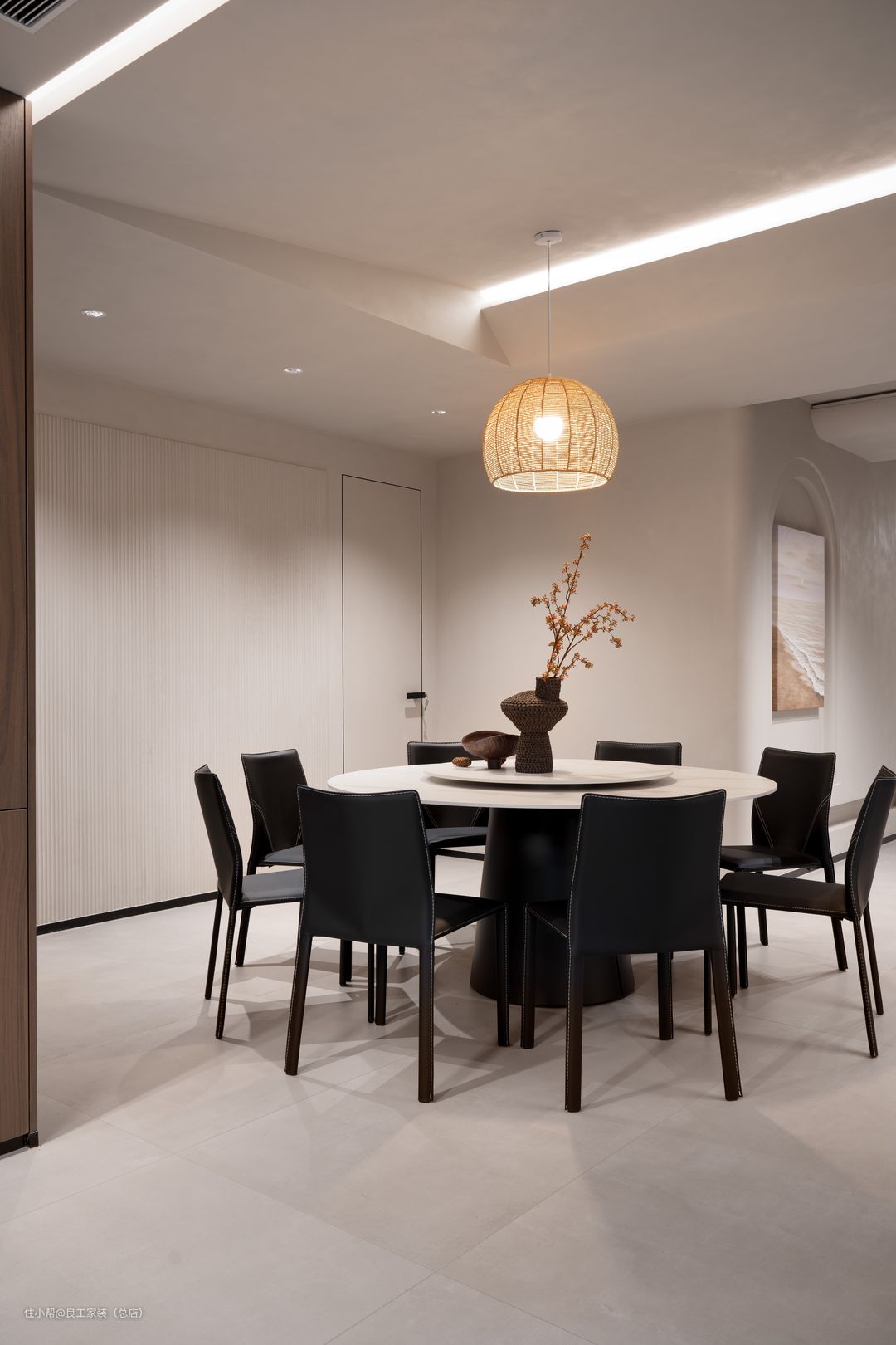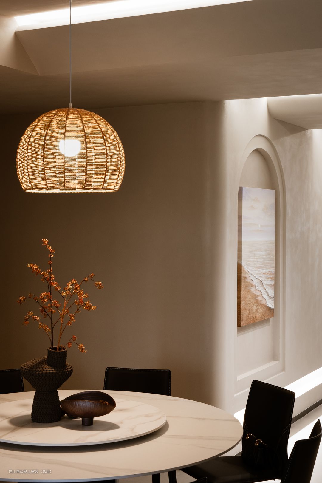 穿过玄关步入餐厅,抬眼即见丰富的光影系统、古雅的装饰器物,以淡化之力烘托,悄然营造出静谧、自在、温馨的就餐空间。从空间布局到装饰细节,每个停顿驻点,都会让人引发无限的猜想,不着痕迹地吸引着人的视线。白色大理石圆桌温润如玉,既满足动线的环形,也与空间里的弧面造型彼此呼应。寓意团圆美满的圆桌,也为清冷的侘寂风注入了融洽温馨的氛围感。