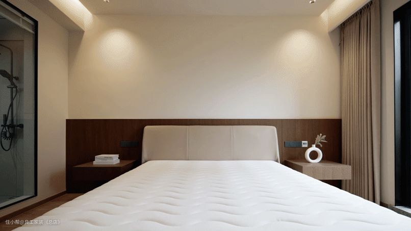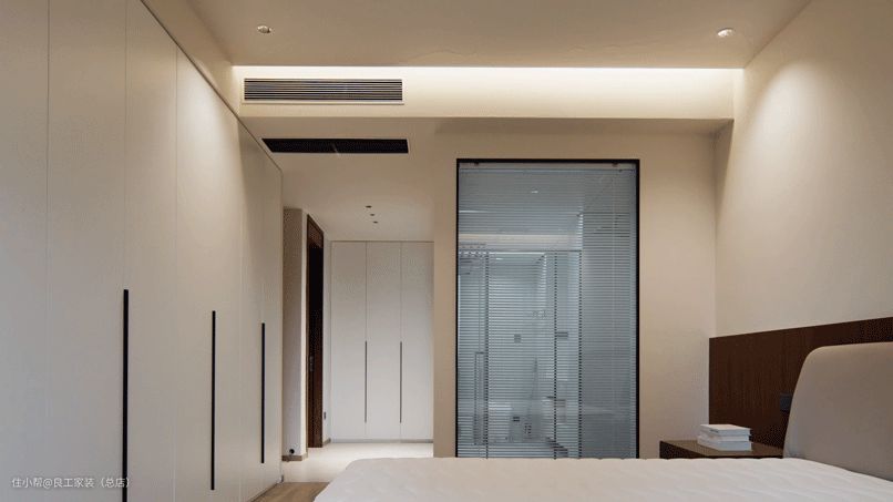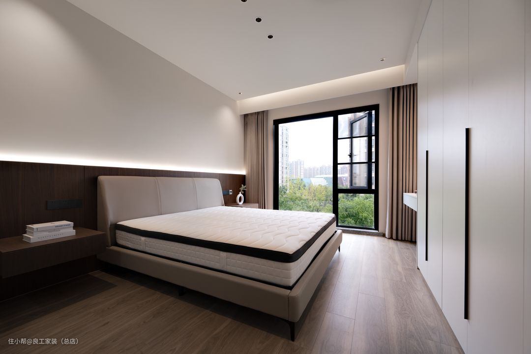 主卧沿用了公区极简的基调,素雅的配色将静谧氛围烘托到了极致,阳台打通后,让空间敞阔度和采光度都变得更佳。床头背景墙局部加入木饰面,与留白形成深浅映衬,空间层次更为丰富。嵌入氛围的灯带,光影渐变,温柔也随之而来。全屋定制柜体打造出充裕的到顶柜体,白色柜面清爽干净,大容量的储物空间保证居室的整洁有序。