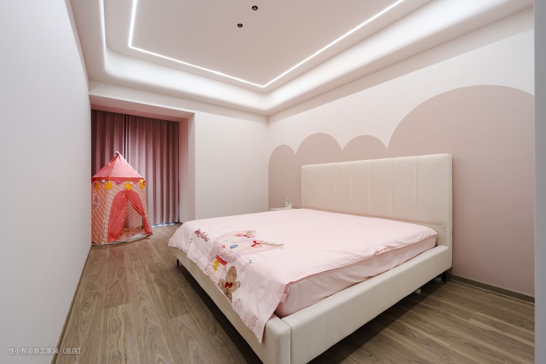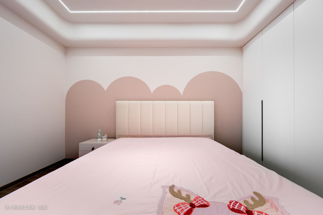 儿童房主要以明媚的色彩营造活泼的基调,柔和的粉色渲染出娇嫩可爱的氛围,背景墙特意设计出软乎乎的粉色云朵造型,尽显轻盈童趣。