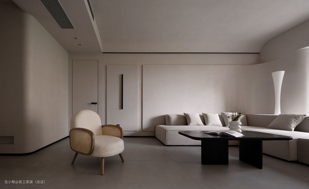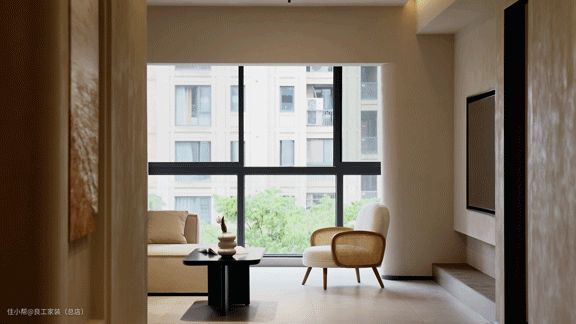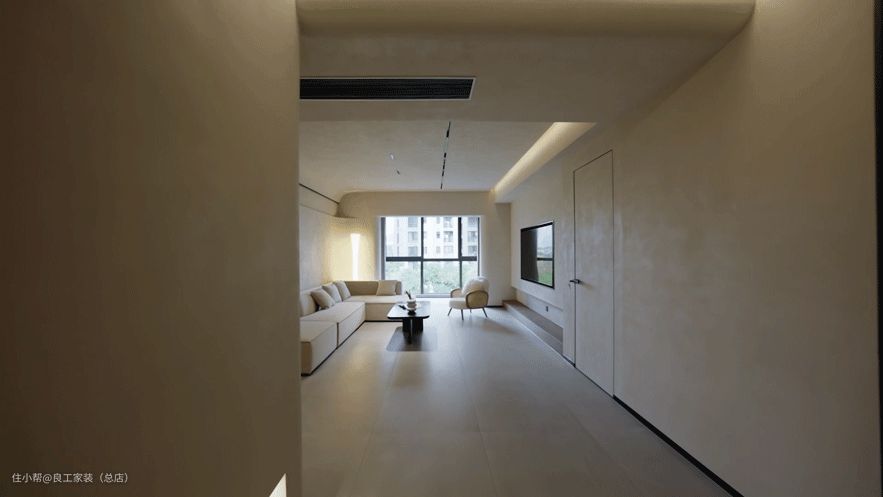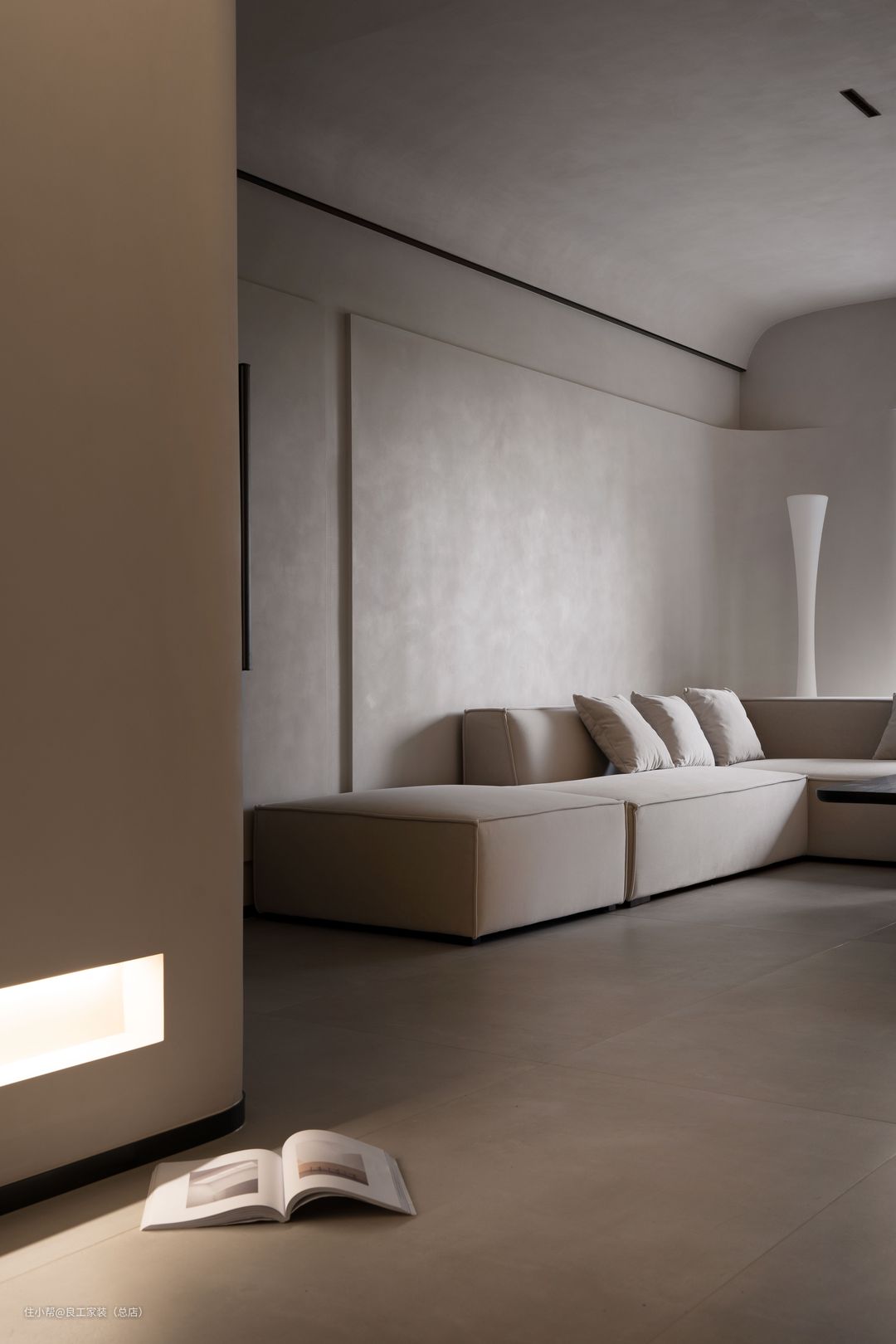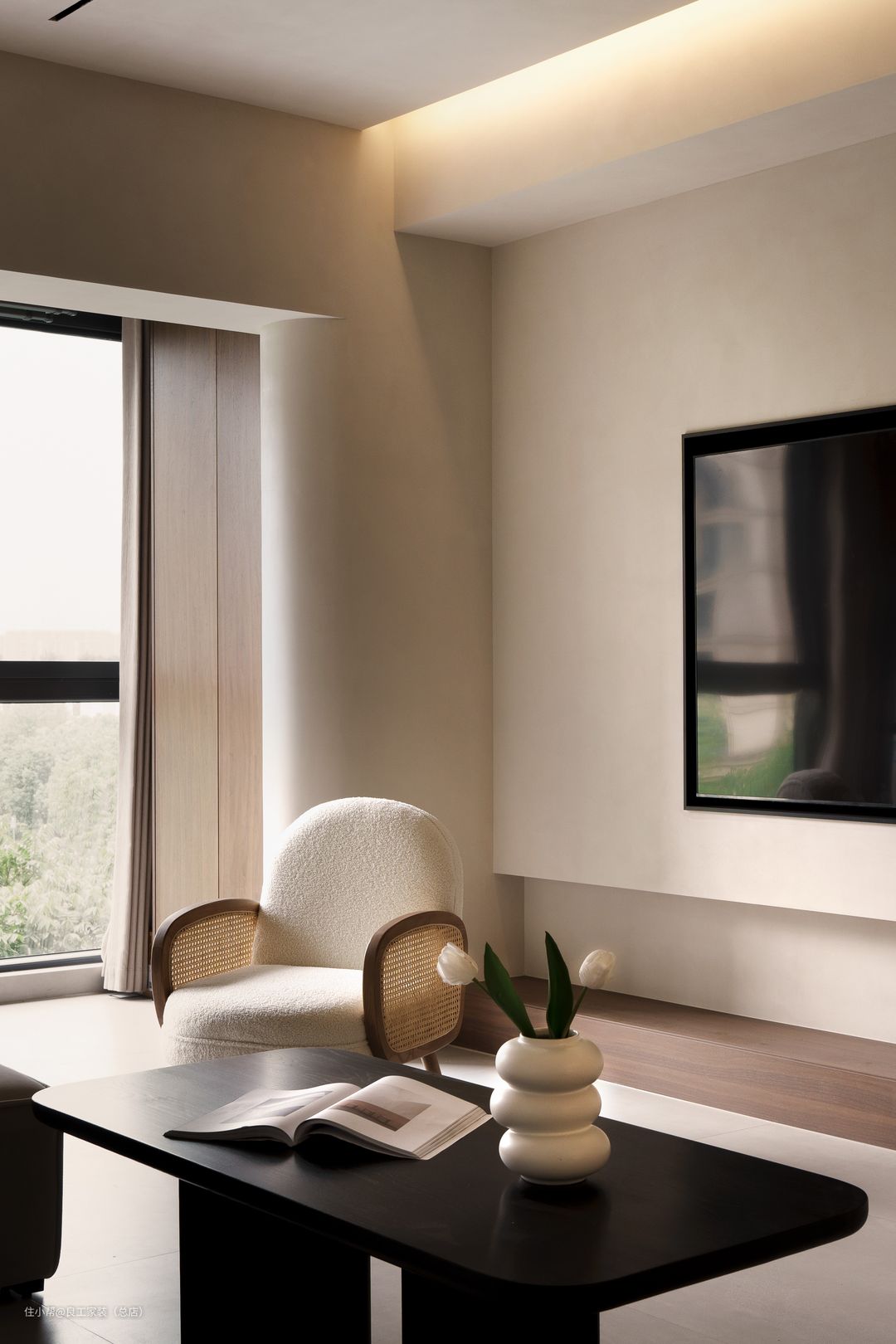 入室即可感受到以简为美的侘寂韵味,低饱和度的配色与材料的质感带来视觉与触觉的双重柔和。墙面以天然质感的涂料涂饰,营造出奶油质地浓郁的画布感以及层次丰富的肌理效果。局部应用的弧面,描绘出自然舒适的动态氛围场景。空间与家具的氛围配比以及物件之上的美感,总能让有些情绪绵延而出,感受不止。阳台打通纳入室内,带来丰富的自然光影,墙面肌理也会随之发生微妙的变化。电视背景墙不加修饰,突出侘寂的自然感,大面积留白处理让极简主义的氛围脱颖而出。