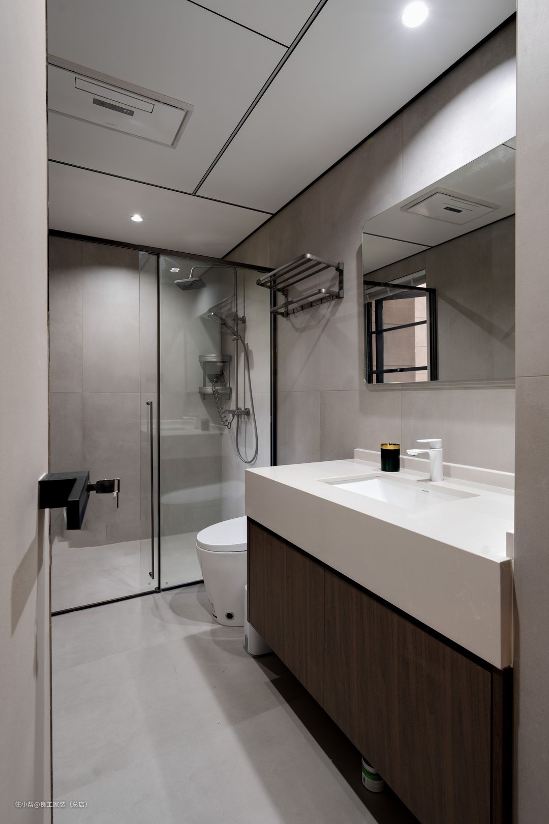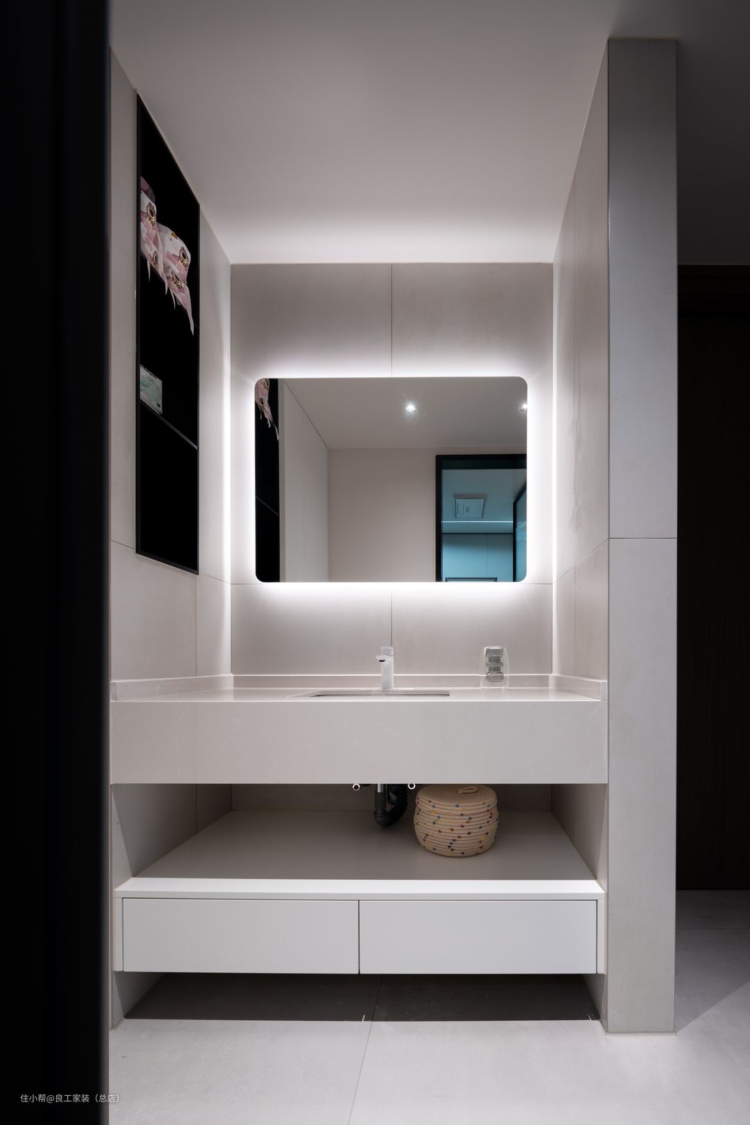 卫生间同样将侘寂风与现代风结合到极致,素雅的黑白色调、简单利落的线条,悄然勾勒出精致生活的轮廓。