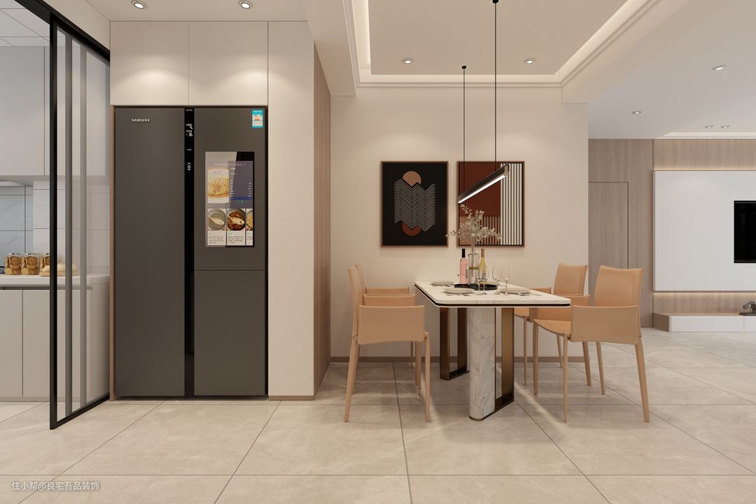 开放式客餐厅设计,冰箱做了一个内嵌式设计,隐藏起来空间更加简约。餐桌采用大理石材质,餐椅选择原木材质,两种材质相搭配,整体效果既干净简约,又有全家团聚的温馨感。