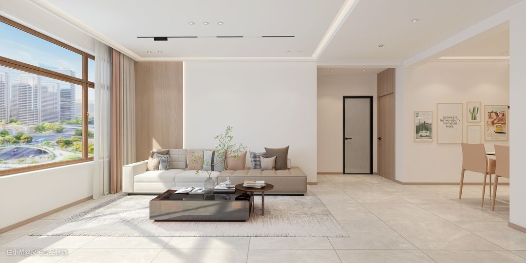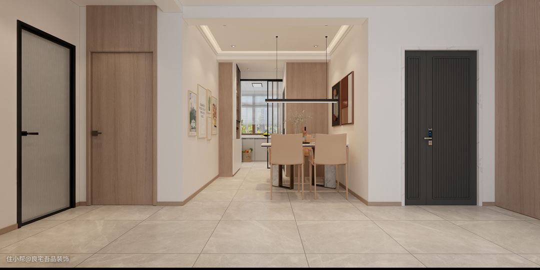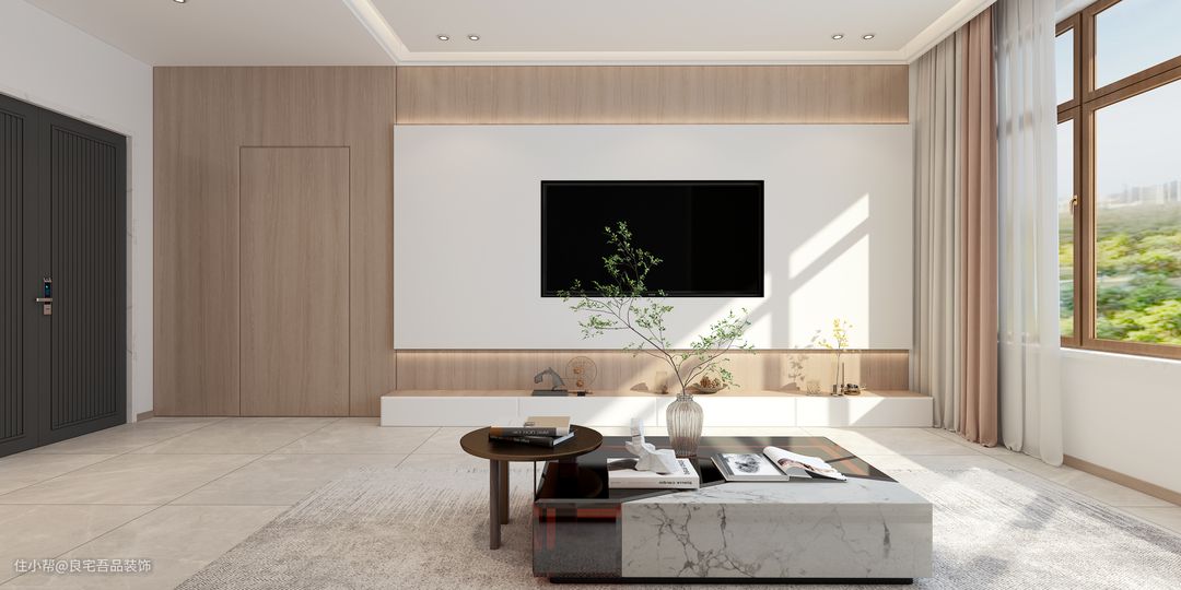 屋主想要用原木打造出简约风的家,地板选择浅色亮面砖,墙面刷白漆和原木板搭配设计。电视背景墙用原木板打底,做了一个突出的白色墙面作为电视背景墙,内嵌式设计看起来很简约。卧室做了一个隐形门设计,平整度更高。